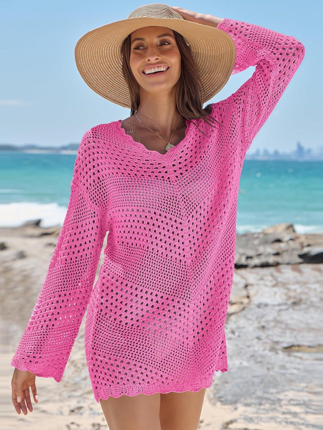 ANRABESS Swimsuit Cover Up for Women Crochet Bathing Suit Summer Swimwear V Neck Mesh Knit Dress 2026 Beach Vacation Clothes(Hot Pink)