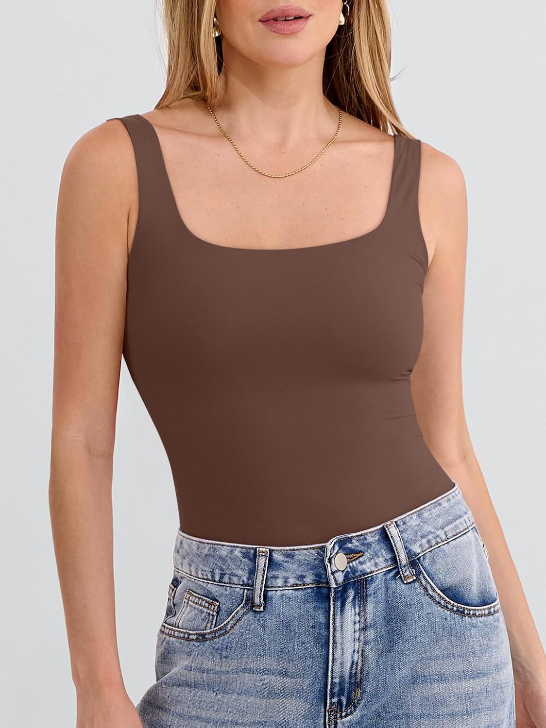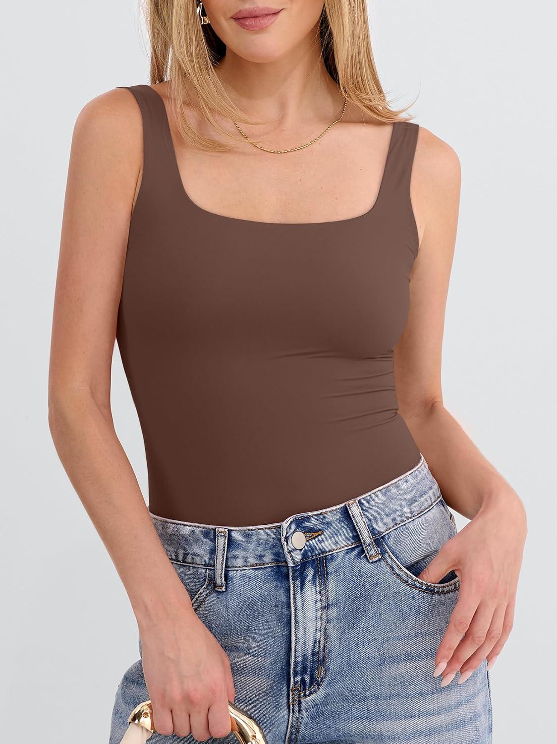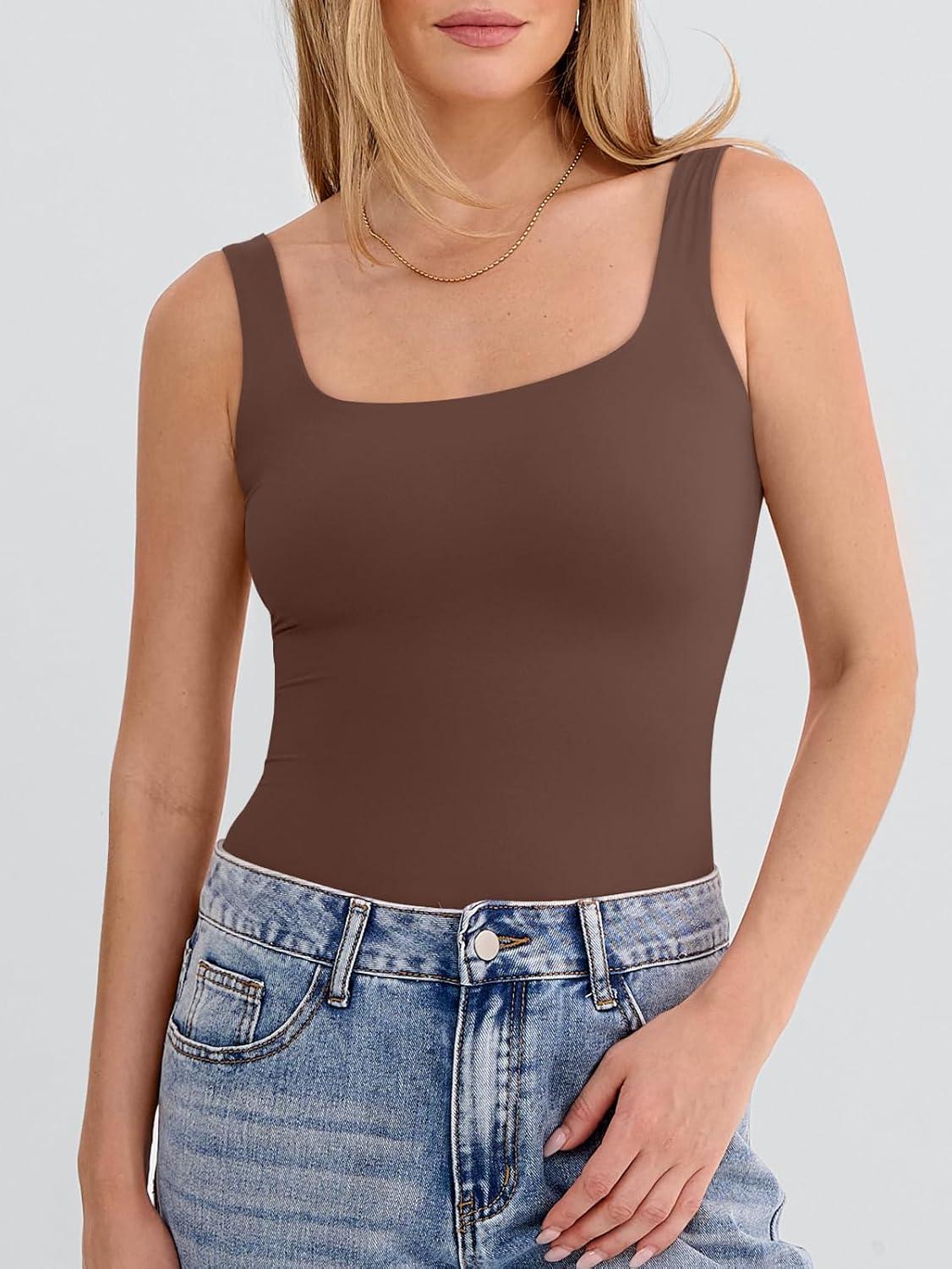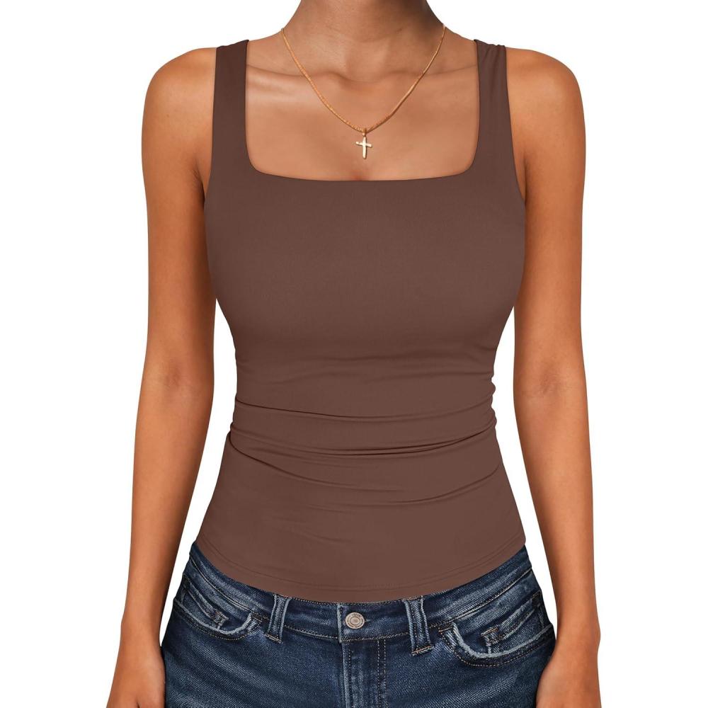 ANRABESS Tank Top for Women Summer 2026 Double Lined Sleeveless Square Neck Basic Tight Workout Tees Shirts(Deep Brown)
