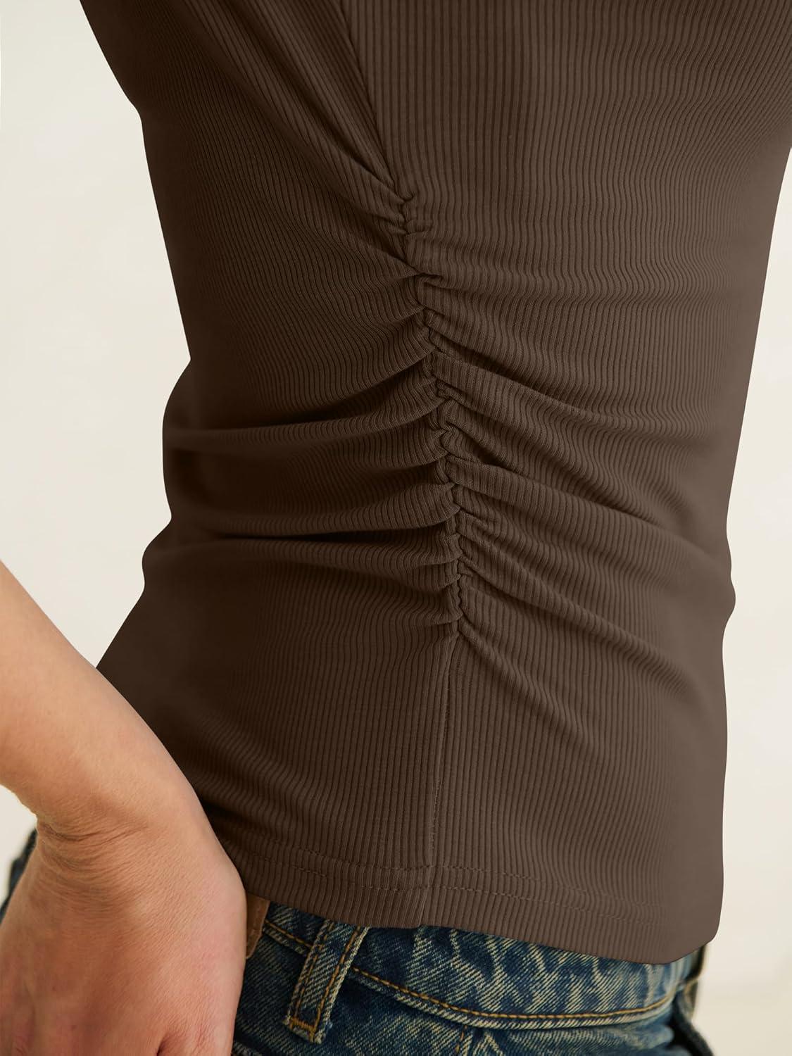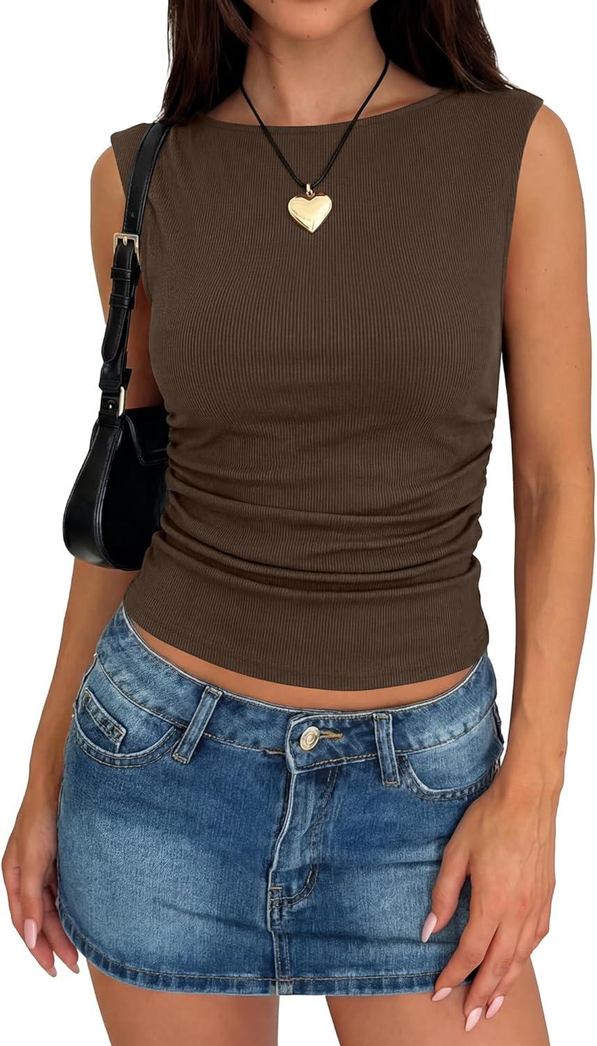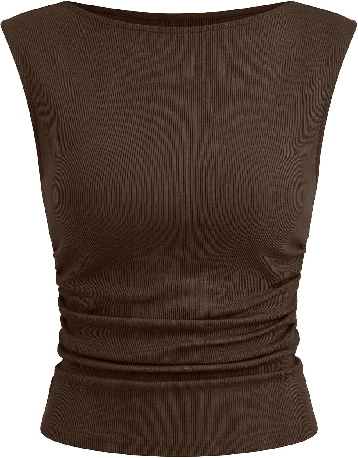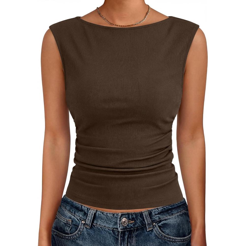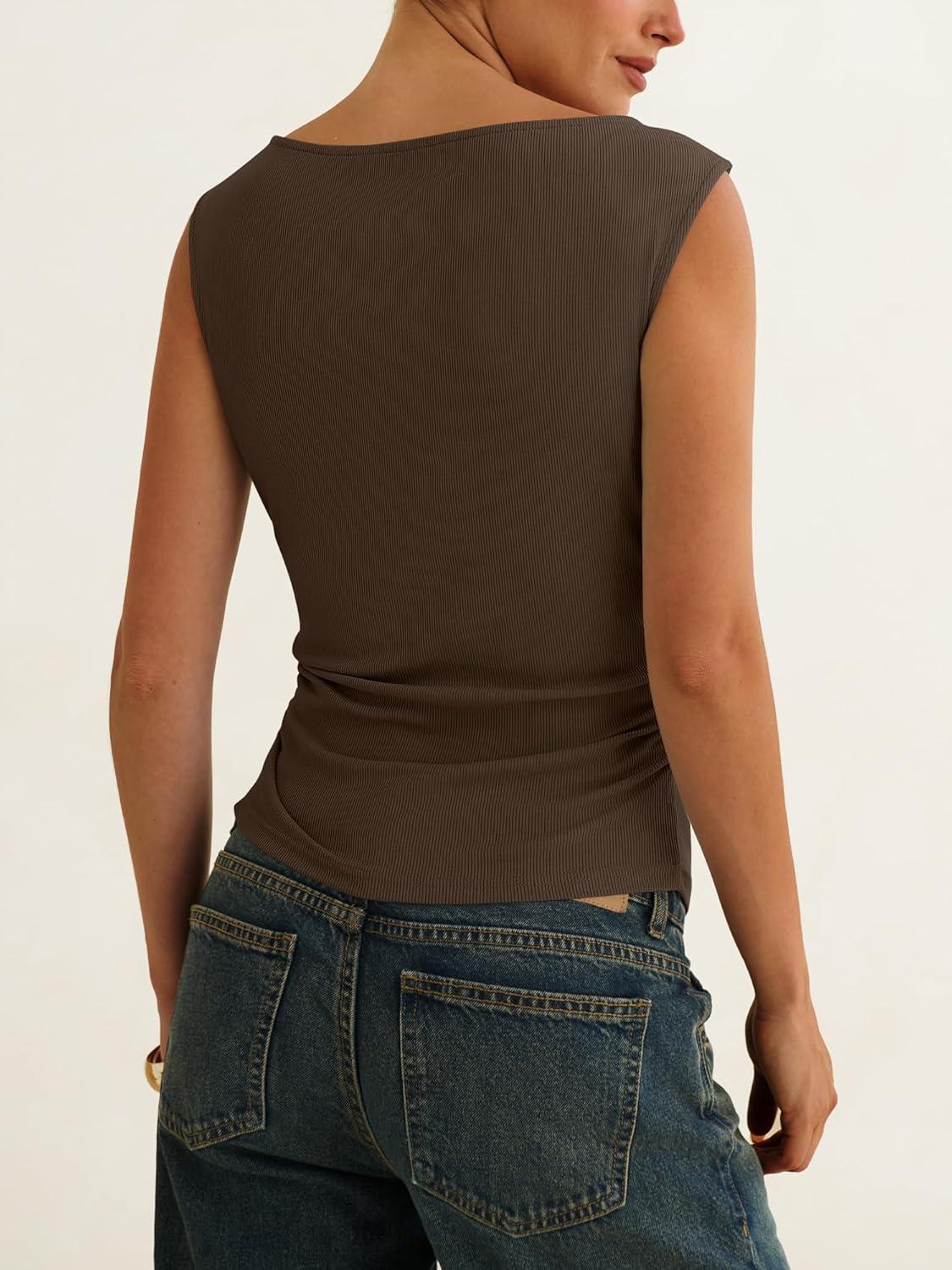 ANRABESS Tank Tops for Women 2026 Summer Going Out Crop Top Sleeveless Boat Neck Rib Tight Ruched Tee Shirts Vacation Clothes(Coffee)