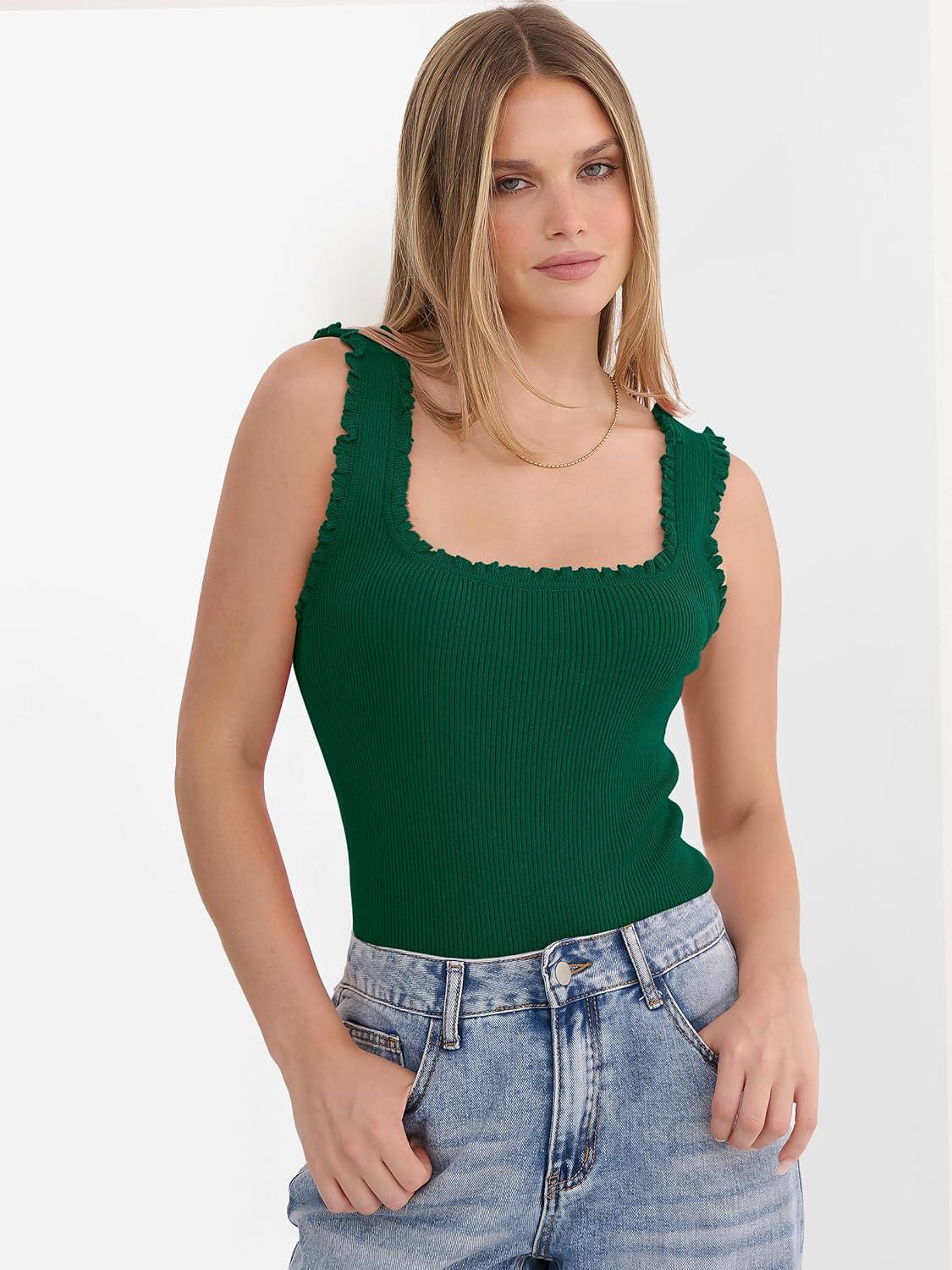 ANRABESS Tank Tops for Women Summer 2026 Square Neck Ruffle Straps Ribbed Knit Slim Fit Casual Cute Sleeveless Sweater Tank(Green)