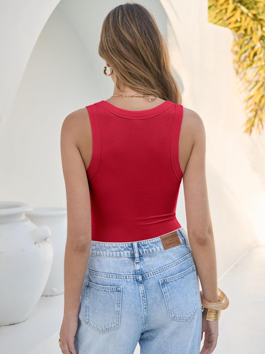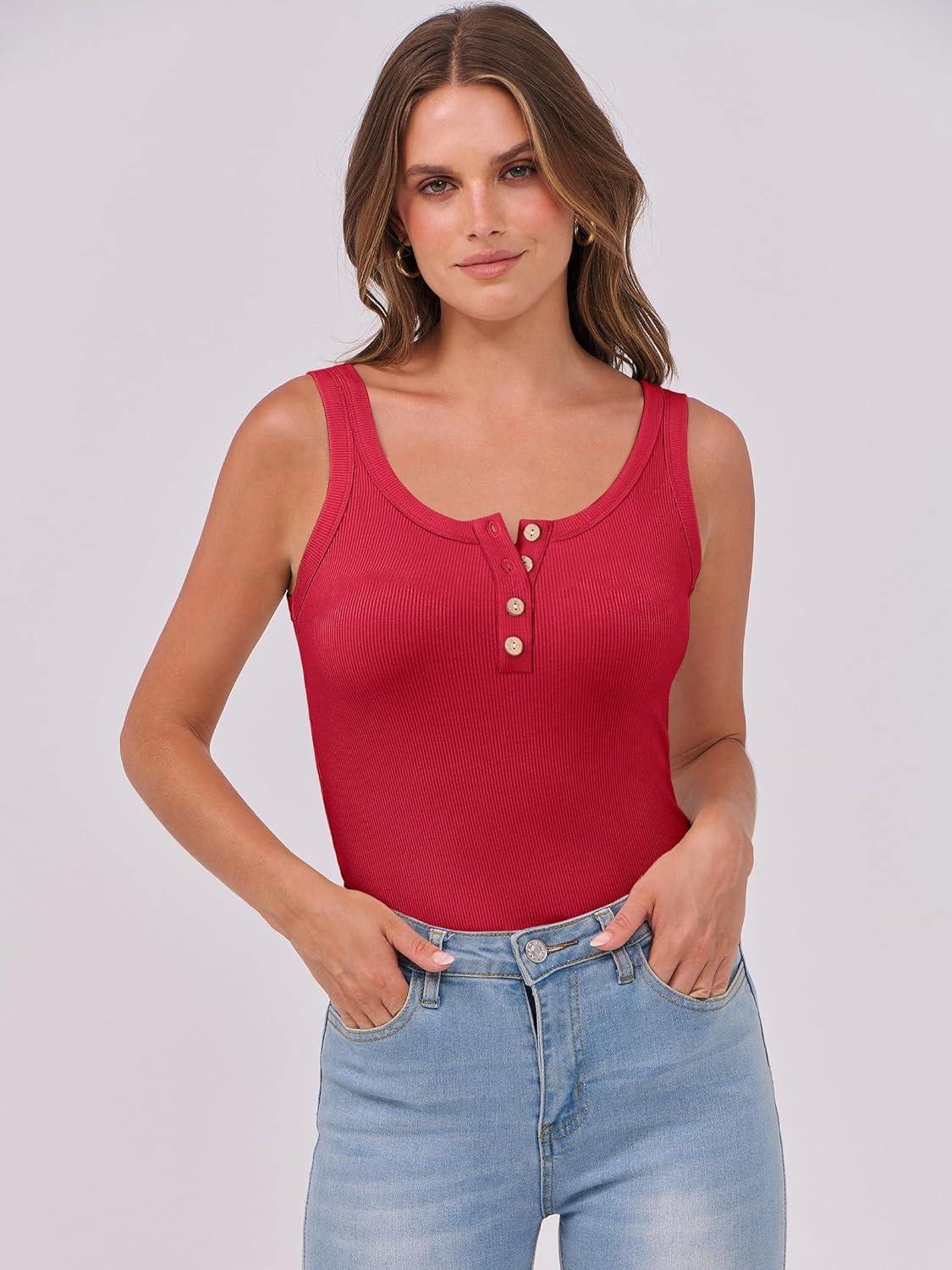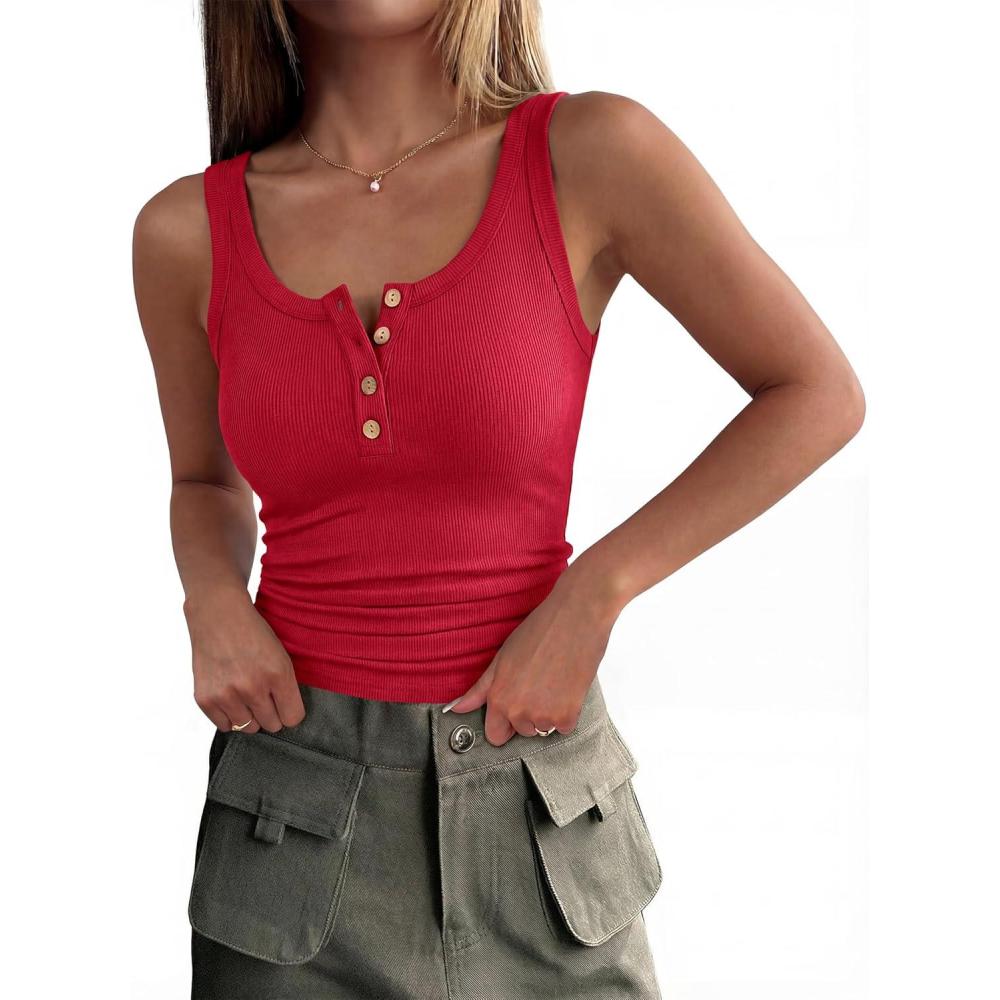 ANRABESS Tank Tops for Women Summer Basic Ribbed Henley Slim Fitted Sleeveless Cami Shirts Button Up Workout Casual Outfits(Red)