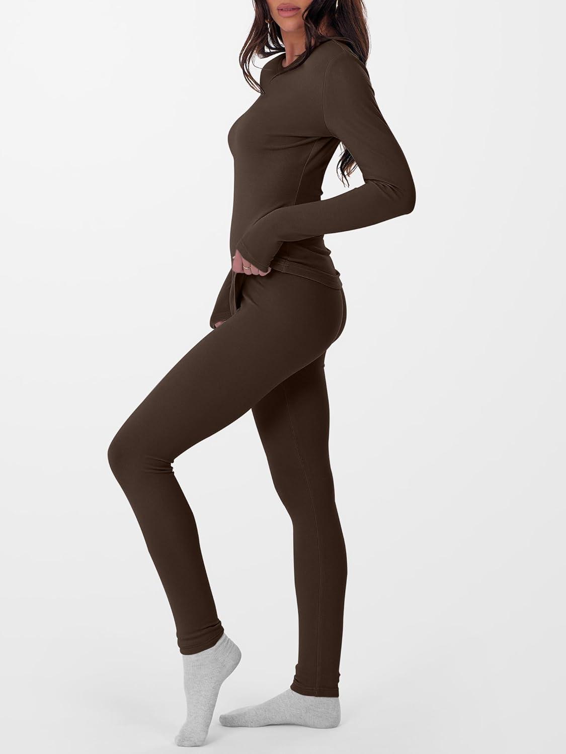ANRABESS Thermal Underwear for Women Long Johns Fleece Lined Base Layer Pajama Set Cold Weather Top Bottom Winter Clothing(Dark Brown)