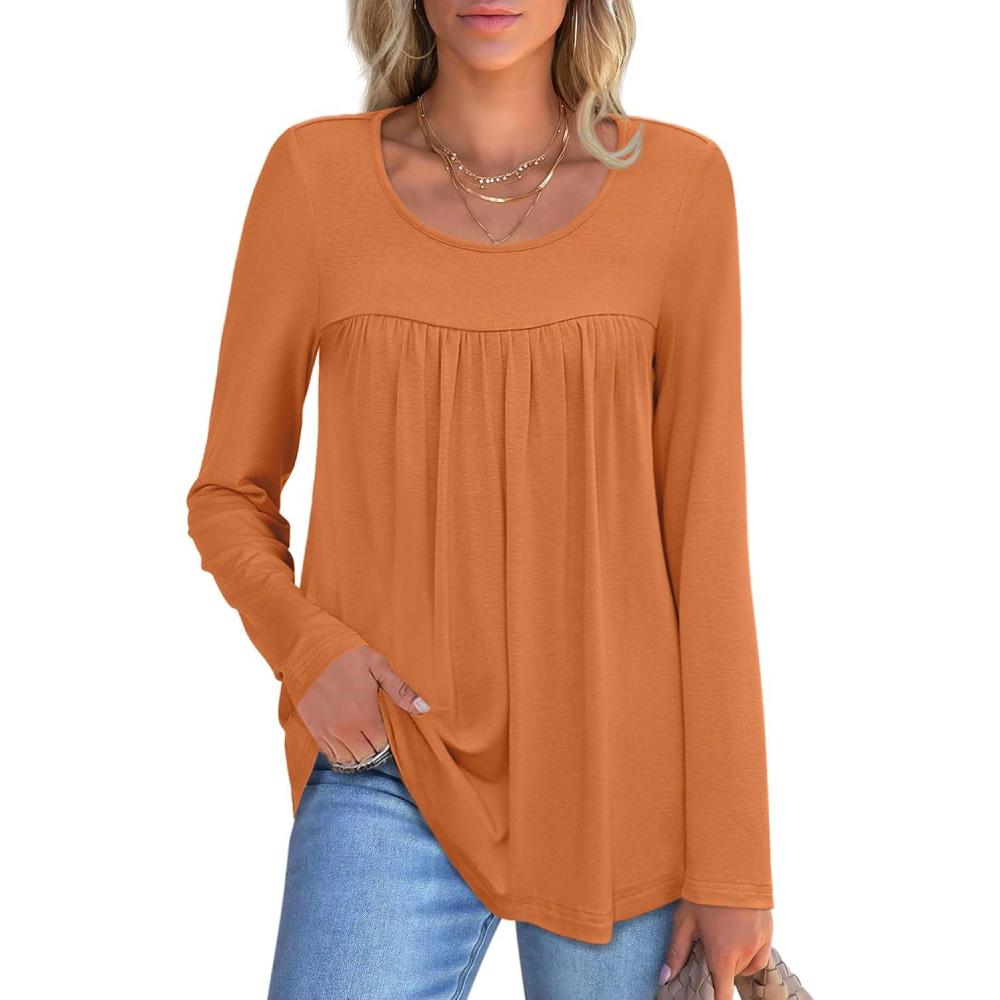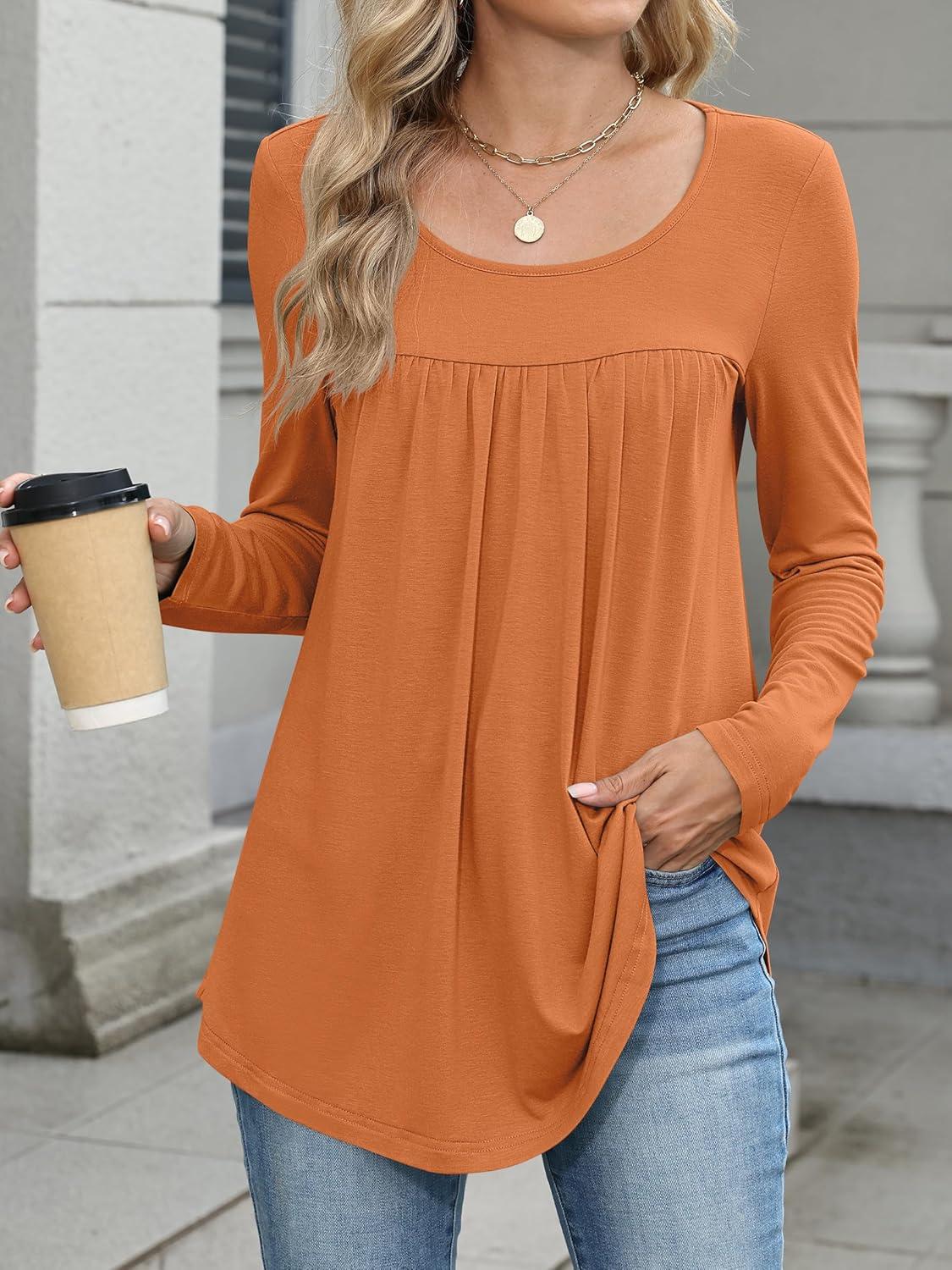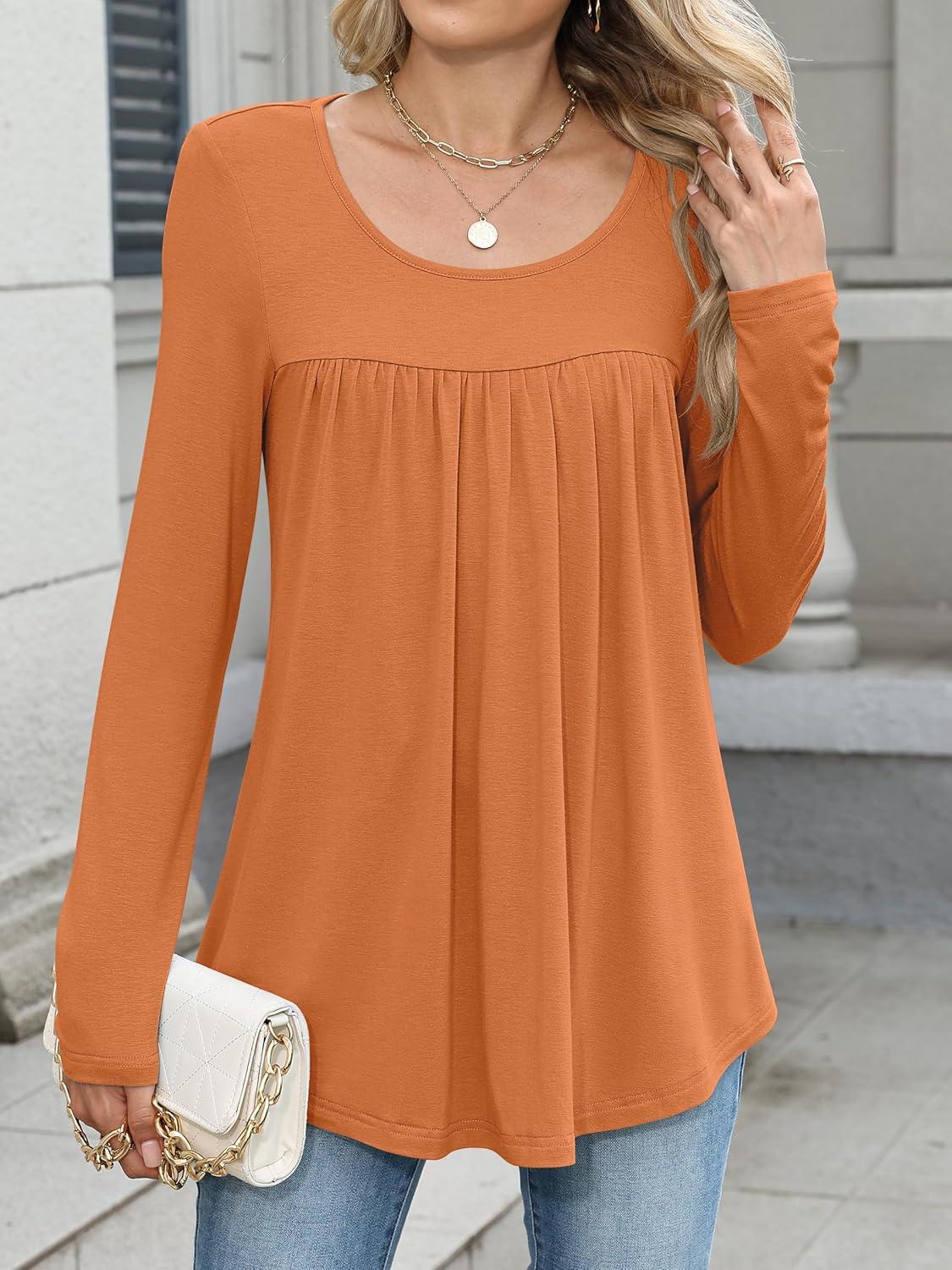 ANRABESS Tunic Tops for Women Long Sleeve Babydoll Cute Shirts Loose Flowy Pleated Tummy Hide Blouses 2025 Fall Outfits M-3XL(Orange)