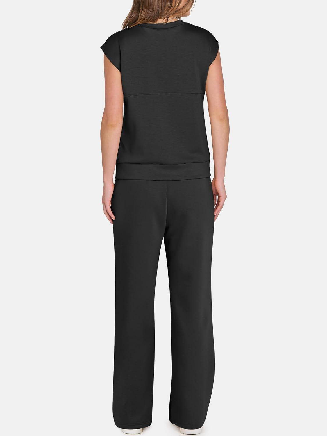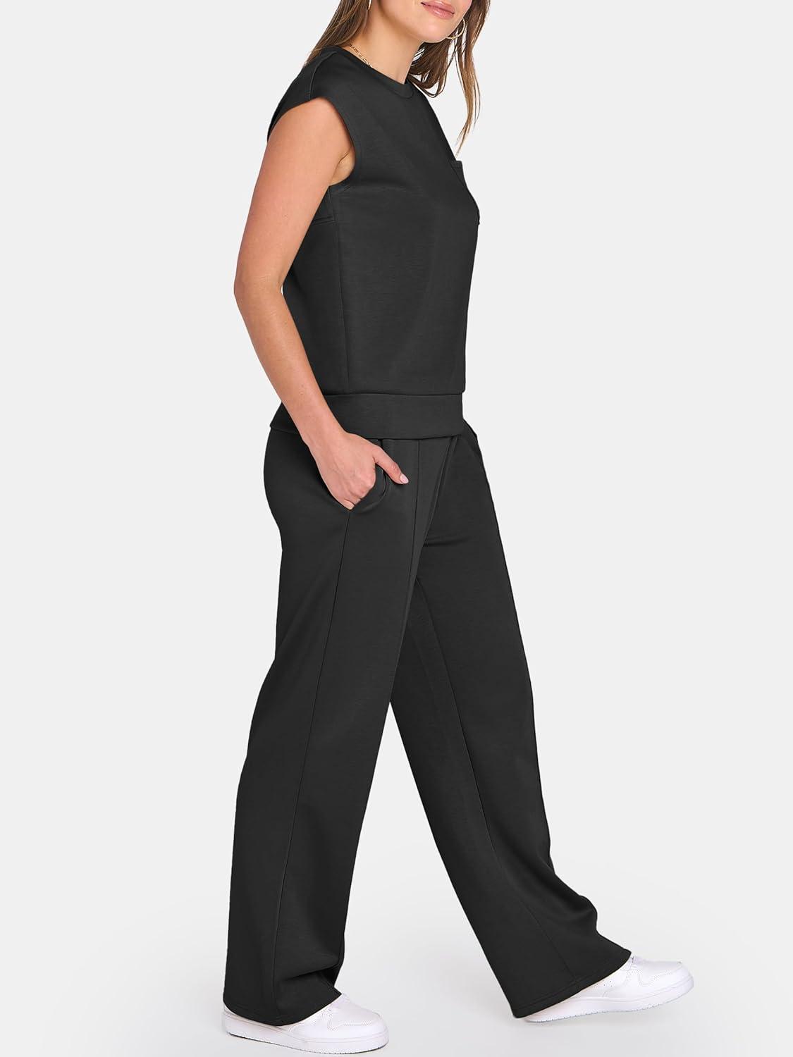 ANRABESS Two Piece Sets for Women 2026 Summer Travel Vacation Outfits Sleeveless Lounge Set Matching Wide Leg Pants Sweatsuit(Black)
