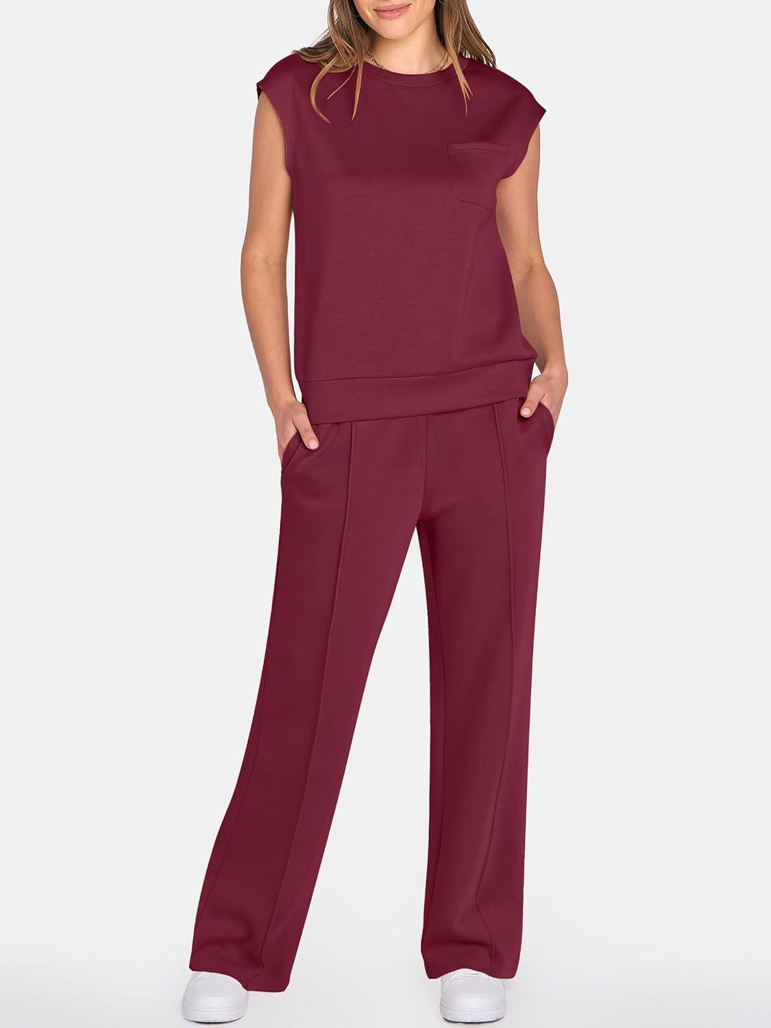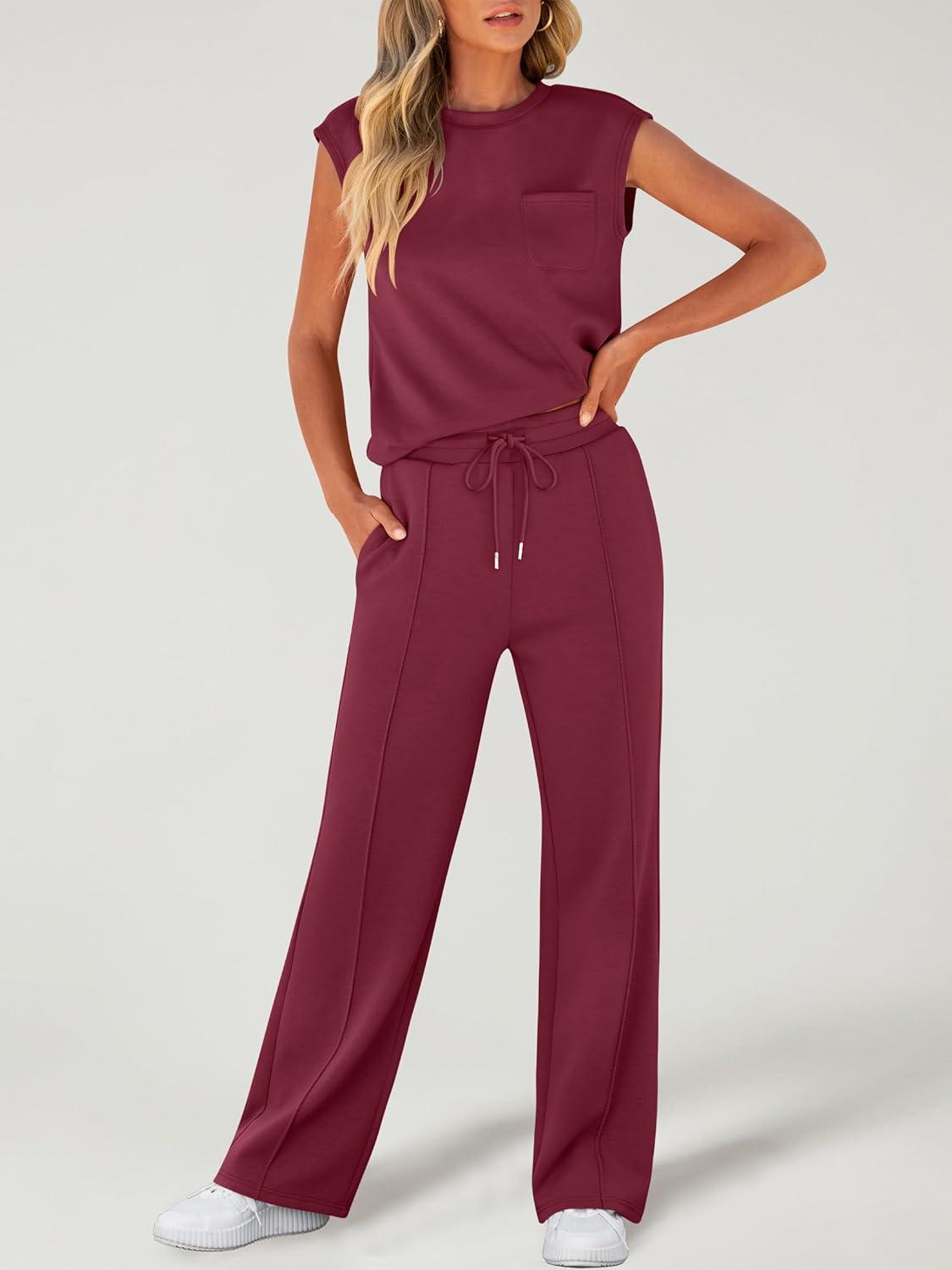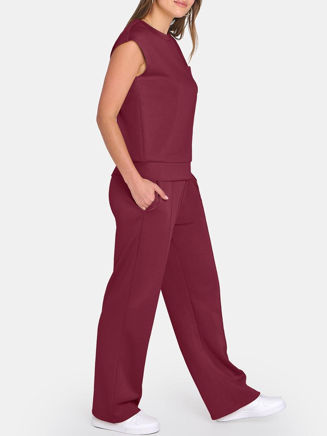 ANRABESS Two Piece Sets for Women Summer Sleeveless Sweatsuits Wide Leg Casual Lounge Set Matching Vacation Travel Outfits(Burgundy)