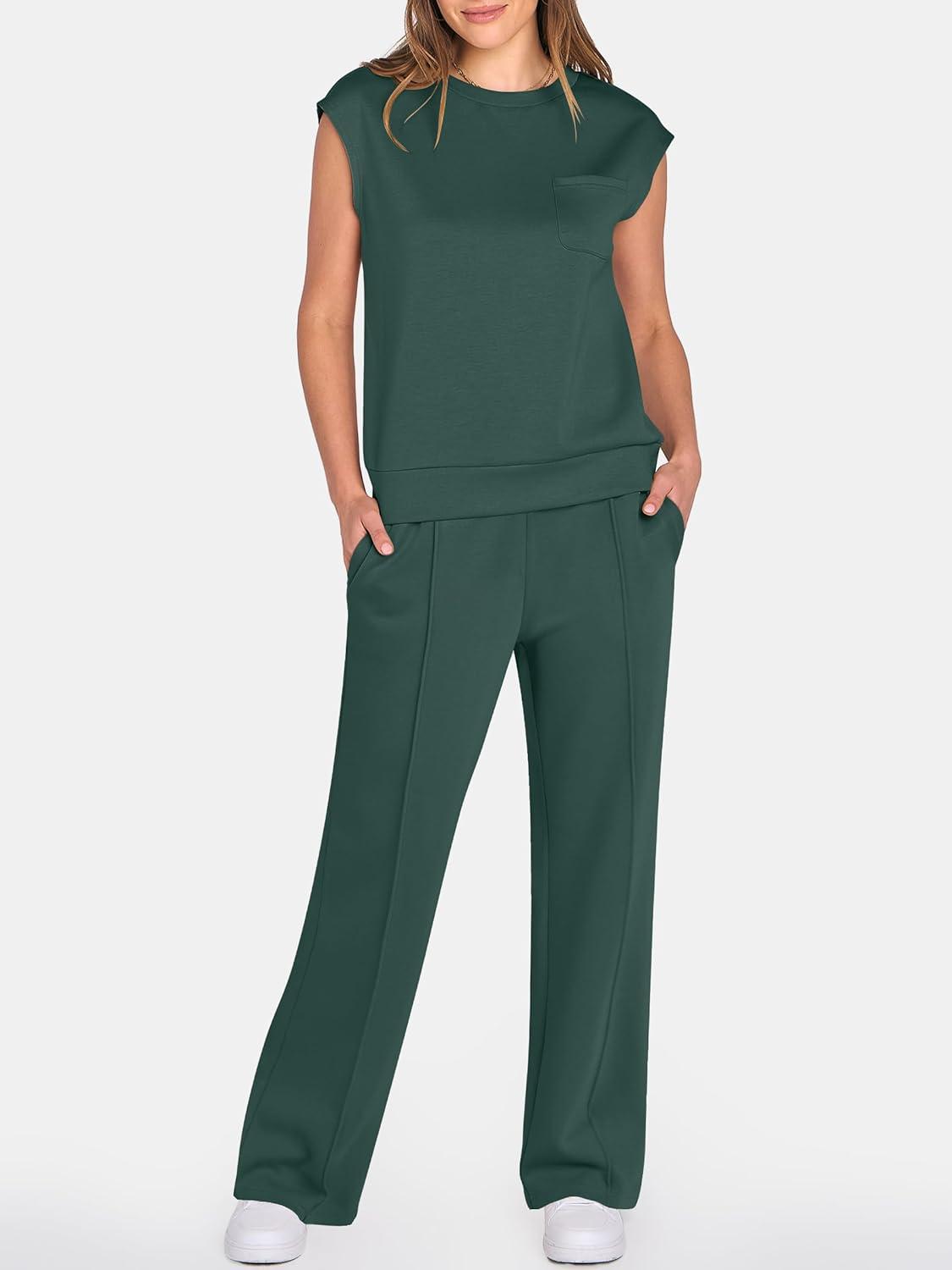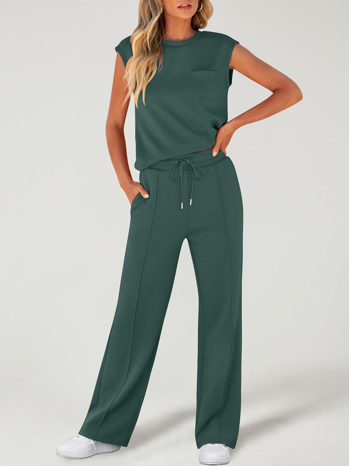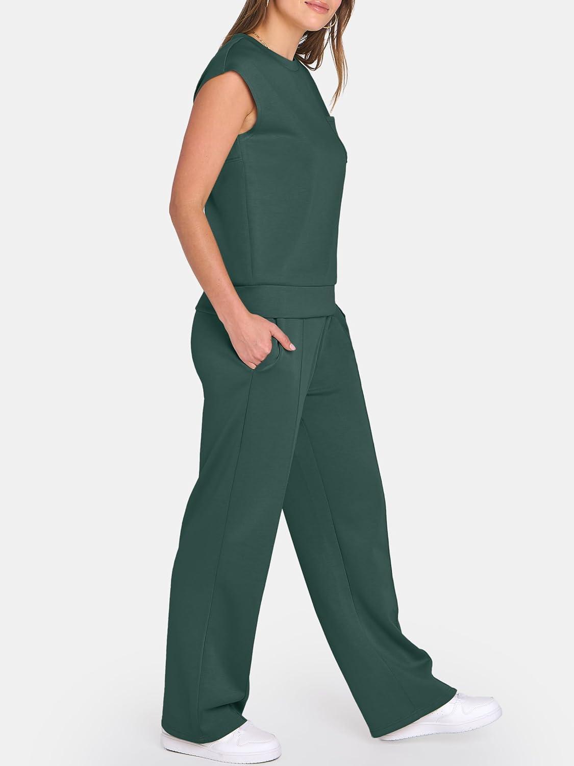 ANRABESS Two Piece Sets for Women Summer Sleeveless Sweatsuits Wide Leg Casual Lounge Set Matching Vacation Travel Outfits(Deep Green)
