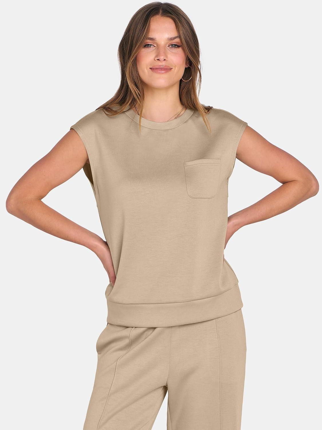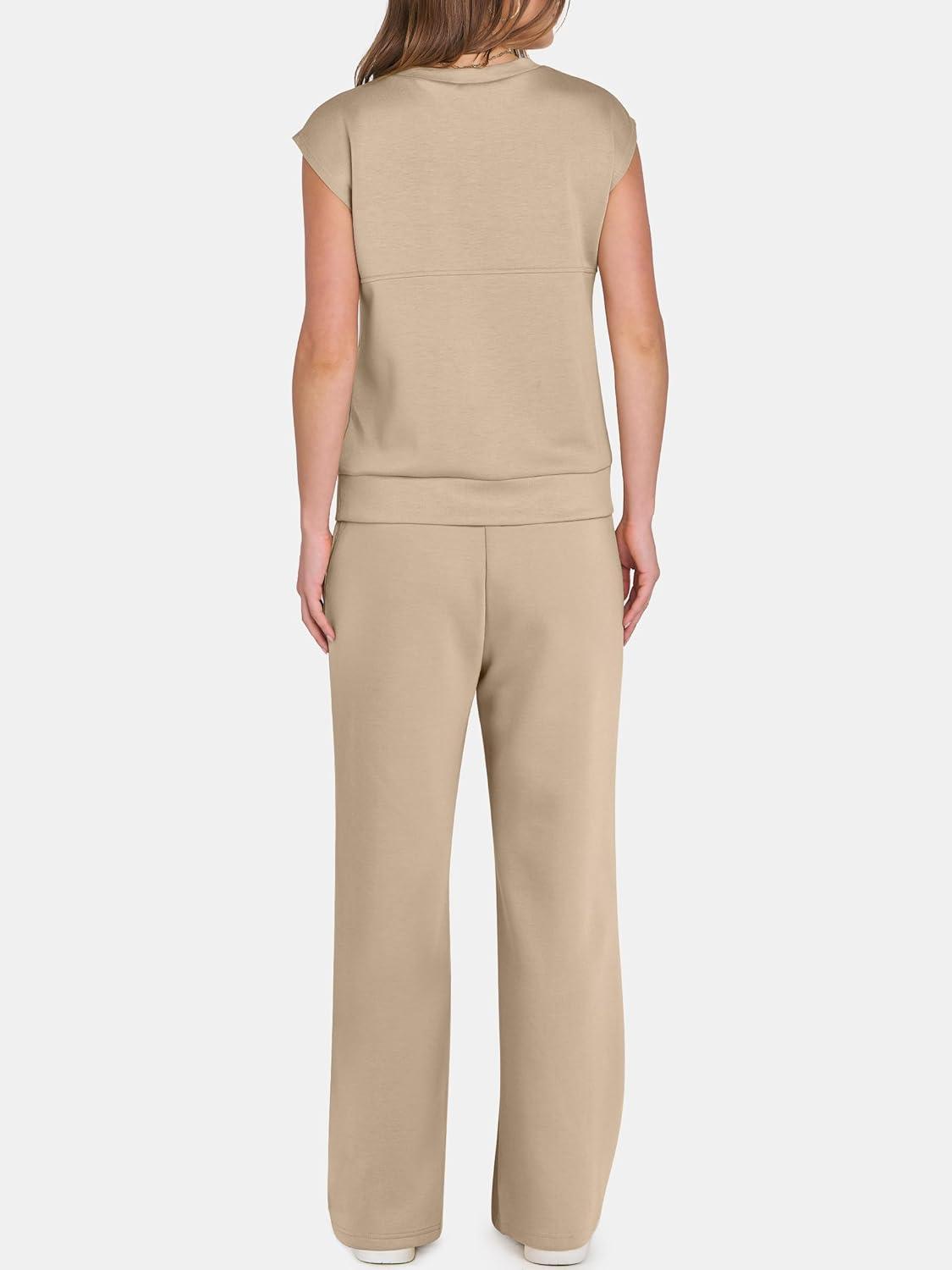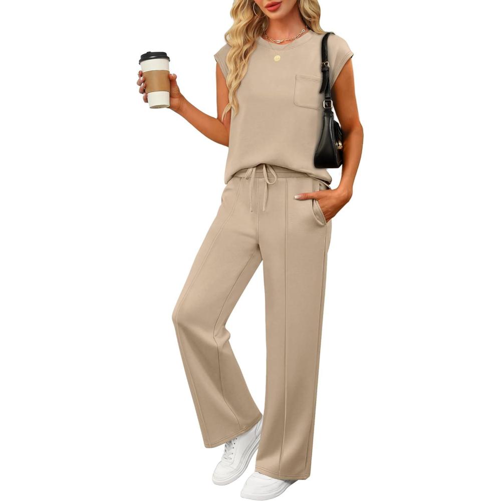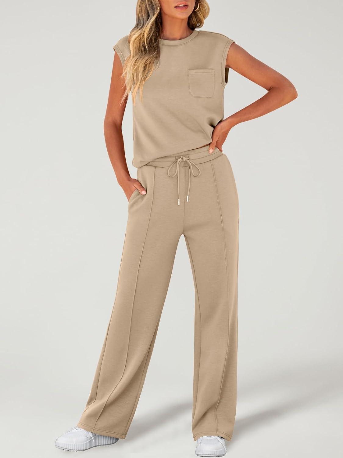 ANRABESS Two Piece Sets for Women Summer Sleeveless Sweatsuits Wide Leg Casual Lounge Set Matching Vacation Travel Outfits(Khaki)