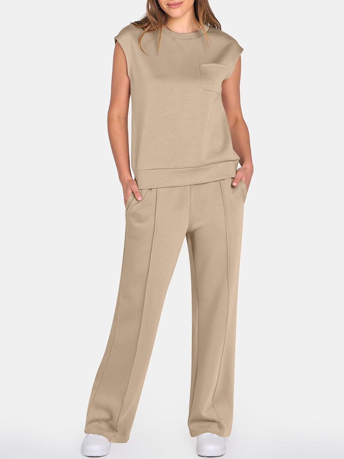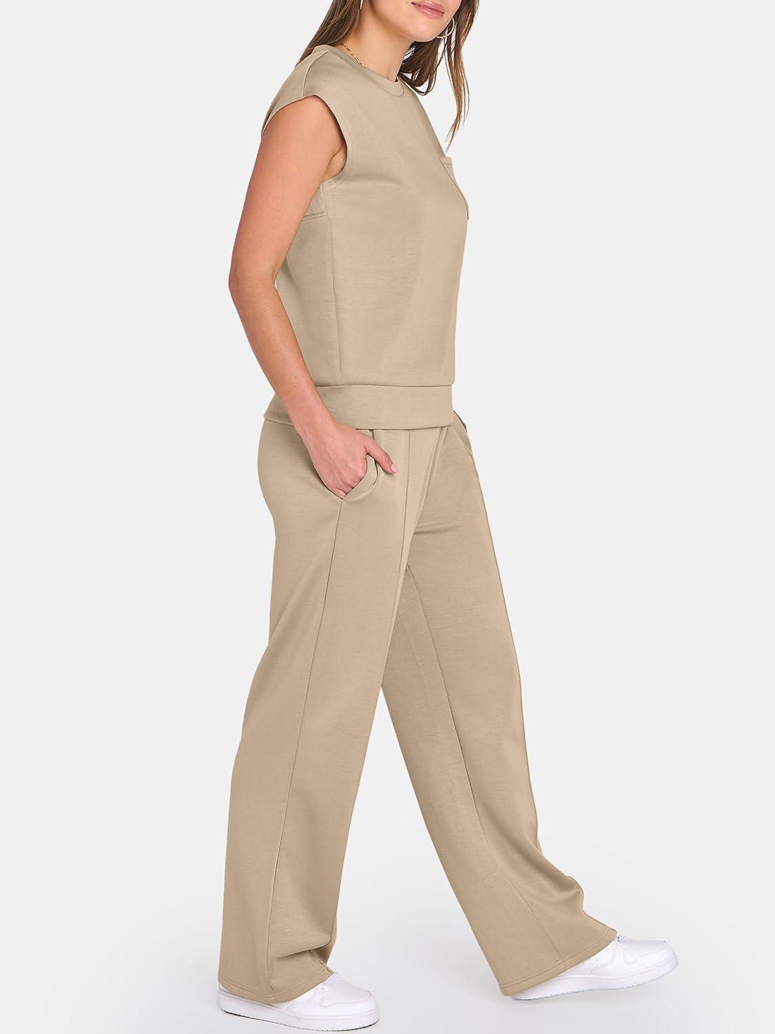 ANRABESS Two Piece Sets for Women Summer Sleeveless Sweatsuits Wide Leg Casual Lounge Set Matching Vacation Travel Outfits(Light Khaki)