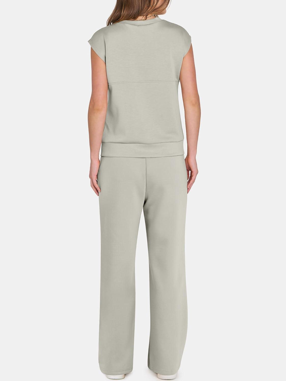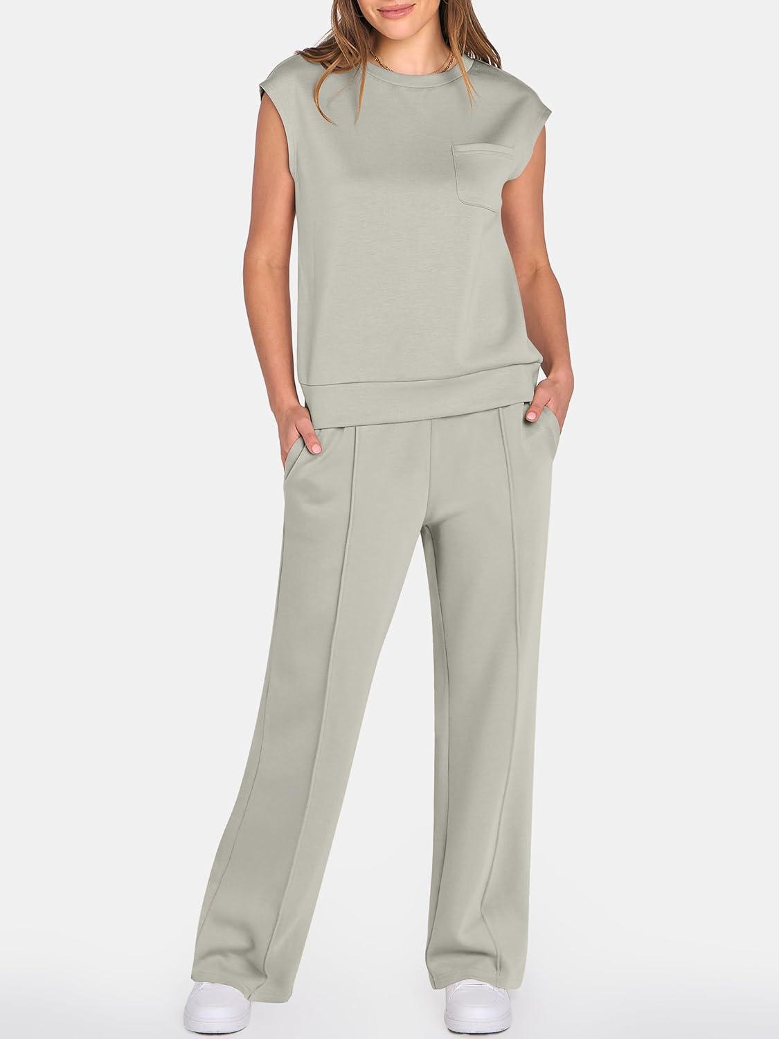 ANRABESS Two Piece Sets for Women Summer Sleeveless Sweatsuits Wide Leg Casual Lounge Set Matching Vacation Travel Outfits(Light Khaki)