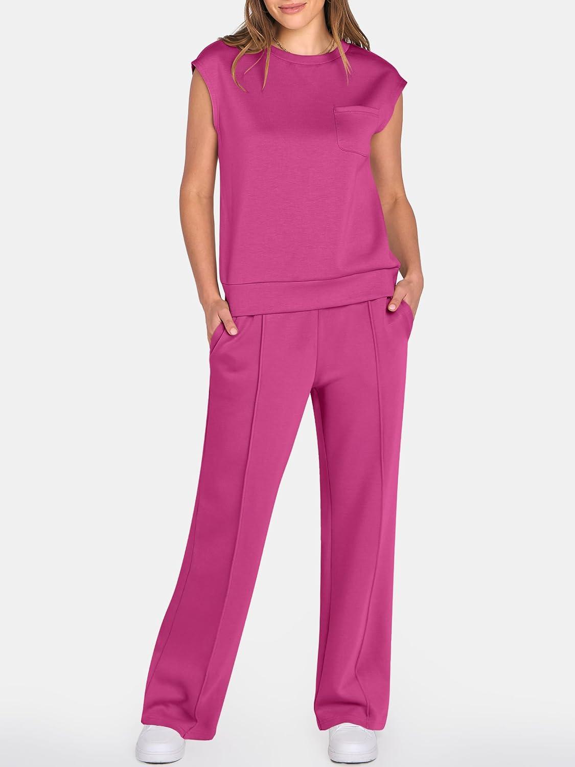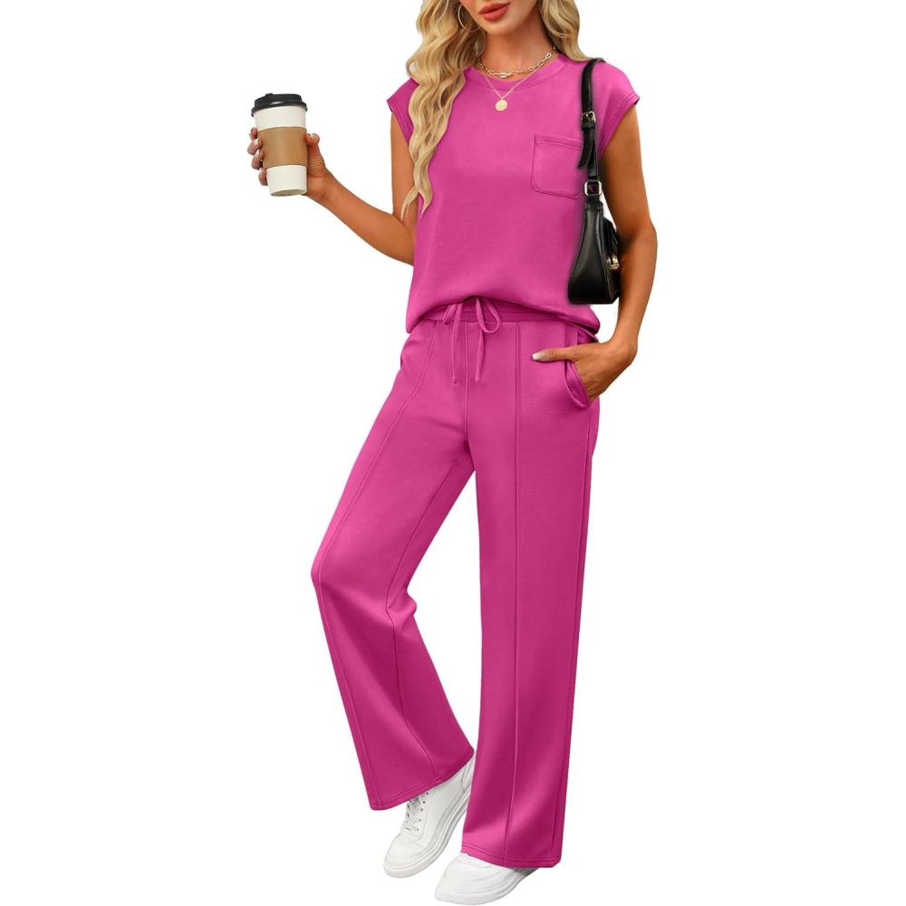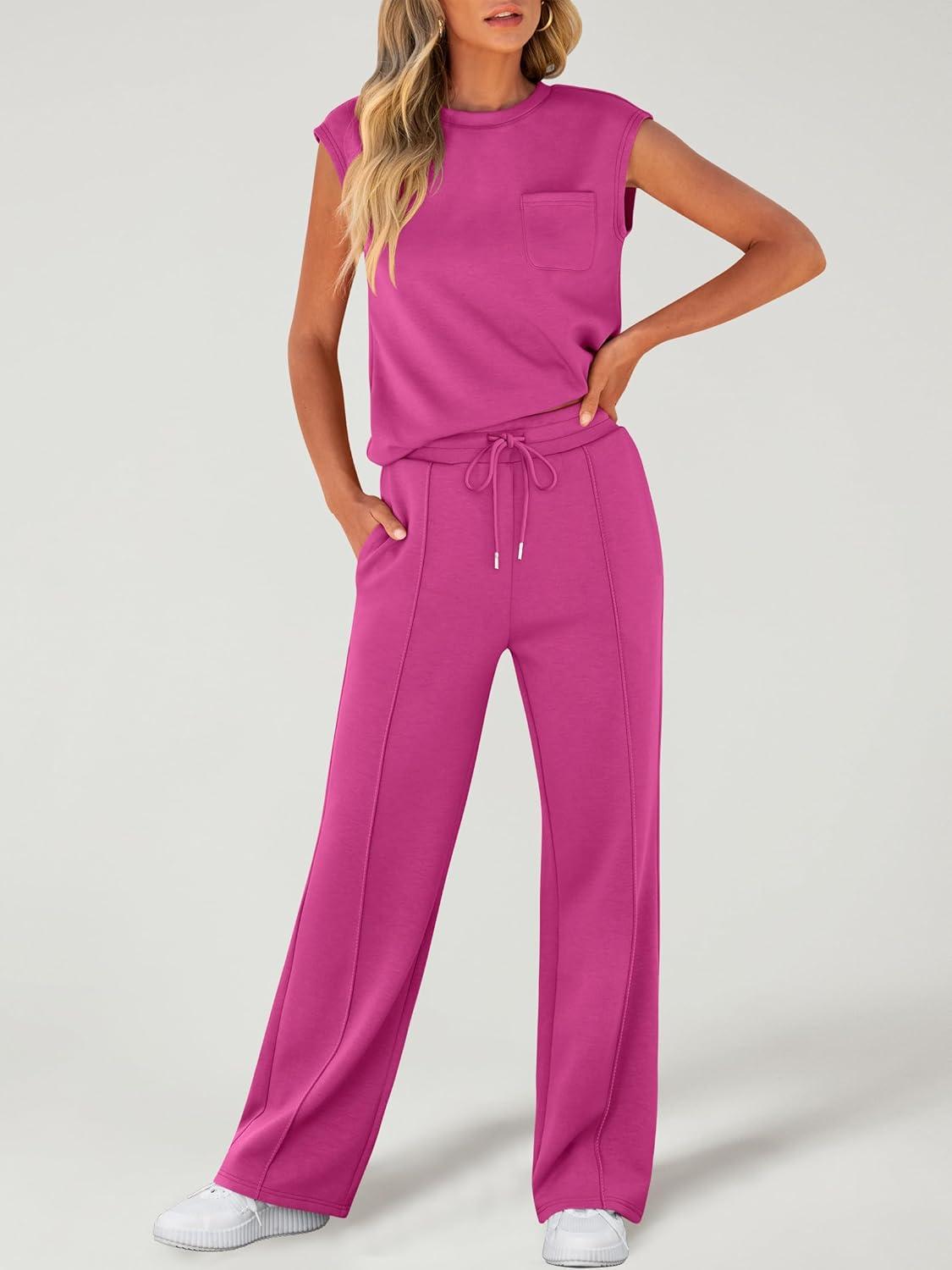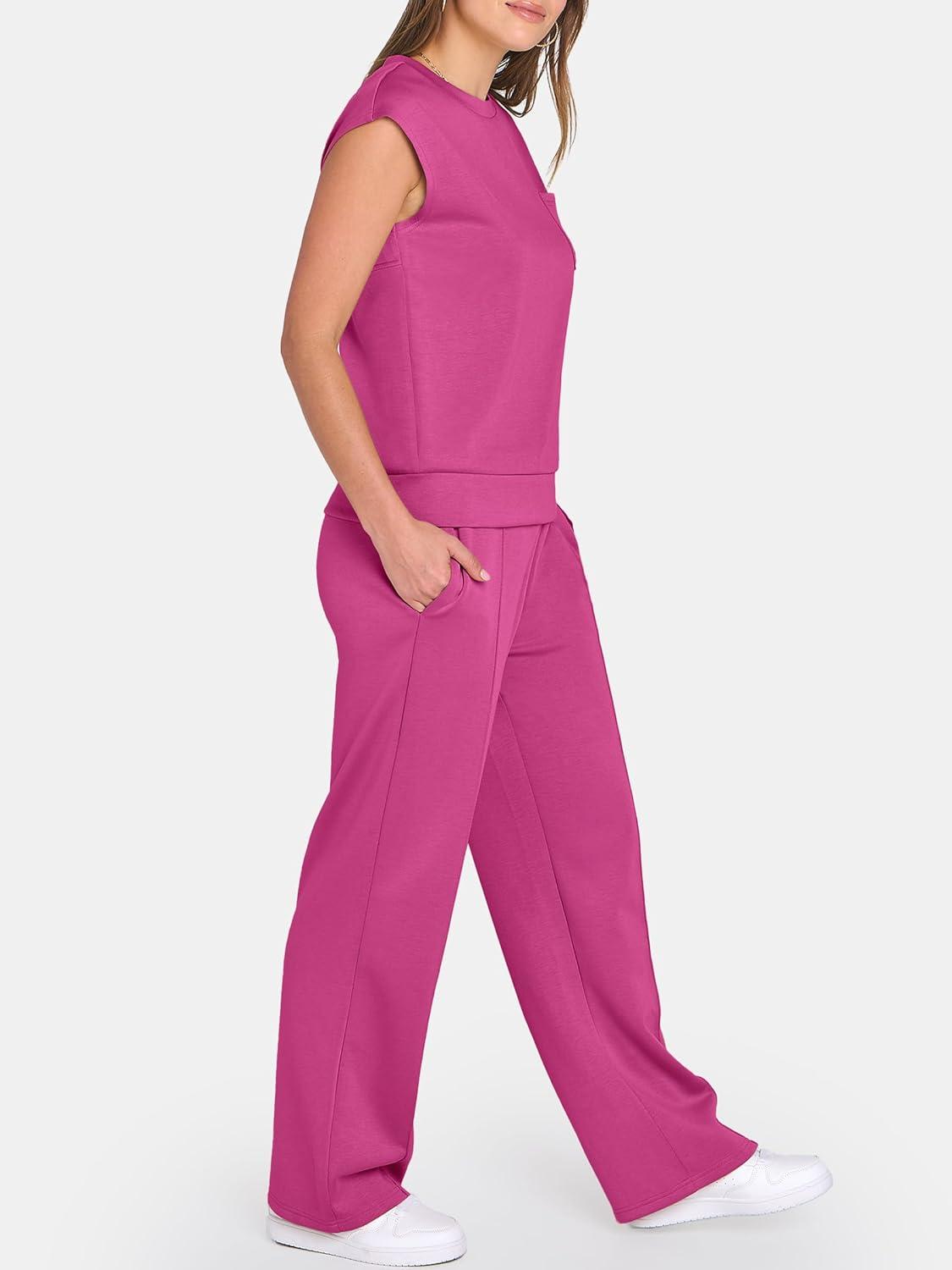 ANRABESS Two Piece Sets for Women Summer Sleeveless Sweatsuits Wide Leg Casual Lounge Set Matching Vacation Travel Outfits(Rose)