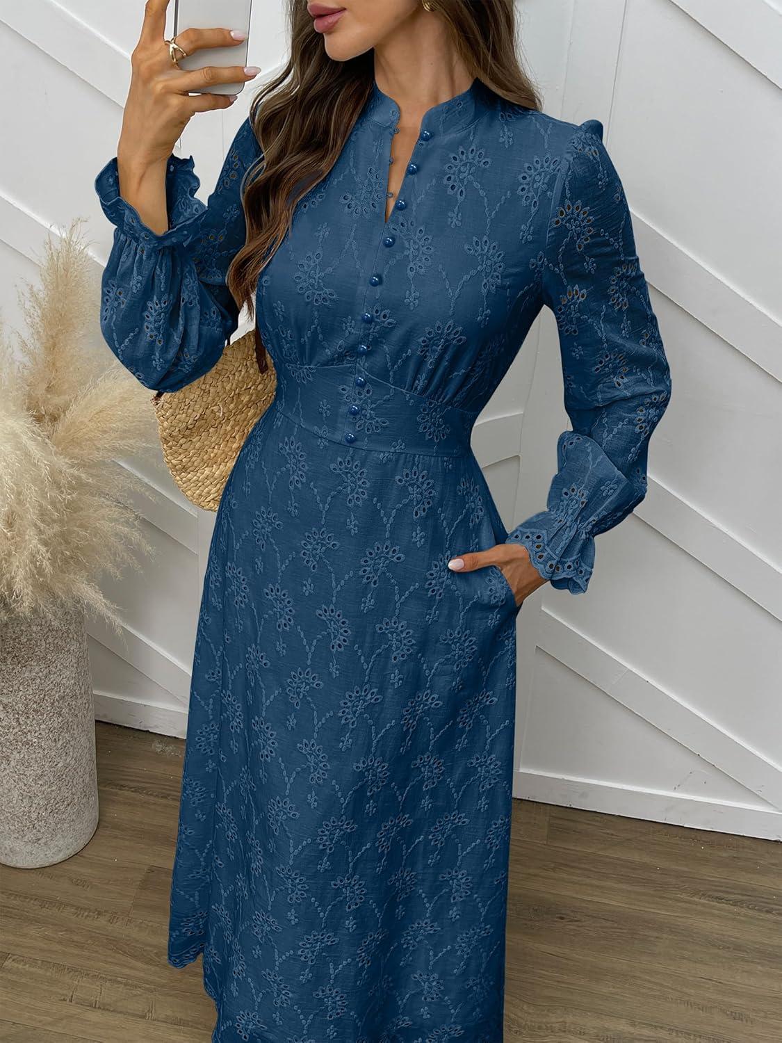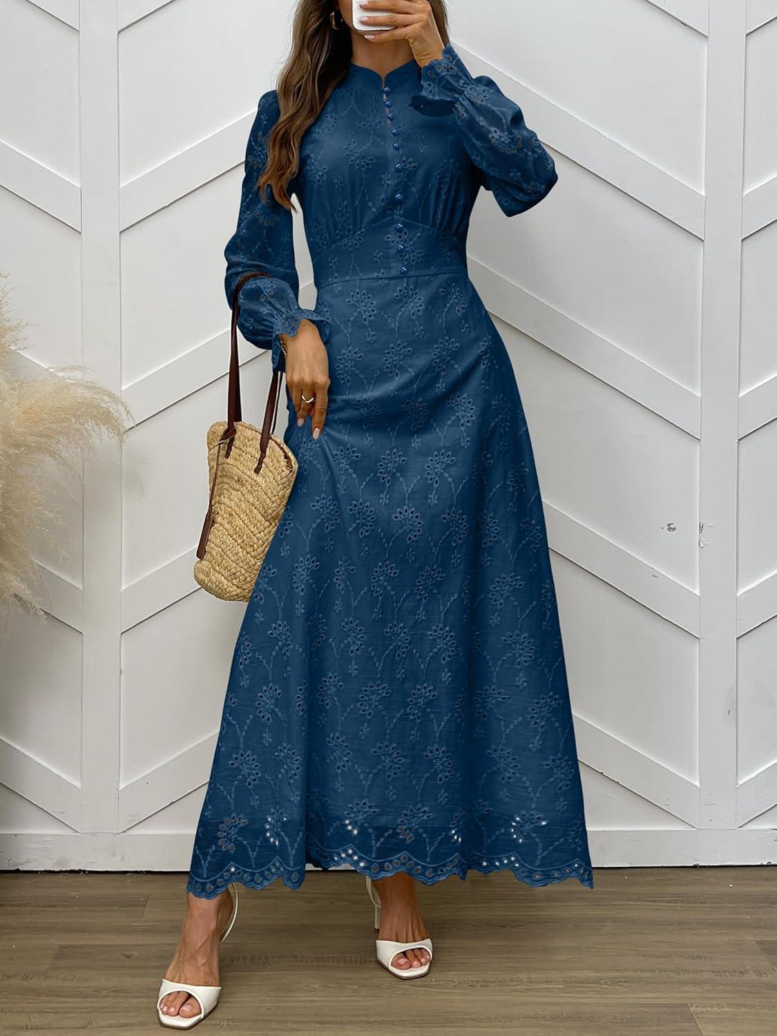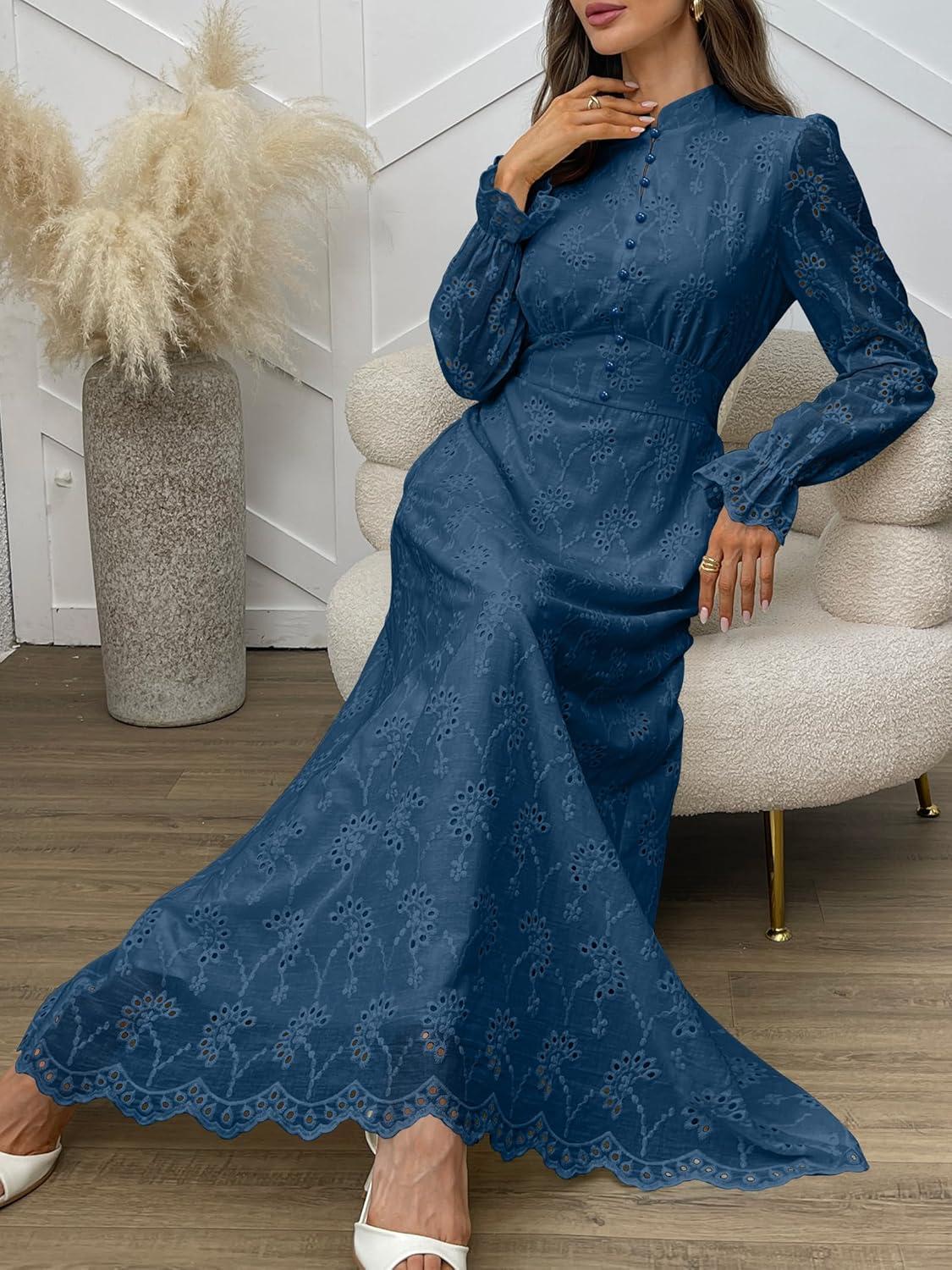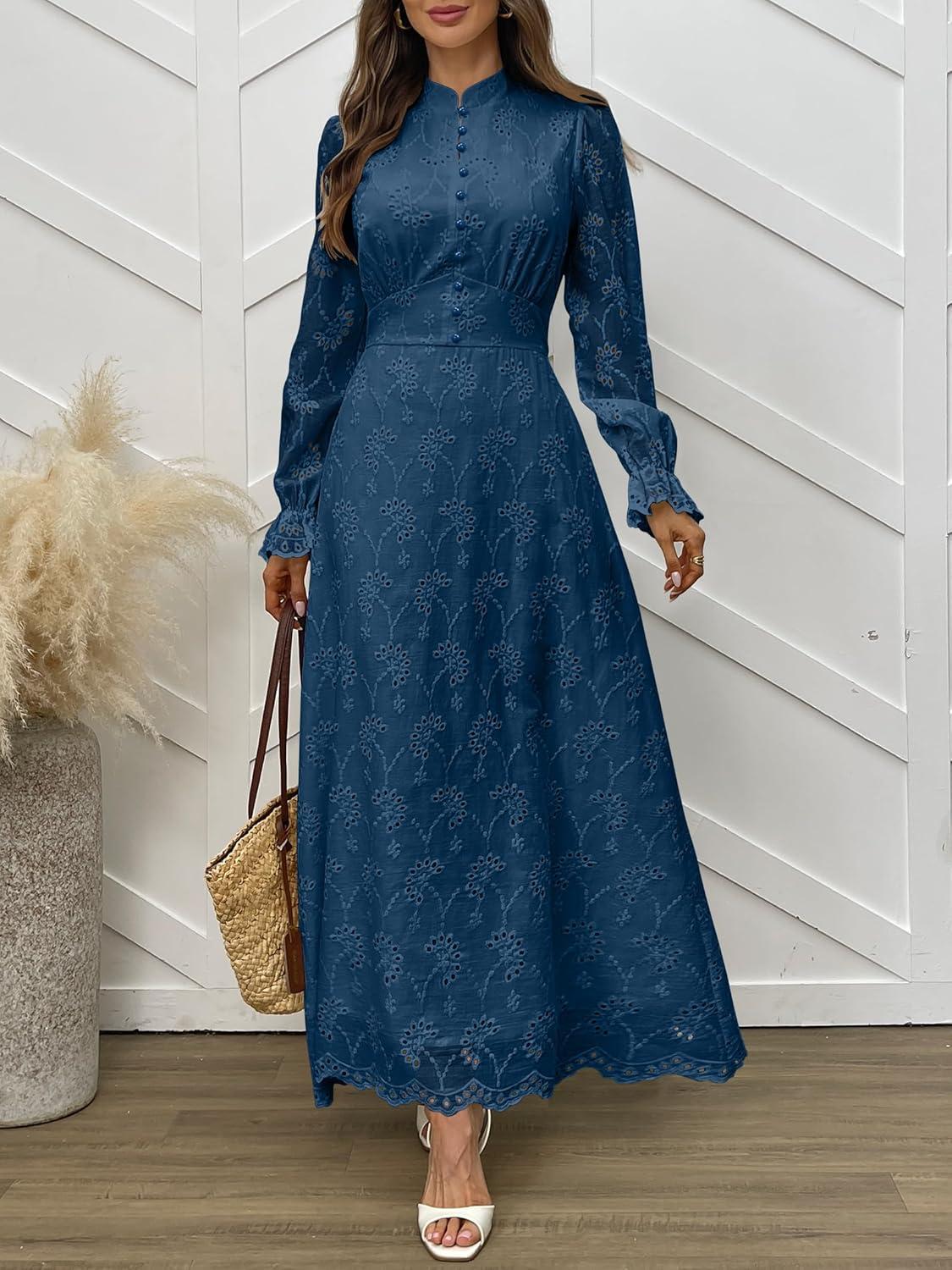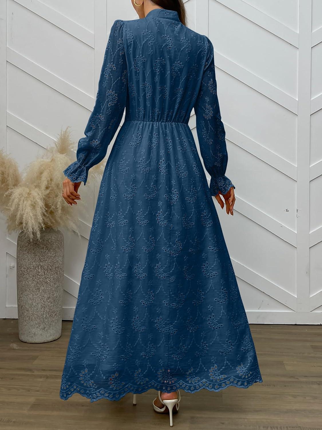 ANRABESS Wedding Guest Dresses for Women 2025 Fall Formal Long Sleeve Eyelet High Neck Elegant Classic Maxi Dress Pockets(Deep Blue)