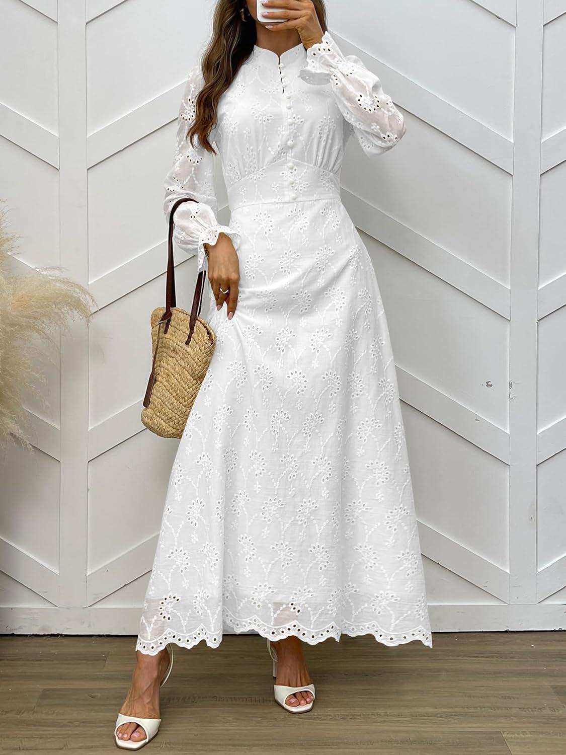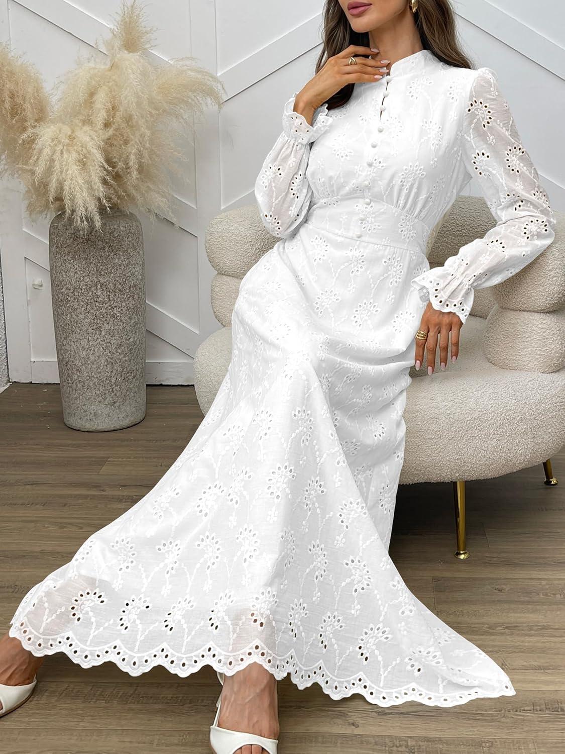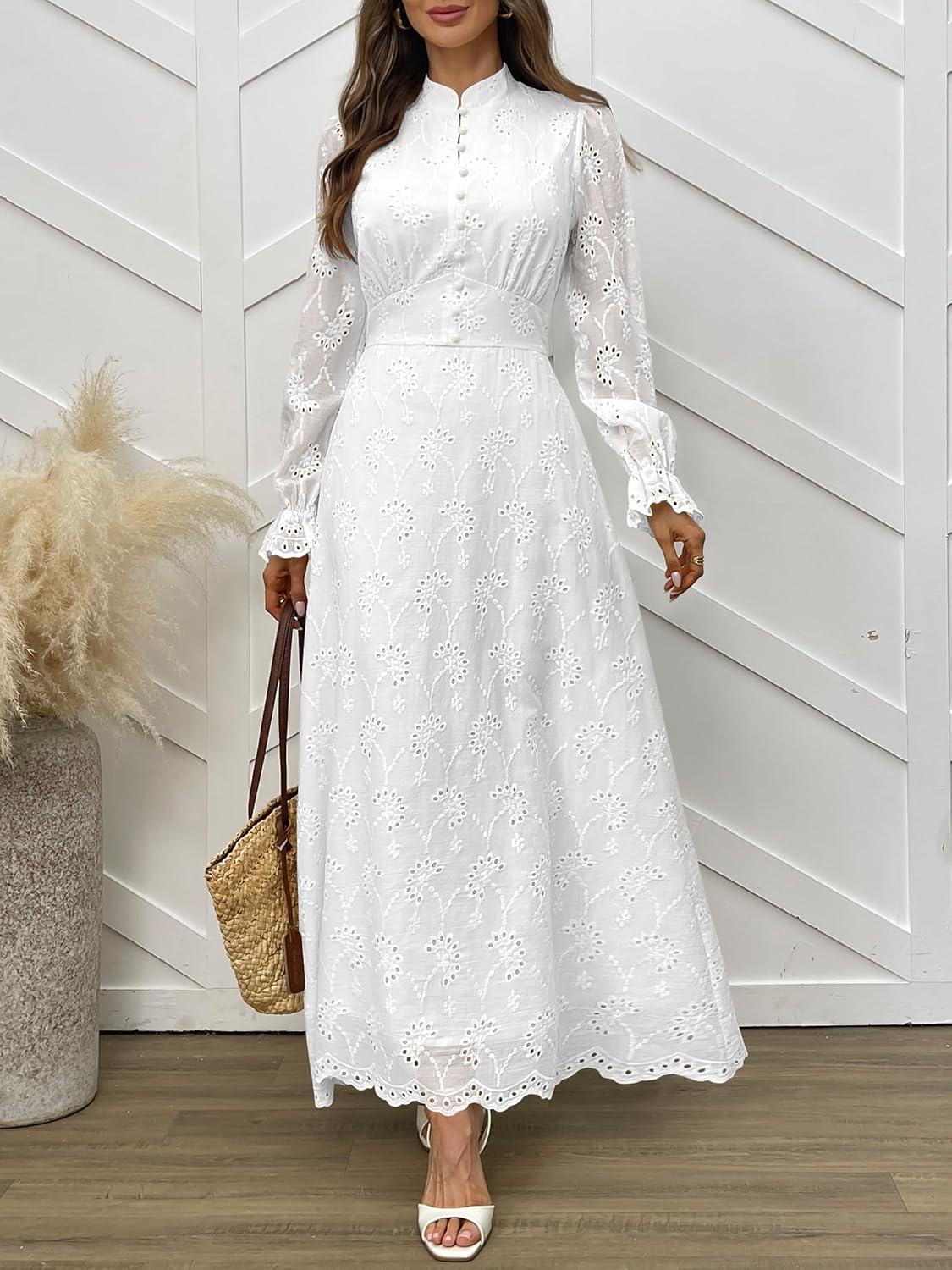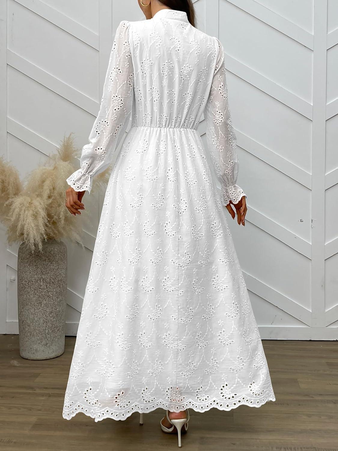 ANRABESS Wedding Guest Dresses for Women 2025 Fall Formal Long Sleeve Eyelet High Neck Elegant Classic Maxi Dress Pockets(White)