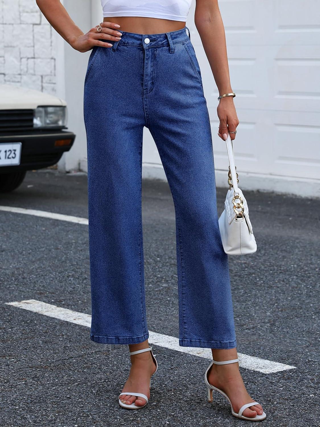 ANRABESS Wide Leg Jeans for Women High Waist Baggy Straight Stretchy Flare Cropped Denim Pants with Patch Pockets 2025 Trendy(Washed Navy Blue)