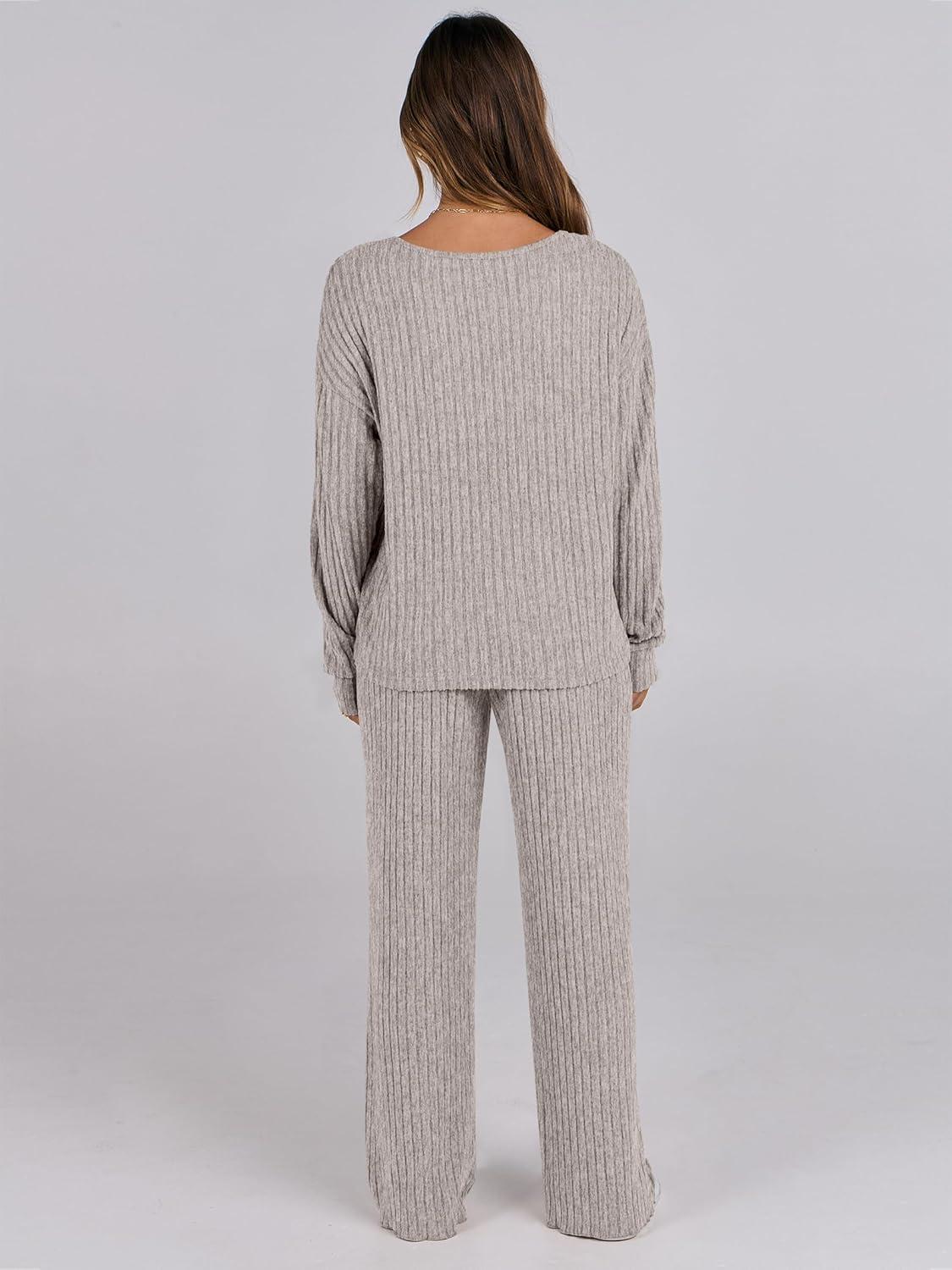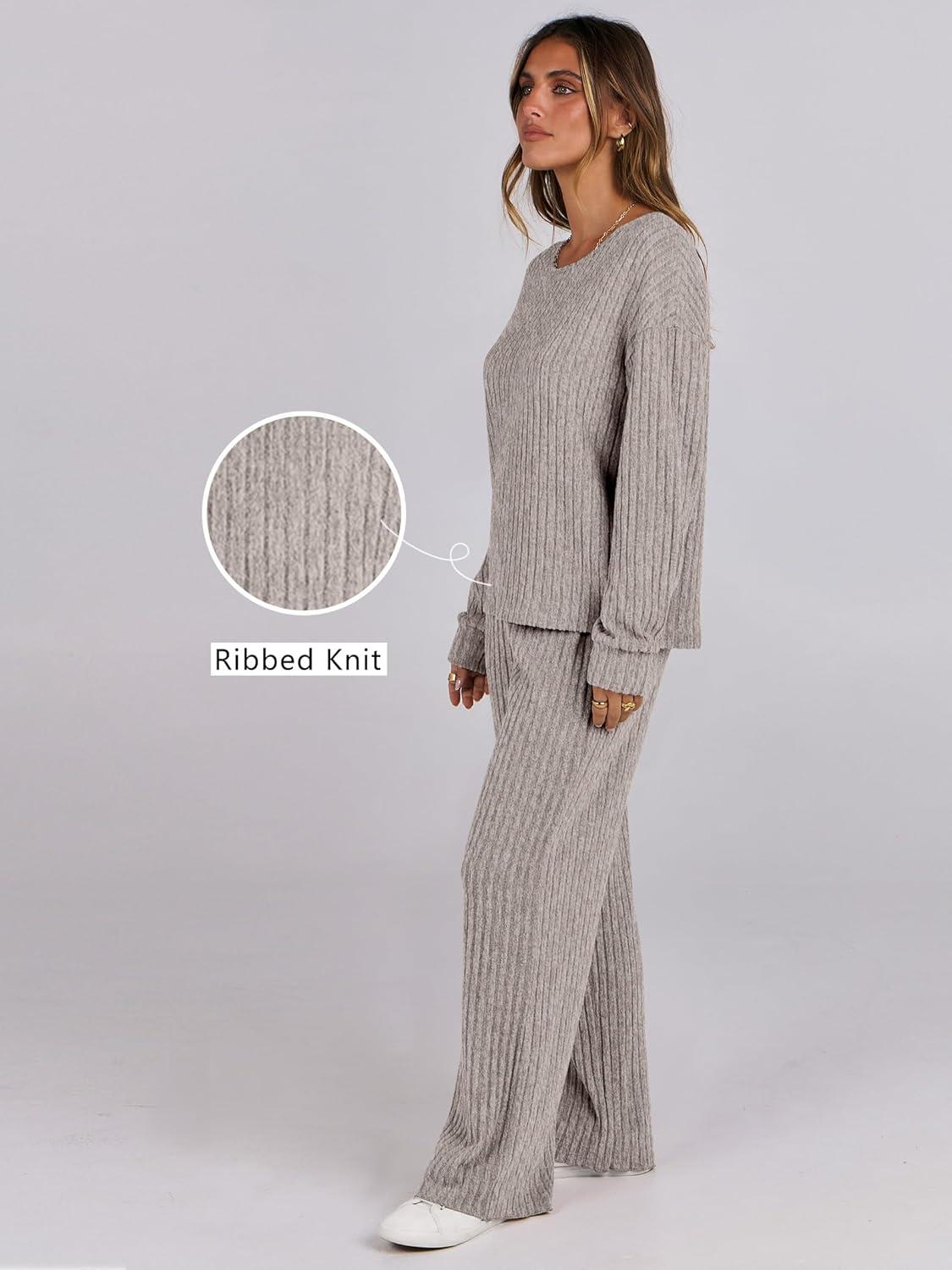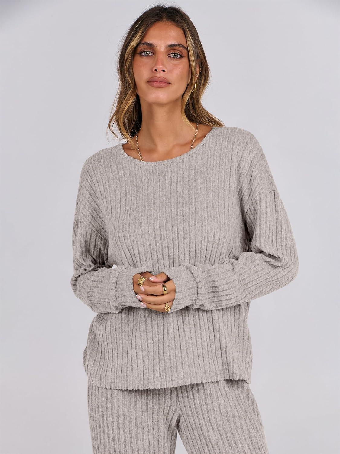 imageANRABESS Women 2 Piece Lounge Pajamas Sets Casual Ribbed Knit Long Sleeve Top Pants Matching Set 2025 Fall Outfits ClothesGrey