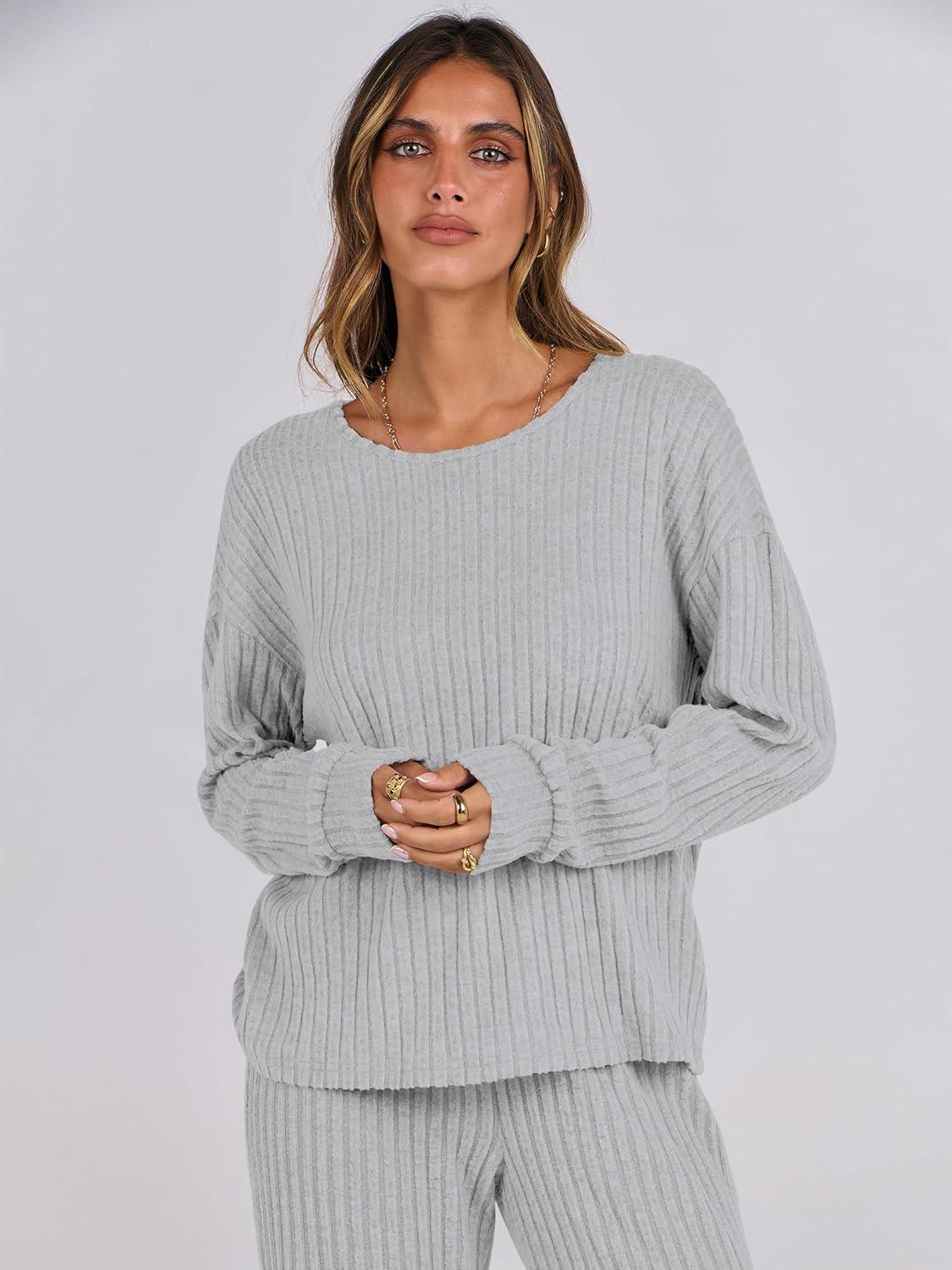 imageANRABESS Women 2 Piece Lounge Pajamas Sets Casual Ribbed Knit Long Sleeve Top Pants Matching Set 2025 Fall Outfits ClothesGrey