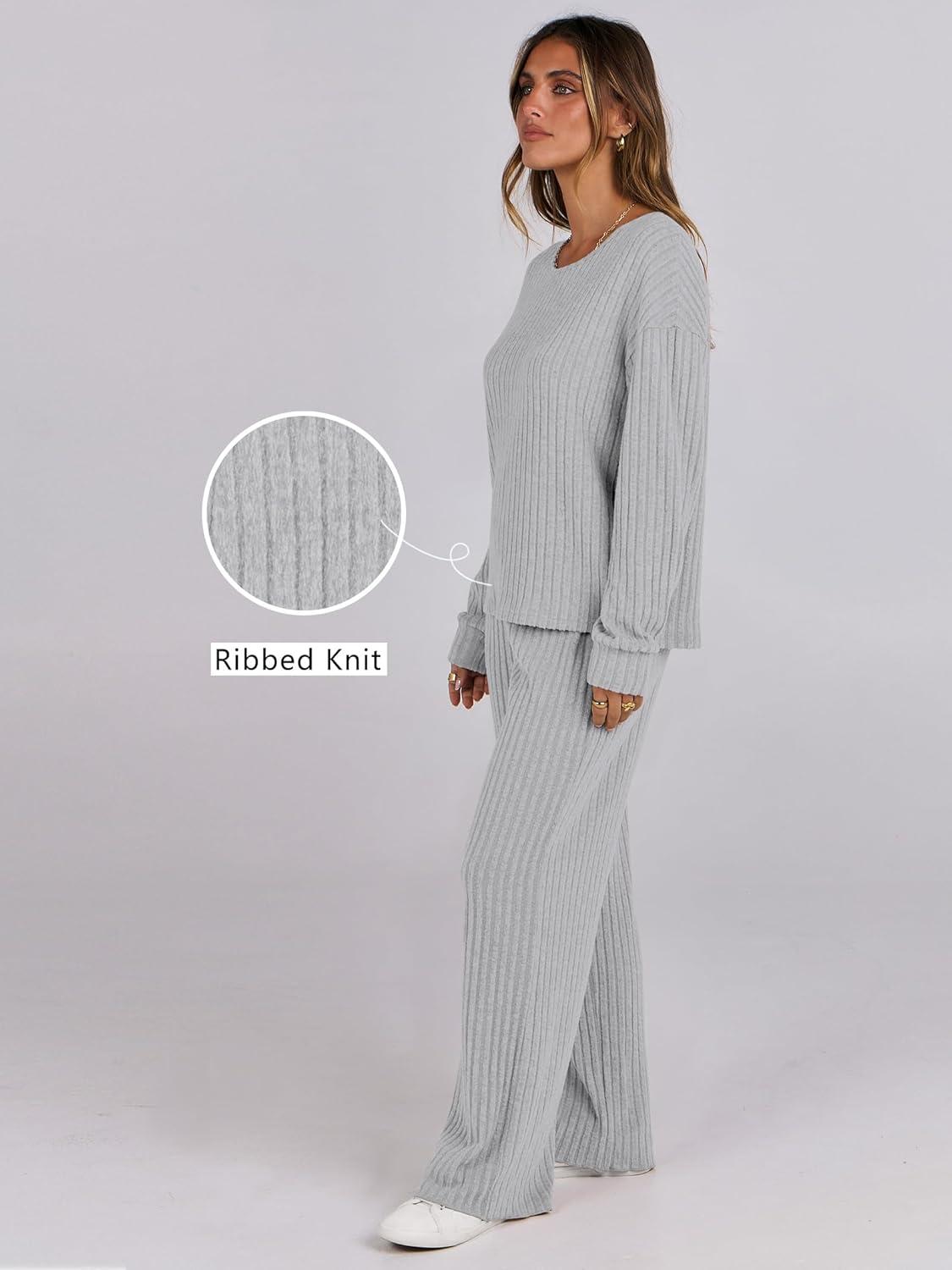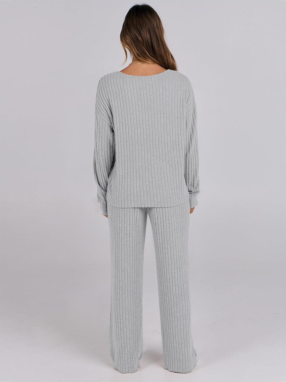 ANRABESS Women 2 Piece Lounge Pajamas Sets Casual Ribbed Knit Long Sleeve Top Pants Matching Set 2025 Fall Outfits Clothes(Grey)
