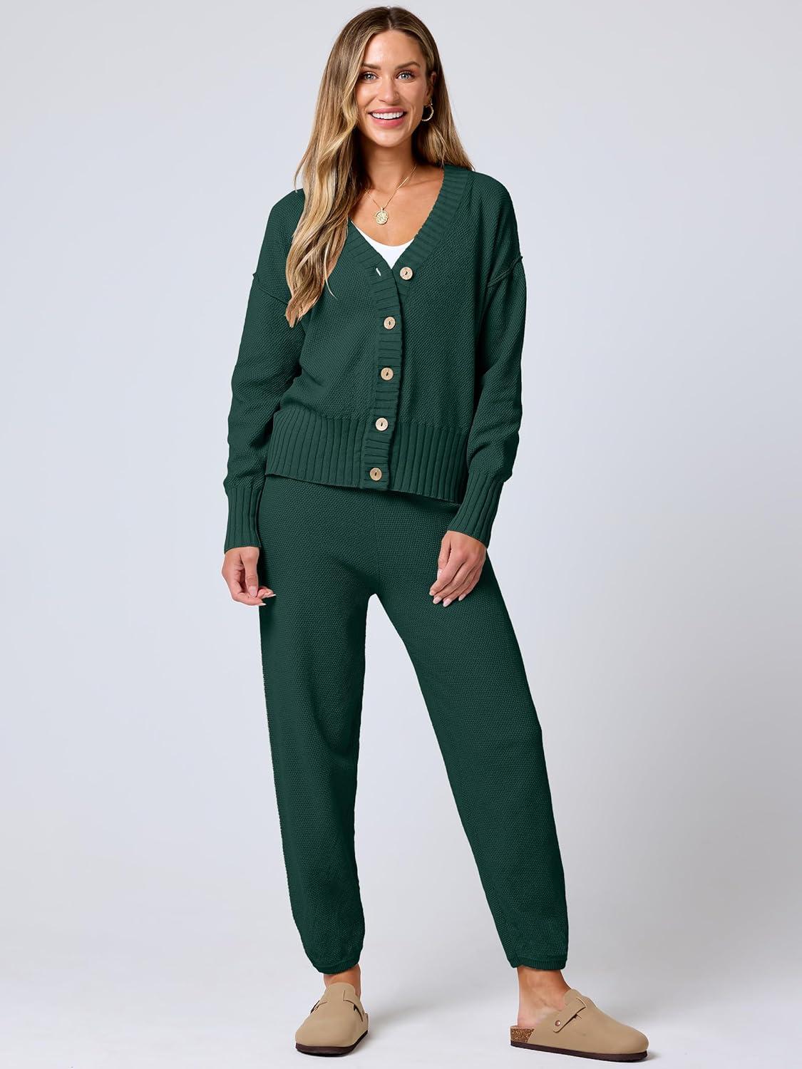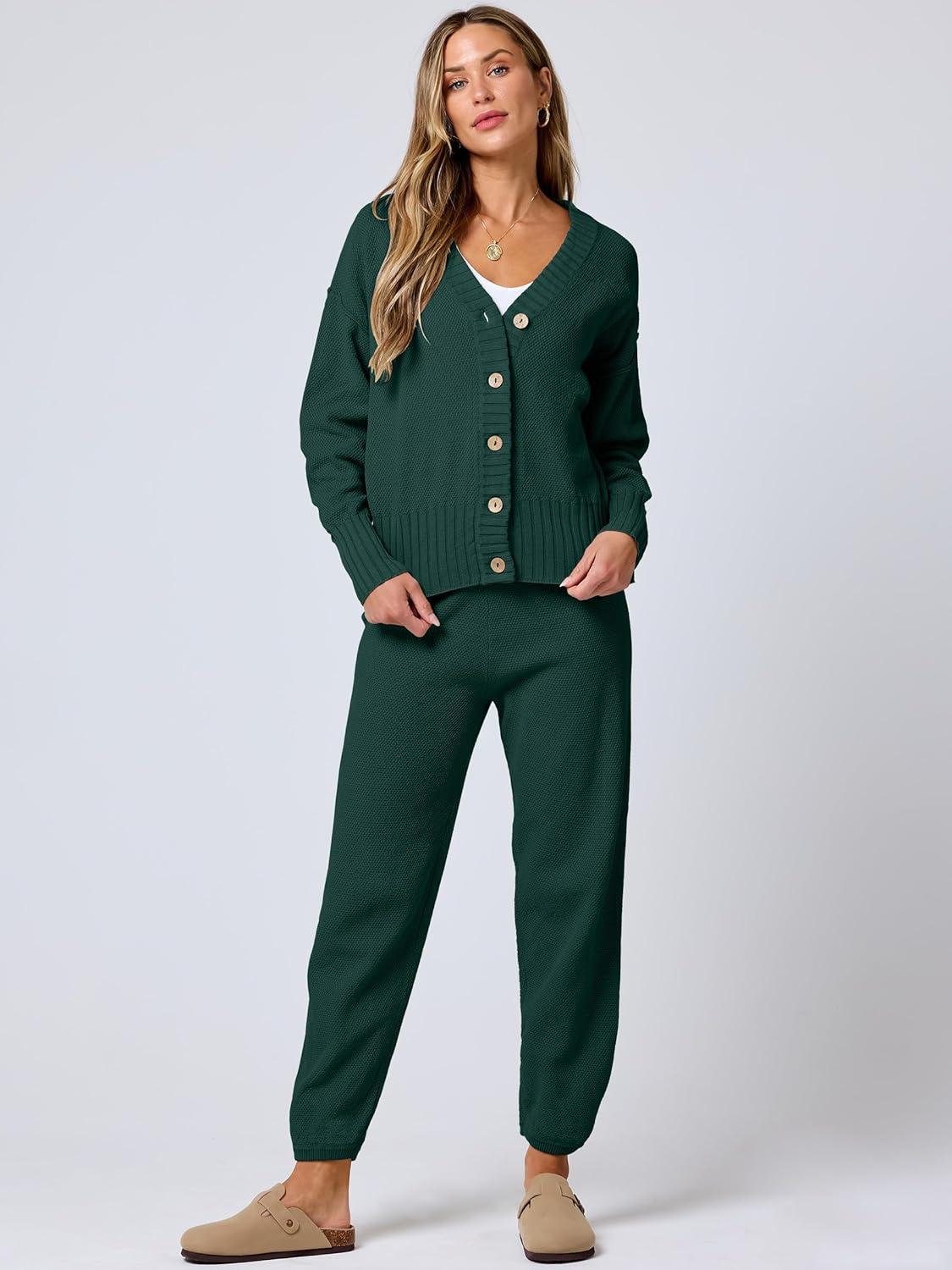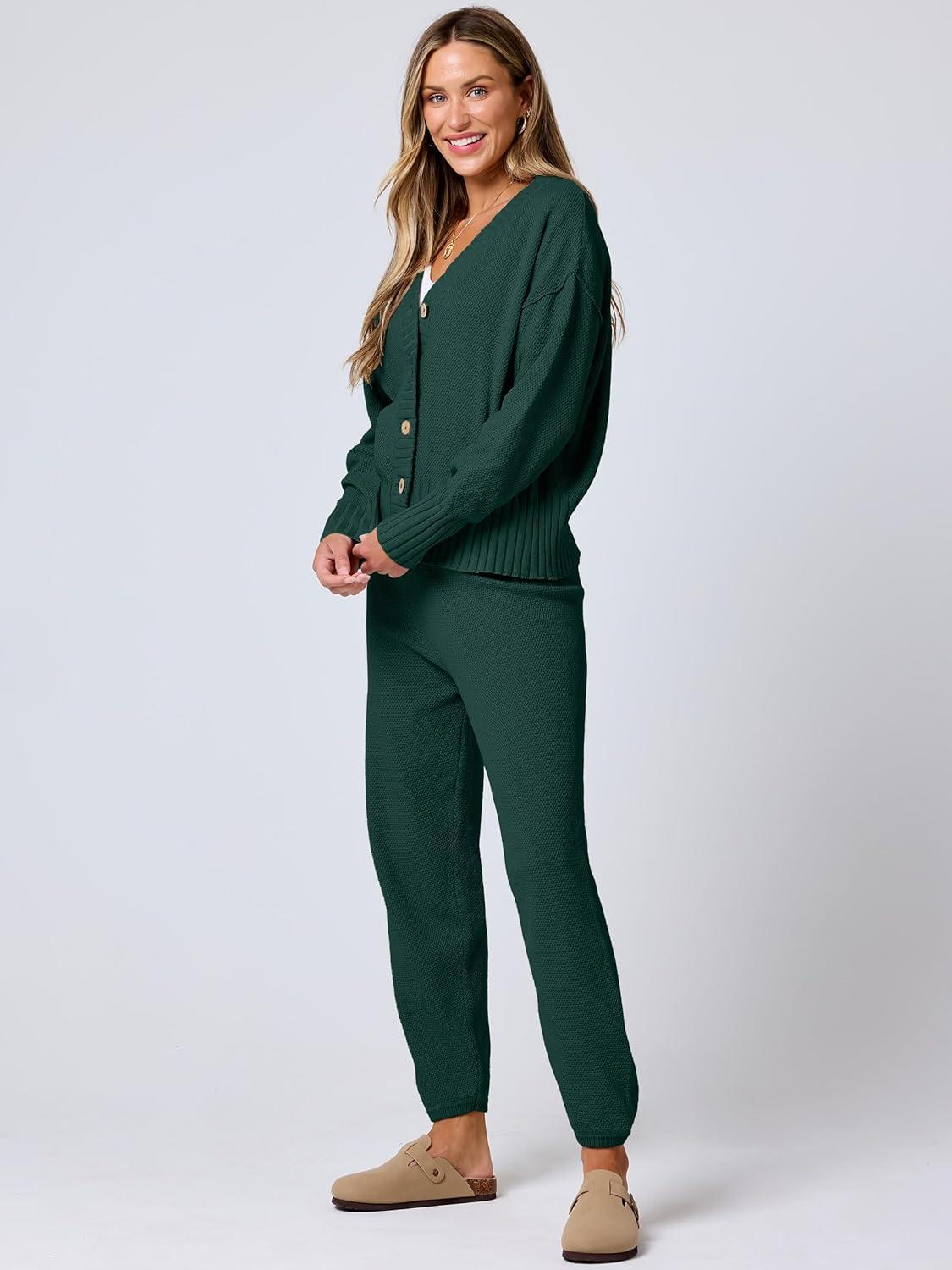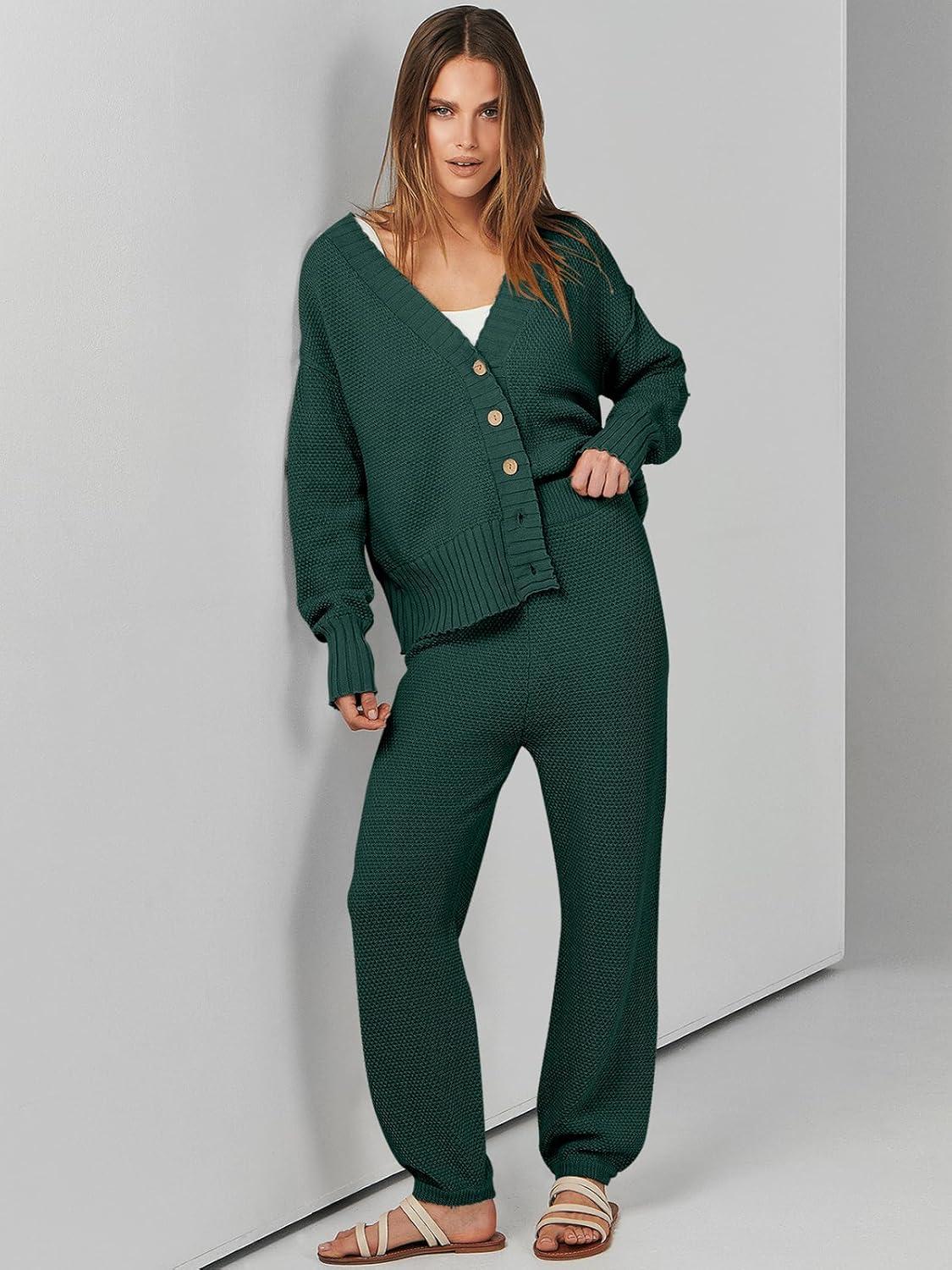ANRABESS Women 2 Piece Lounge Sets 2025 Fall Outfits Casual Waffle Knit Cardigan Sweater Pant Set Travel Airport Clothes(Deep Green)
