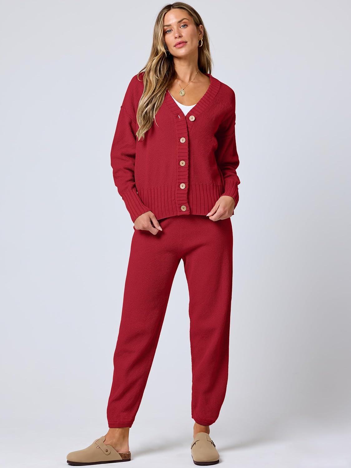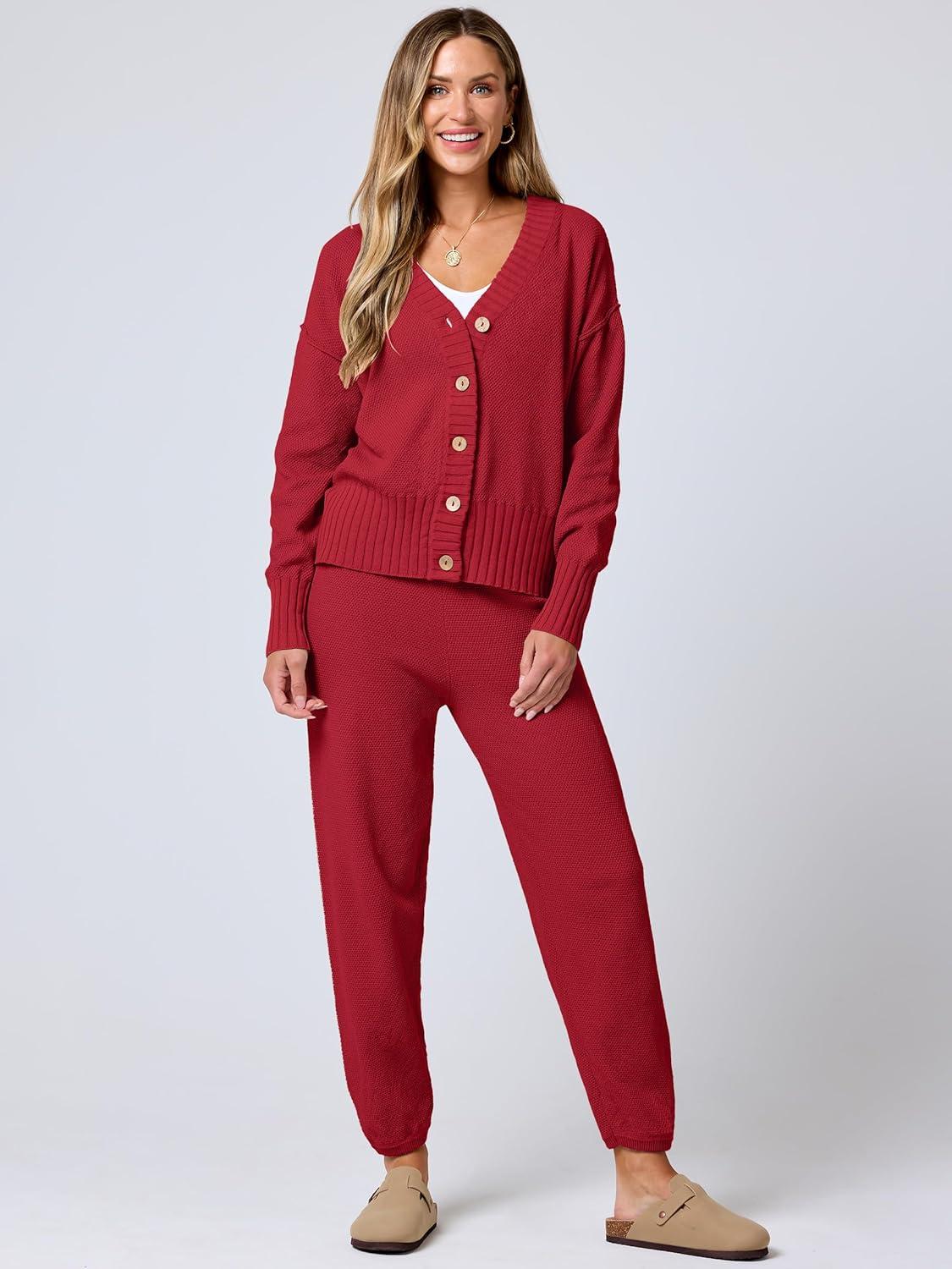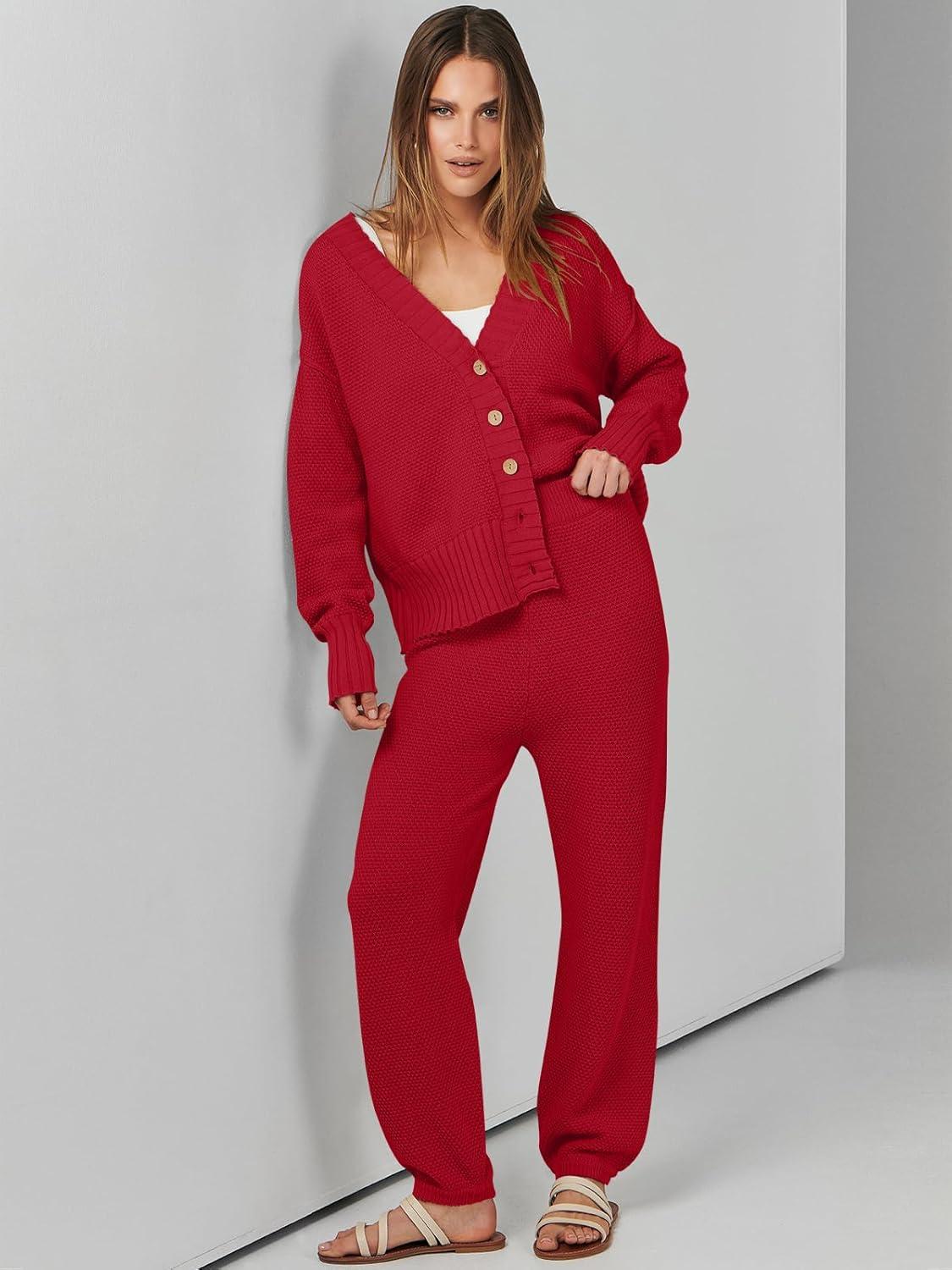 ANRABESS Women 2 Piece Lounge Sets 2025 Fall Outfits Casual Waffle Knit Cardigan Sweater Pant Set Travel Airport Clothes(Red)