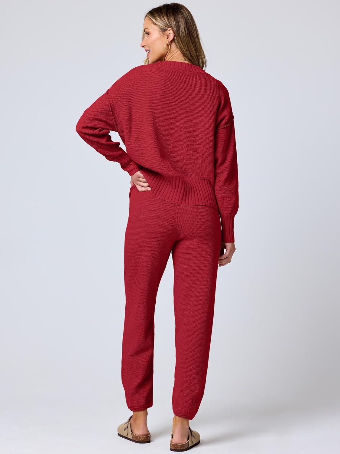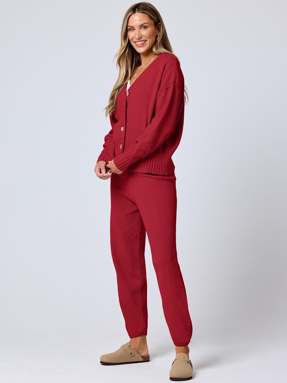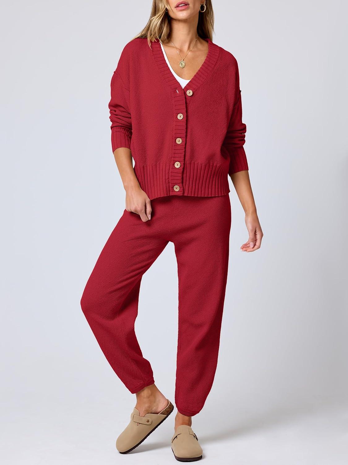 ANRABESS Women 2 Piece Lounge Sets 2025 Fall Outfits Casual Waffle Knit Cardigan Sweater Pant Set Travel Airport Clothes(Red)