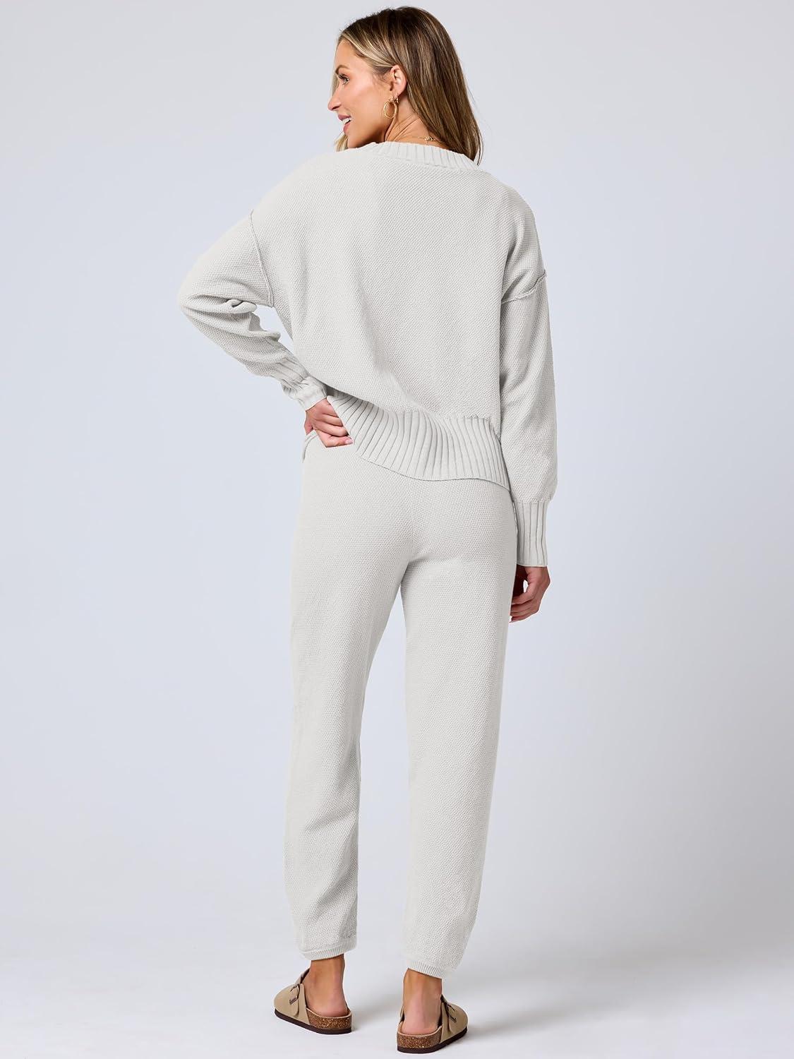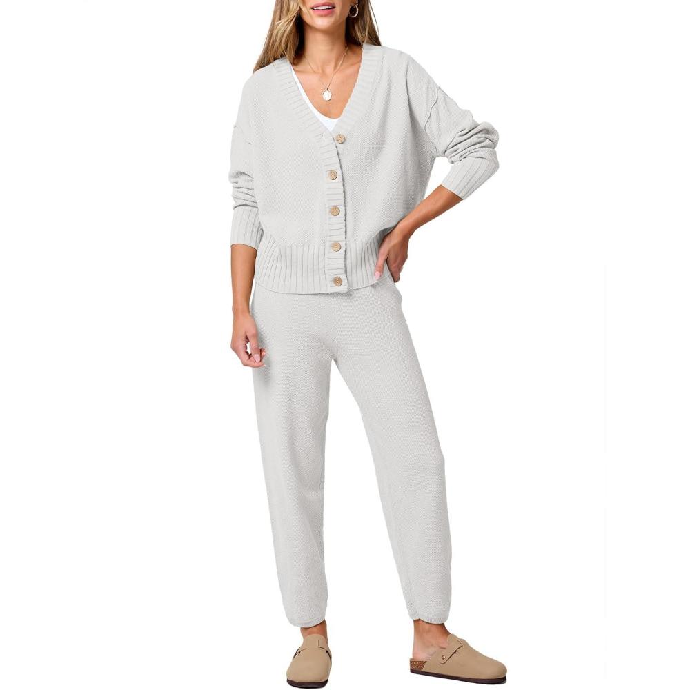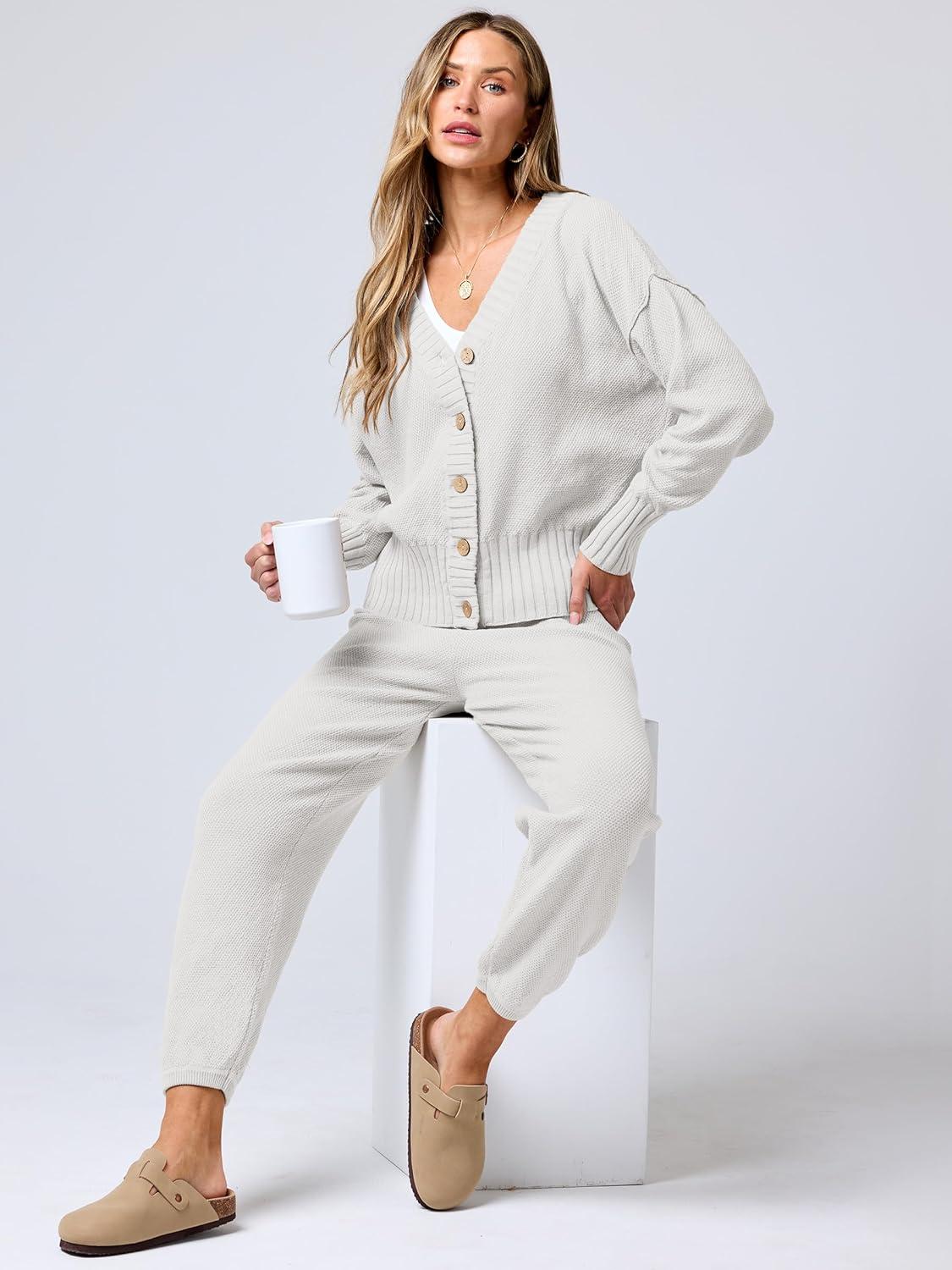ANRABESS Women 2 Piece Lounge Sets 2025 Fall Outfits Casual Waffle Knit Cardigan Sweater Pant Set Travel Airport Clothes(White)