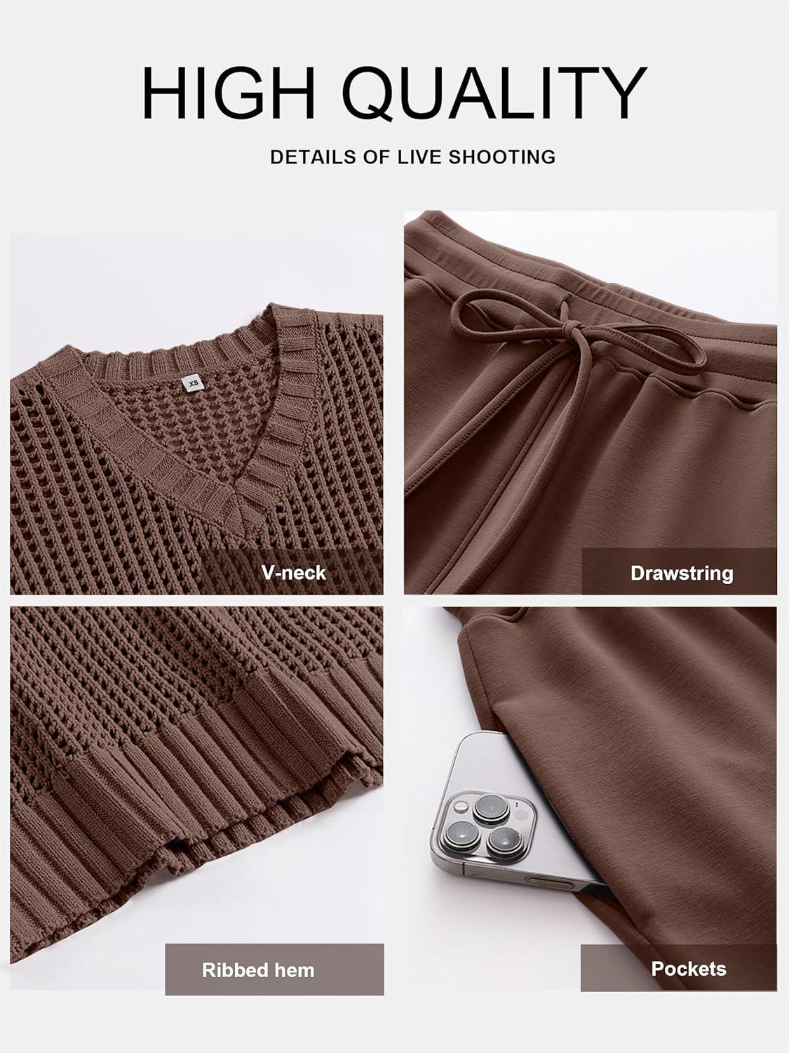 ANRABESS Women 2 Piece Lounge Sets Crochet Knit Sweater Vest Wide Leg Pants Summer Casual Travel Matching Outfits Clothes(Brown)