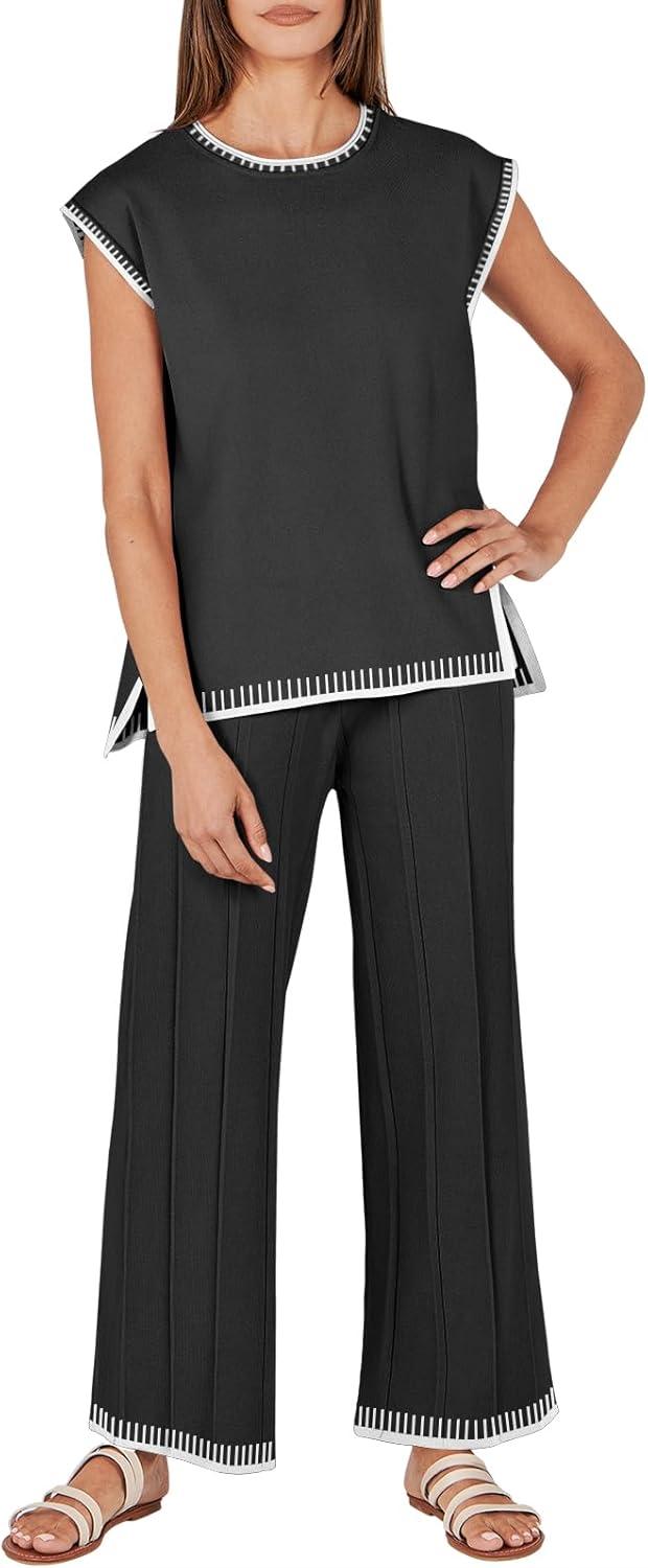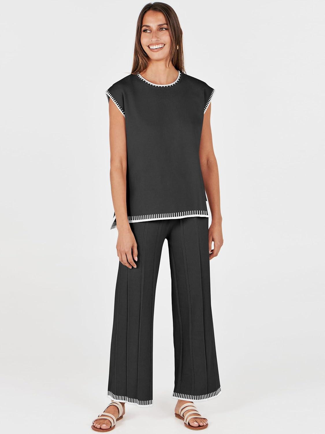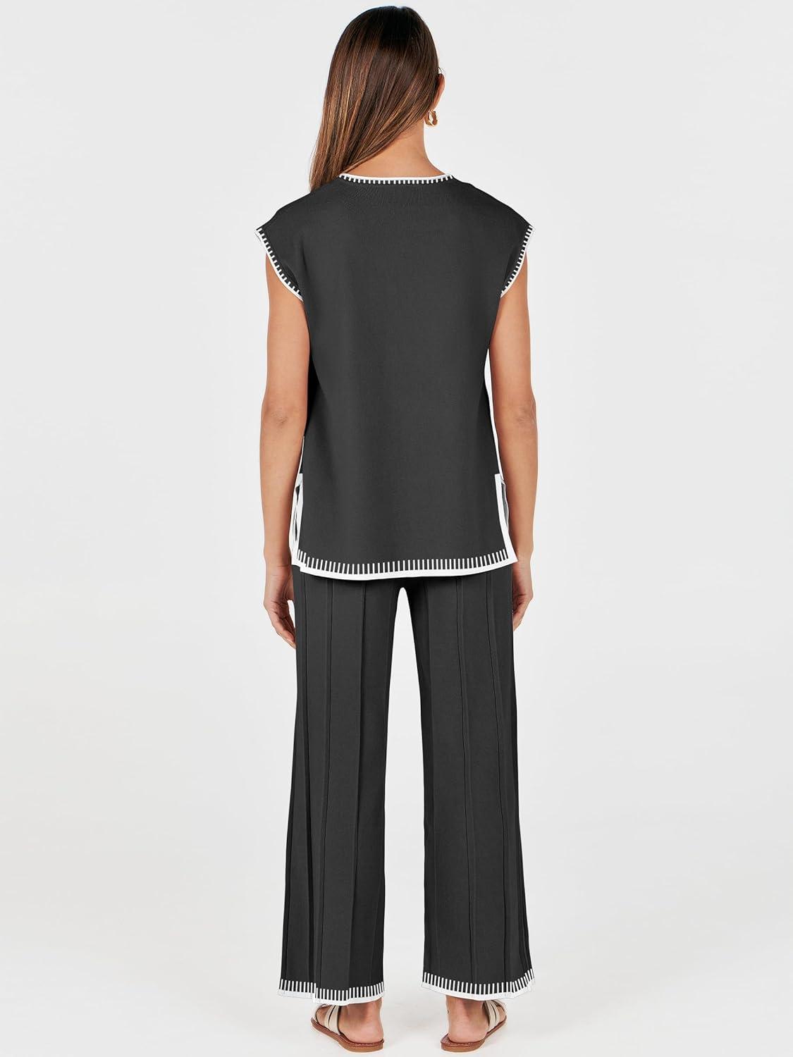 ANRABESS Women 2 Piece Lounge Sets Summer Casual Knit Sweater Vest Pant Set Beach Vacation Clothes 2026 Airport Outfits(Black-white 02)