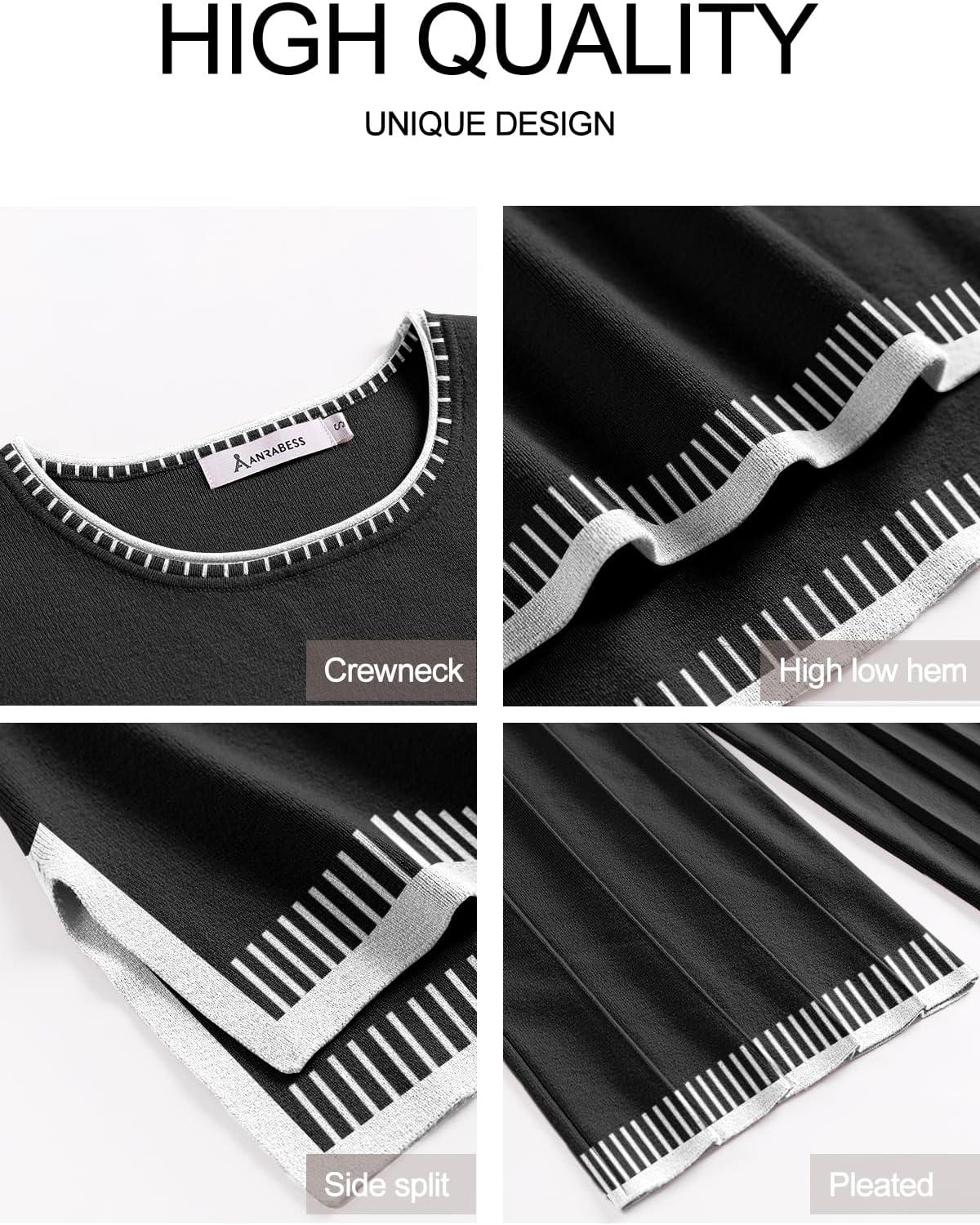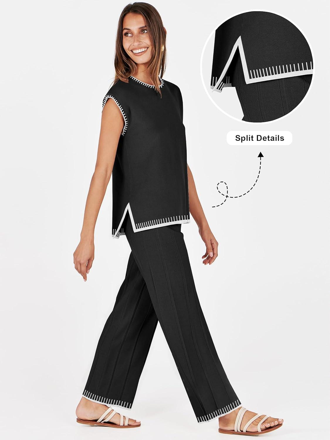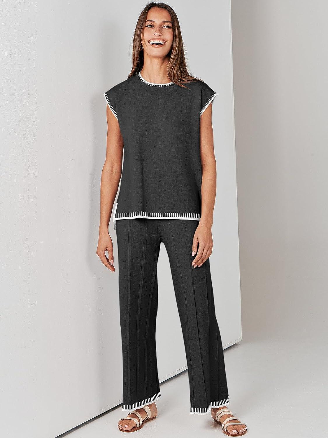 ANRABESS Women 2 Piece Lounge Sets Summer Casual Knit Sweater Vest Pant Set Beach Vacation Clothes 2026 Airport Outfits(Black-white 02)