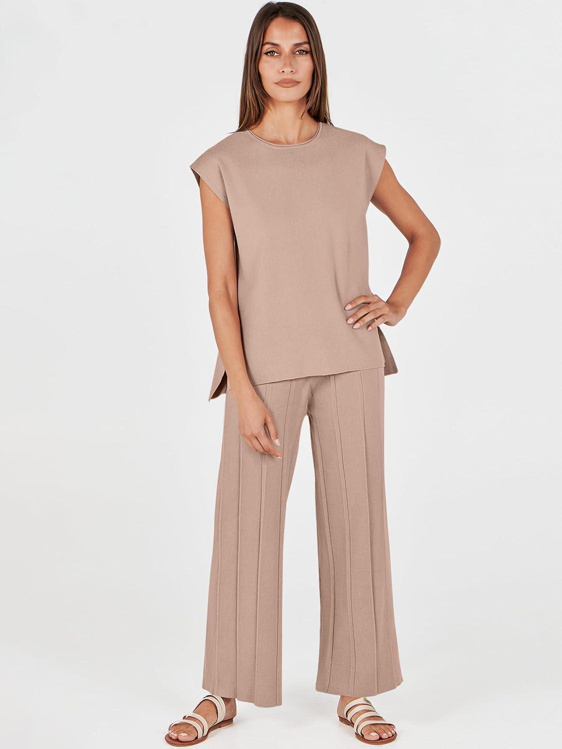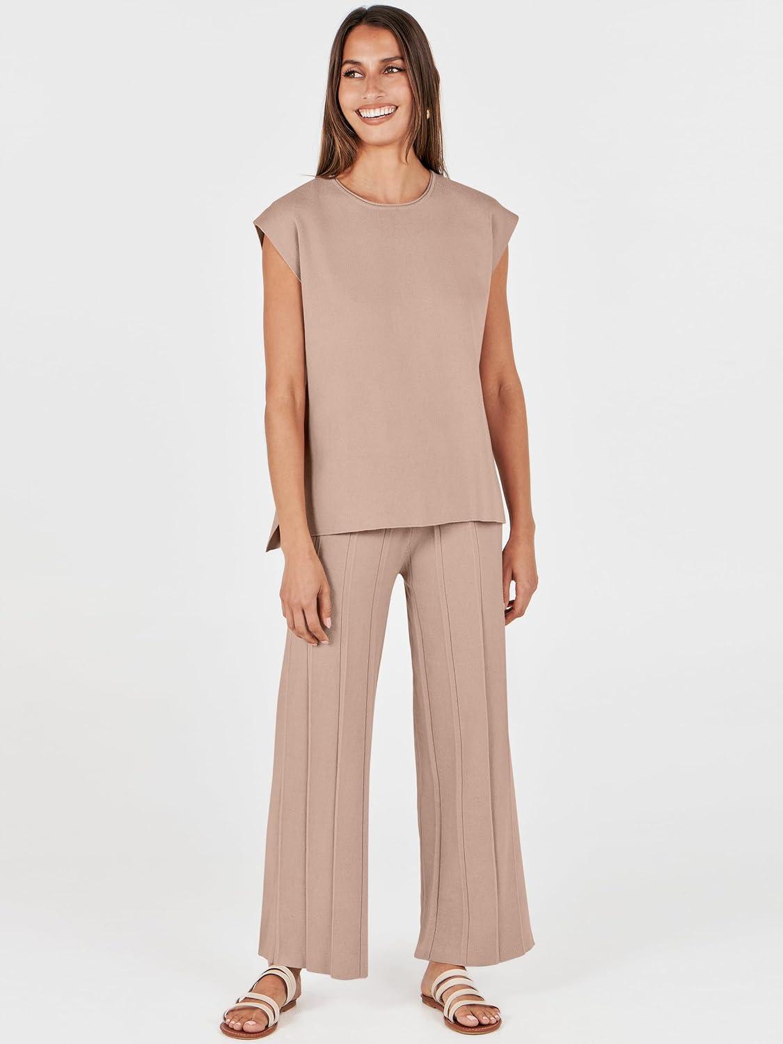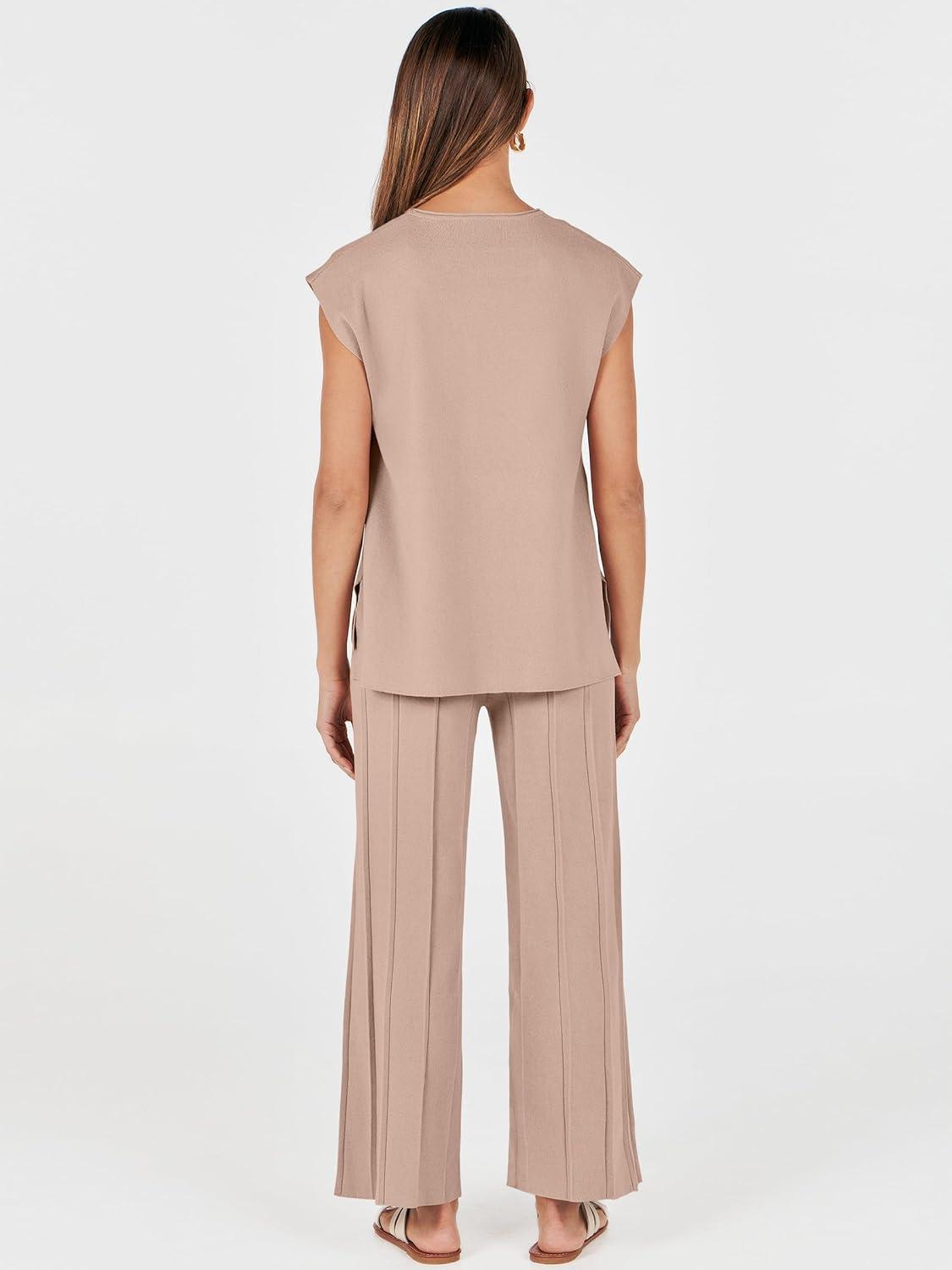 ANRABESS Women 2 Piece Lounge Sets Summer Casual Knit Sweater Vest Pant Set Beach Vacation Clothes 2026 Airport Outfits(Khaki)
