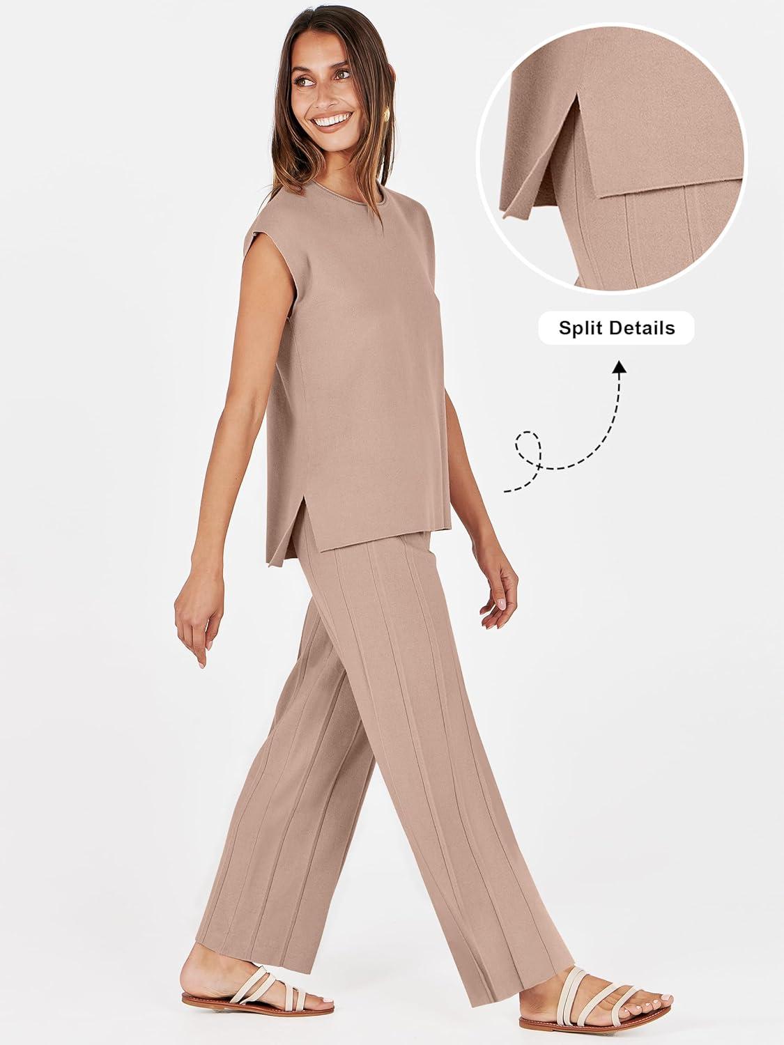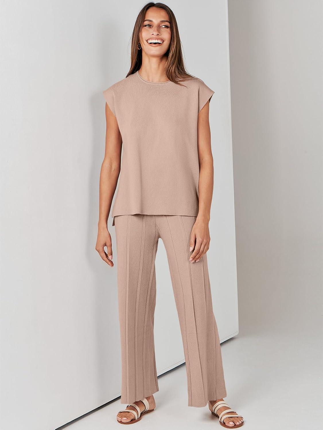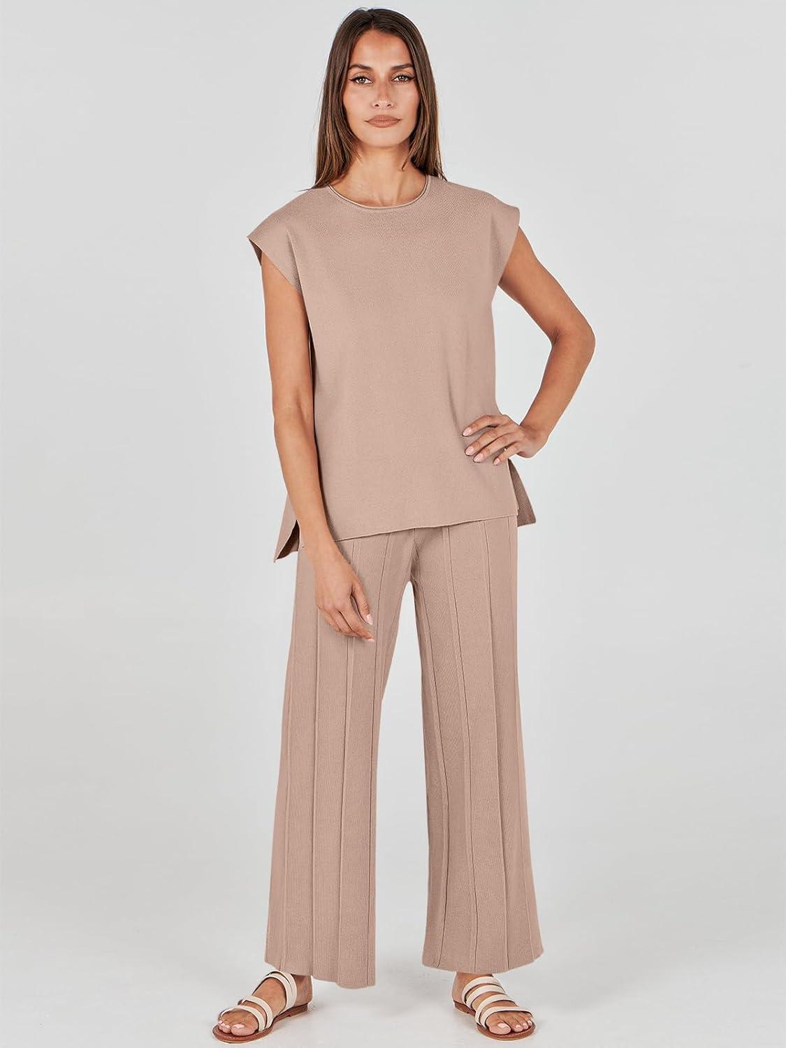 ANRABESS Women 2 Piece Lounge Sets Summer Casual Knit Sweater Vest Pant Set Beach Vacation Clothes 2026 Airport Outfits(Khaki)