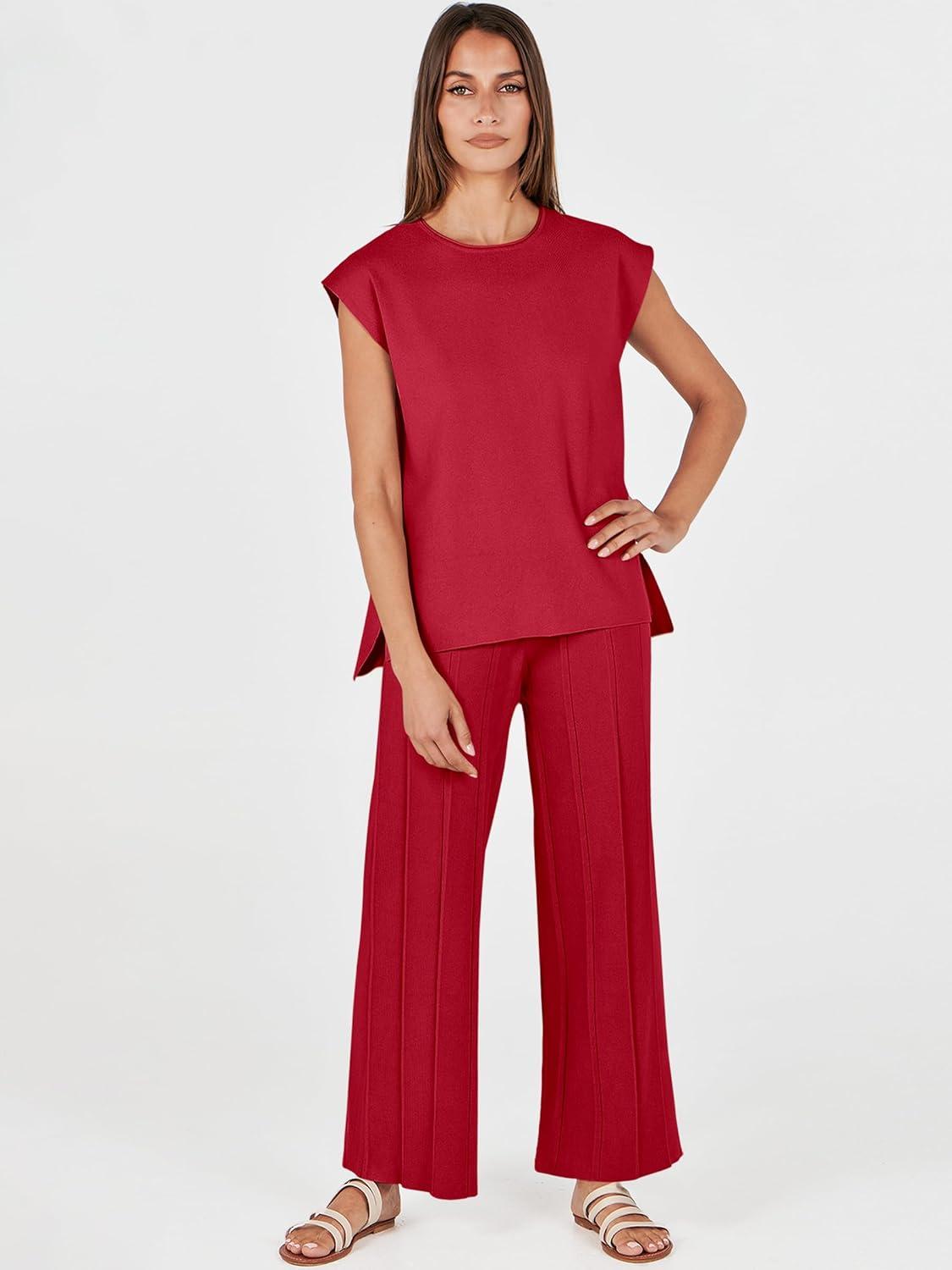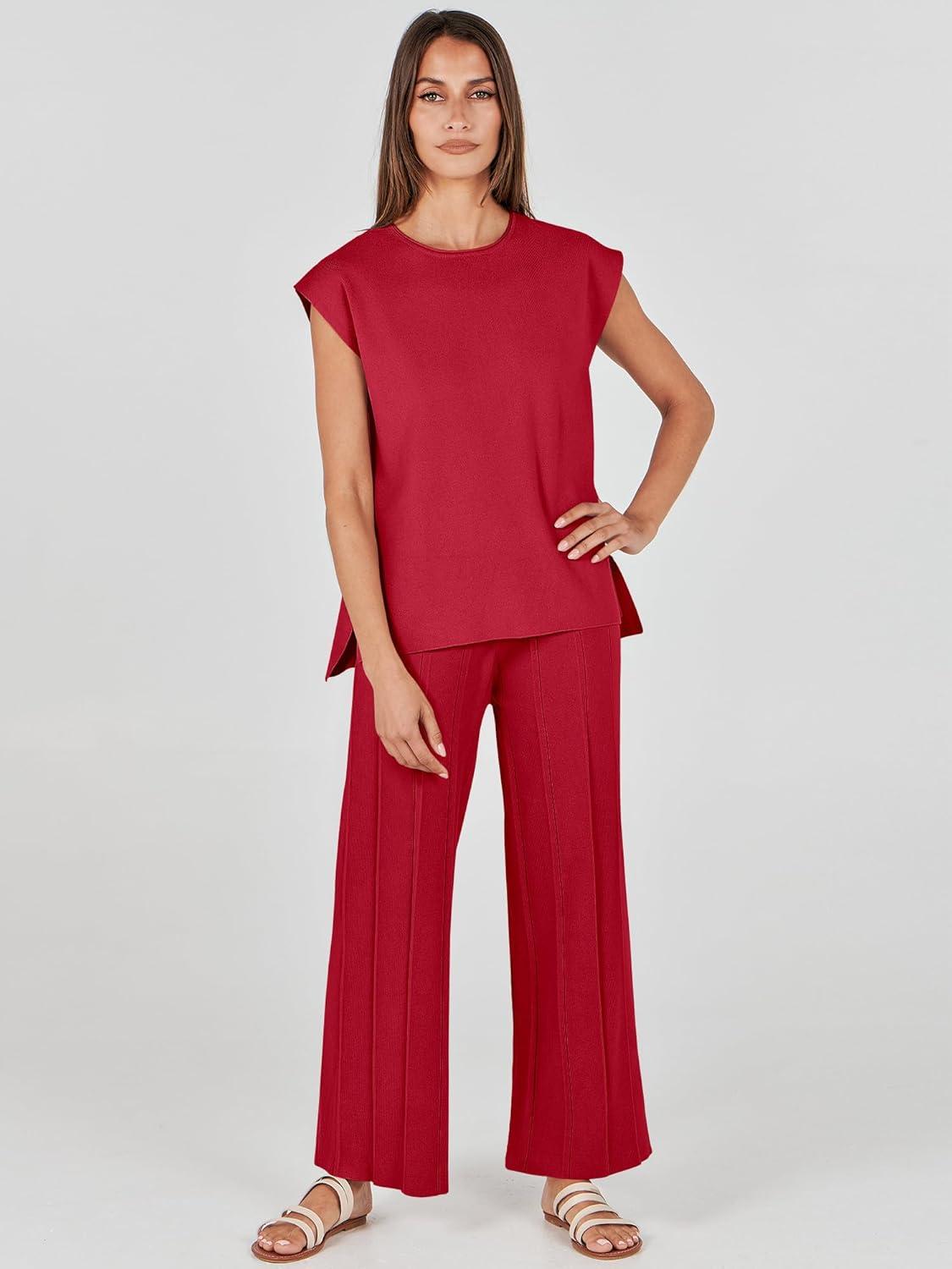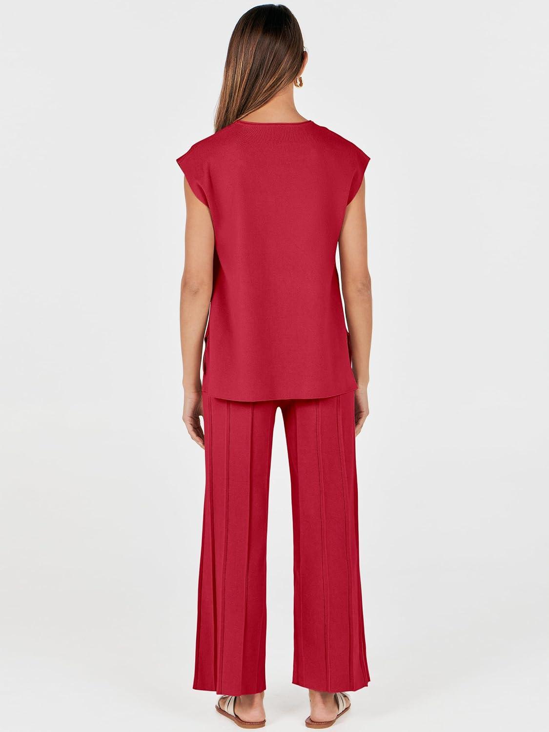 ANRABESS Women 2 Piece Lounge Sets Summer Casual Knit Sweater Vest Pant Set Beach Vacation Clothes 2026 Airport Outfits(Red)