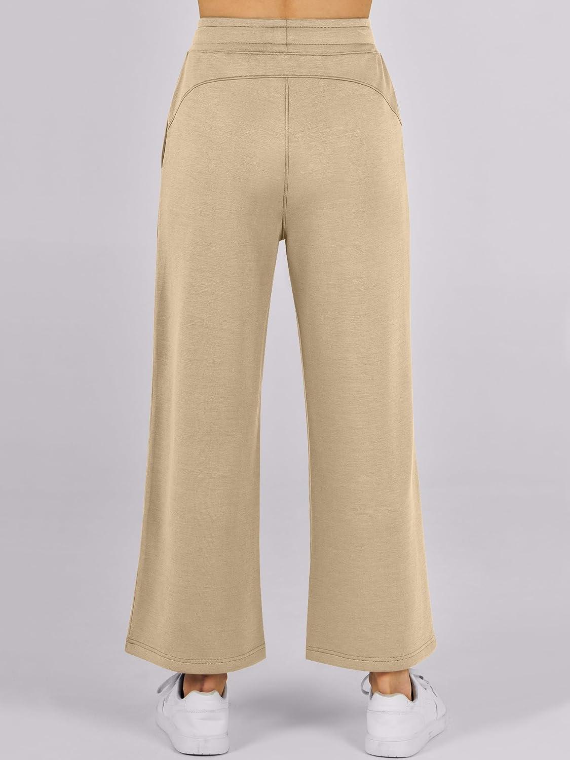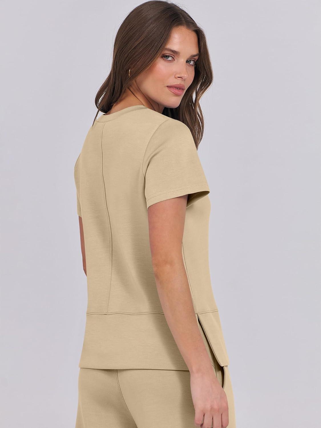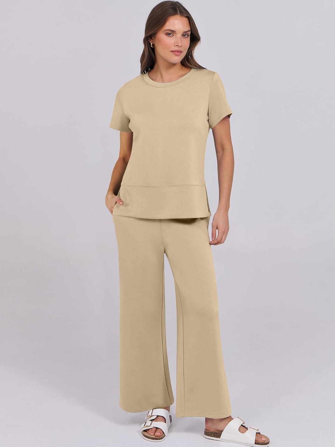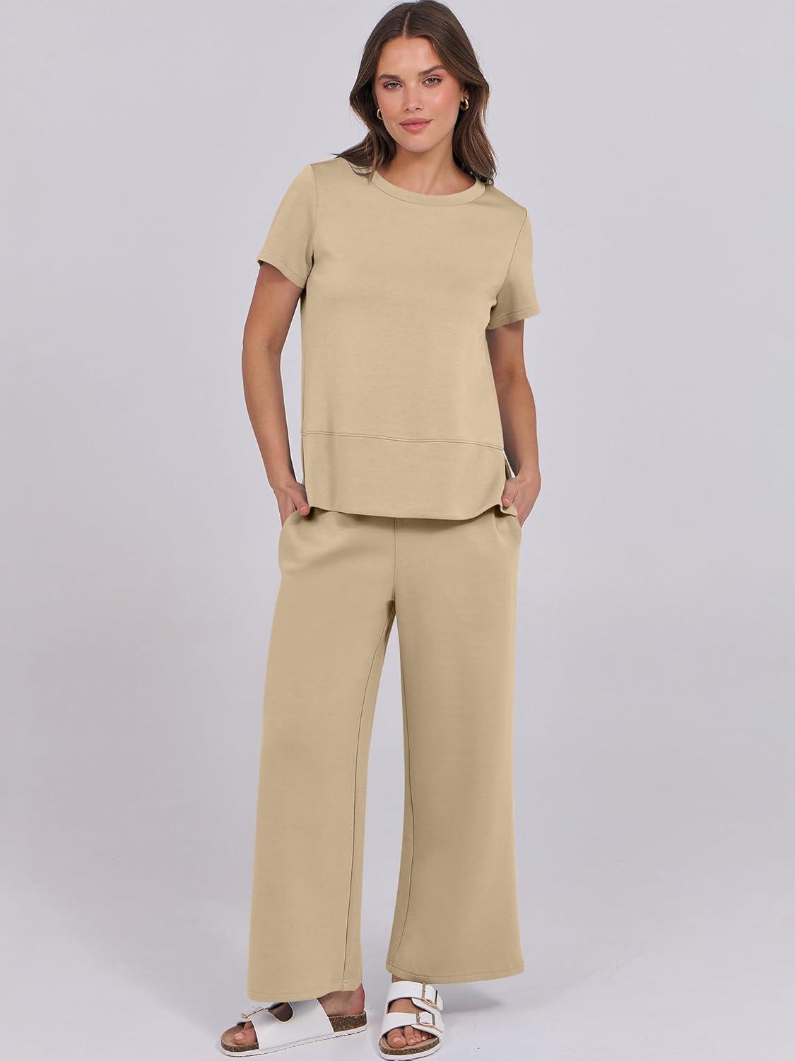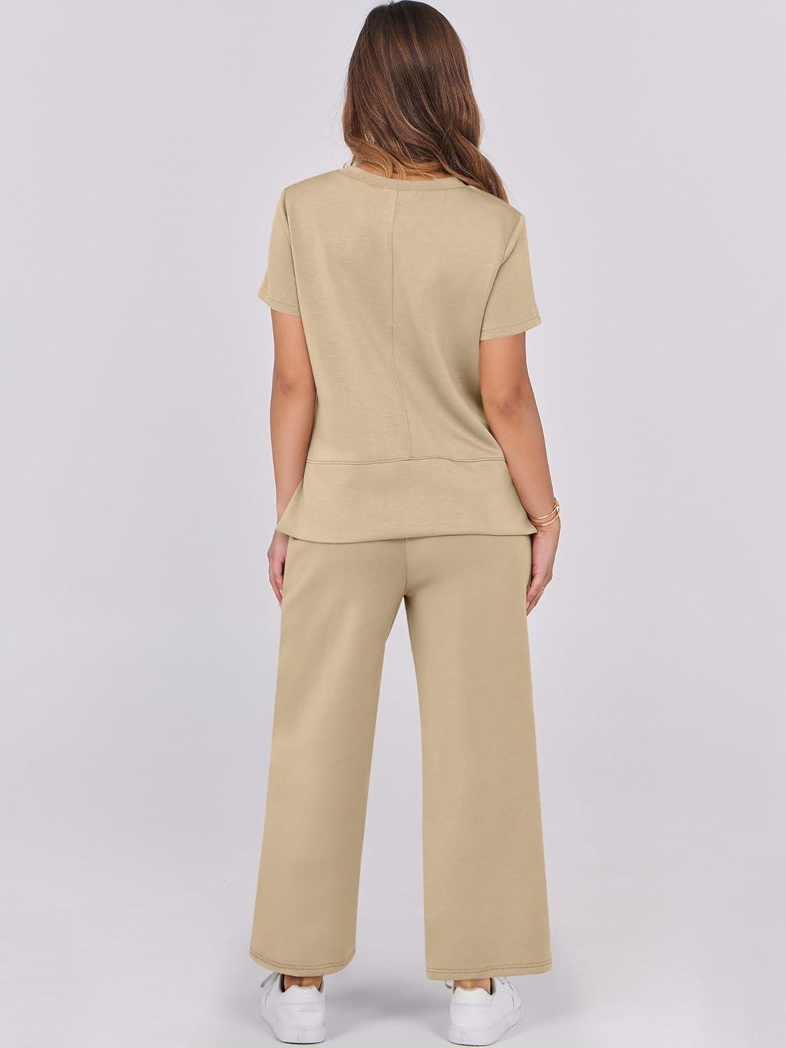 ANRABESS Women 2 Piece Lounge Sets Summer Travel Sweat Outfits Short Sleeve Wide Leg Casual Matching Tracksuits Clothes(Khaki)