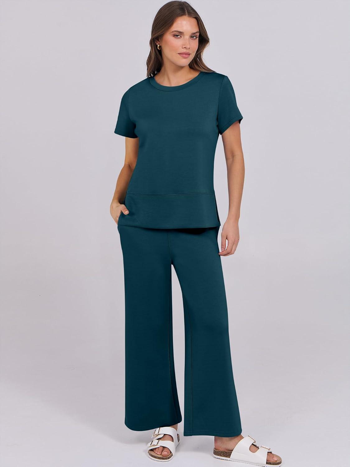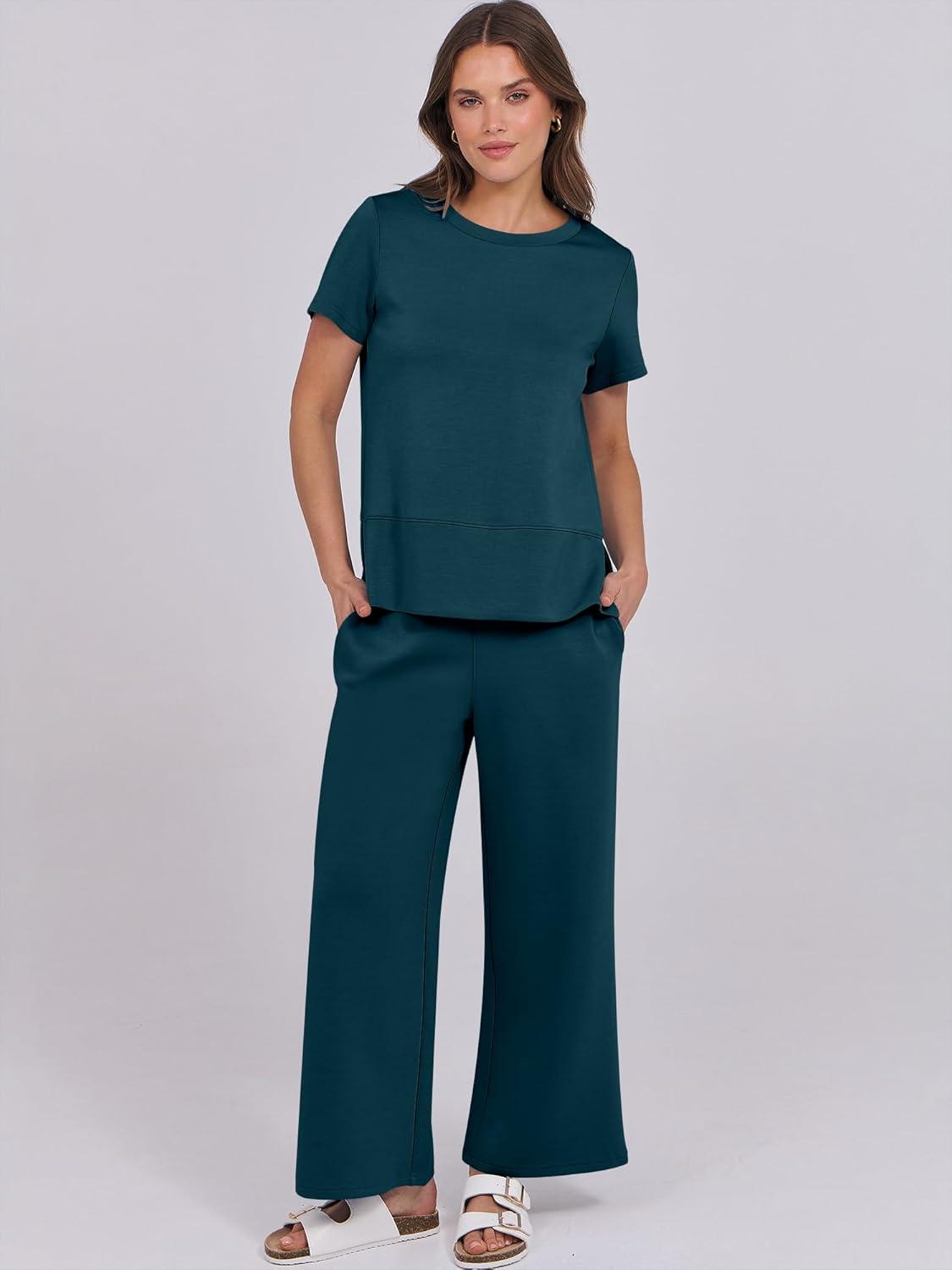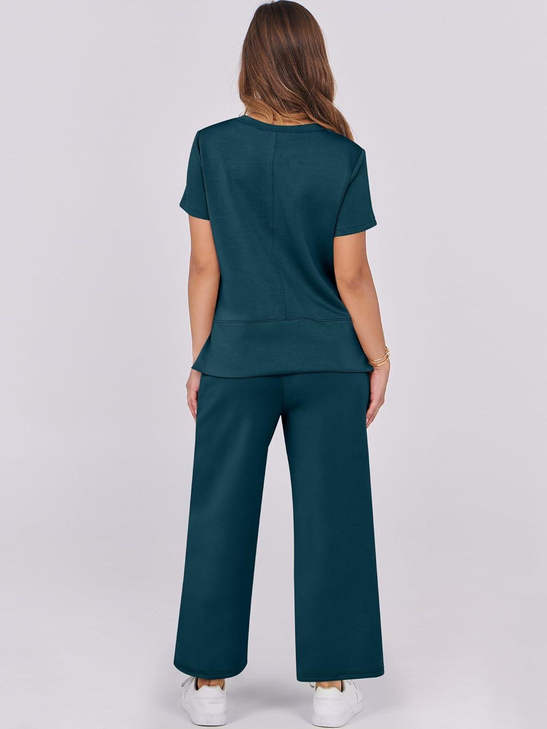 ANRABESS Women 2 Piece Lounge Sets Summer Travel Sweat Outfits Short Sleeve Wide Leg Casual Matching Tracksuits Clothes(Lake Green)