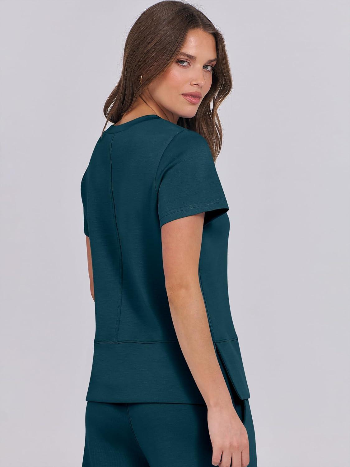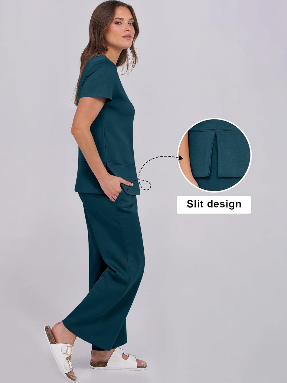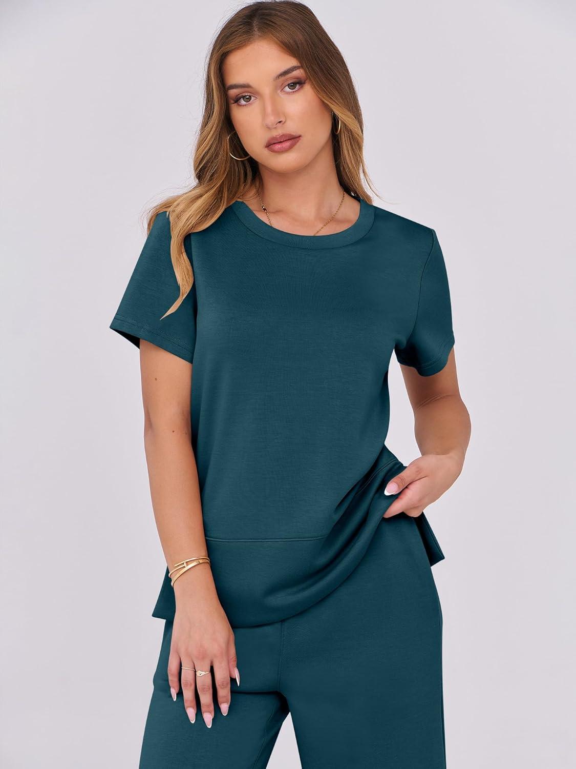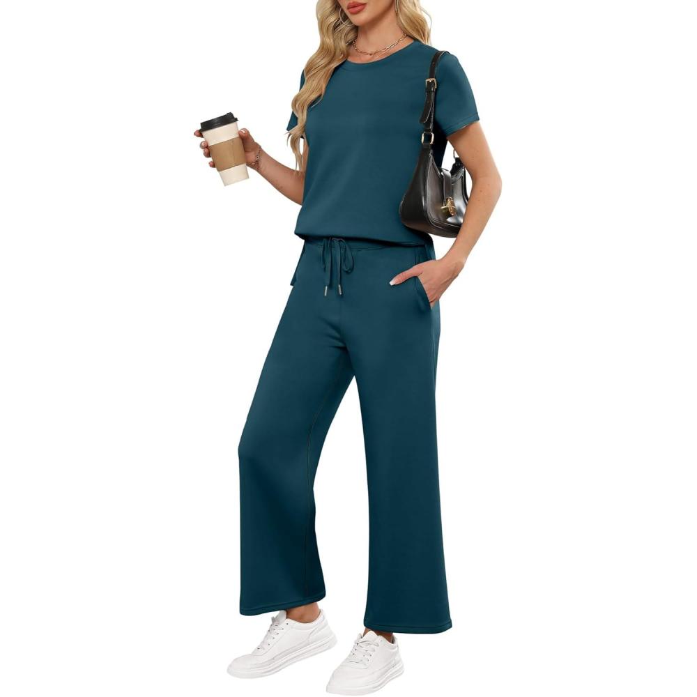 ANRABESS Women 2 Piece Lounge Sets Summer Travel Sweat Outfits Short Sleeve Wide Leg Casual Matching Tracksuits Clothes(Lake Green)