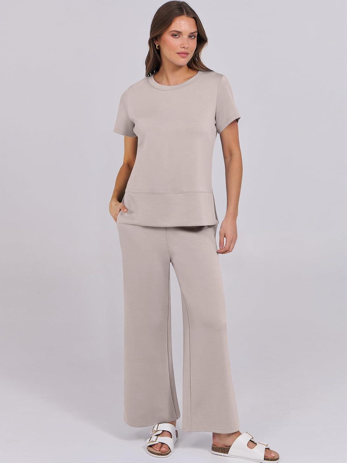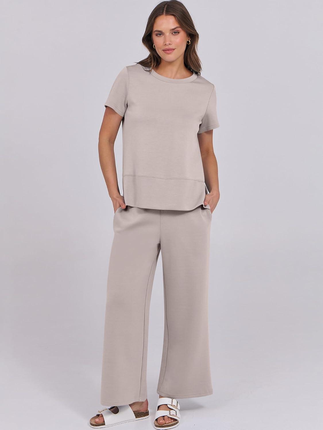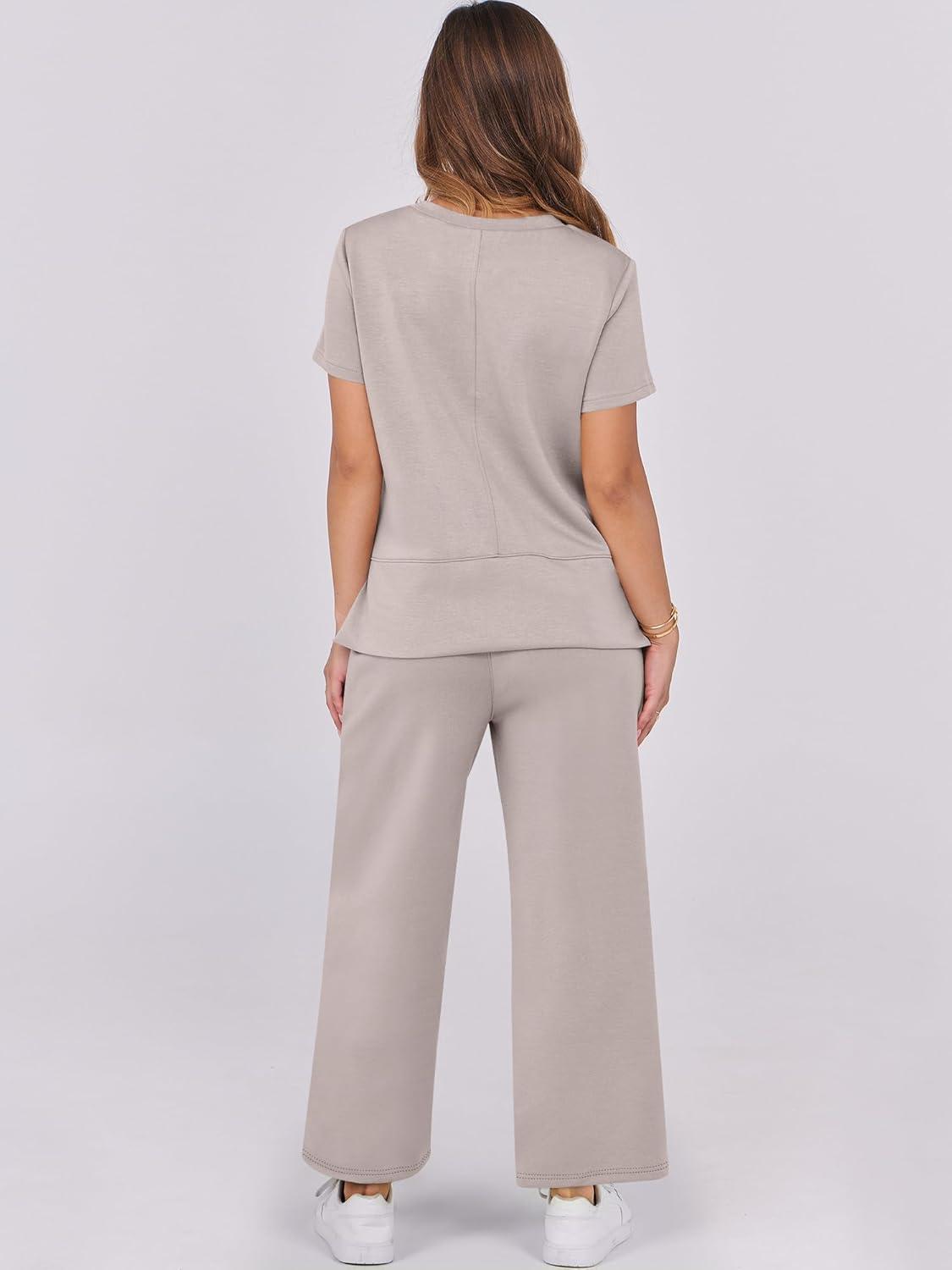 ANRABESS Women 2 Piece Lounge Sets Summer Travel Sweat Outfits Short Sleeve Wide Leg Casual Matching Tracksuits Clothes(Light Khaki)