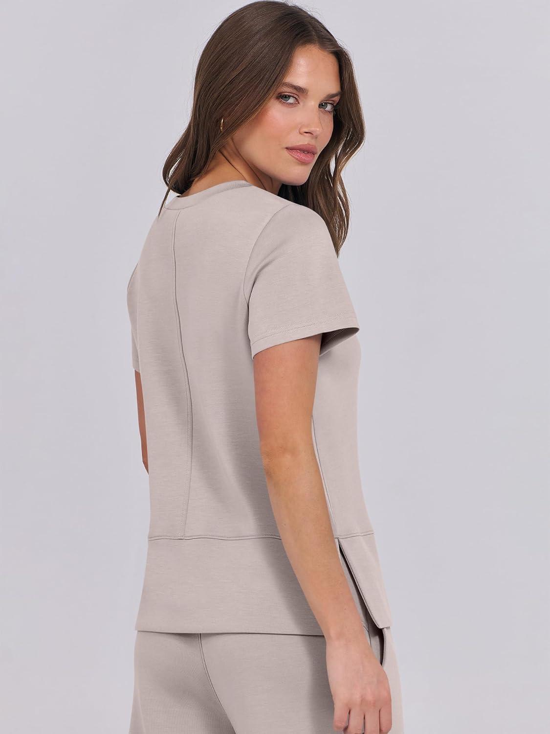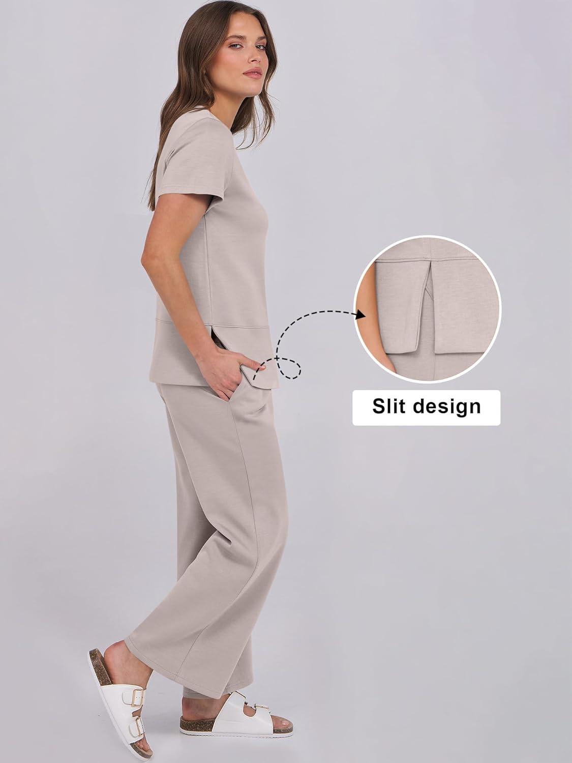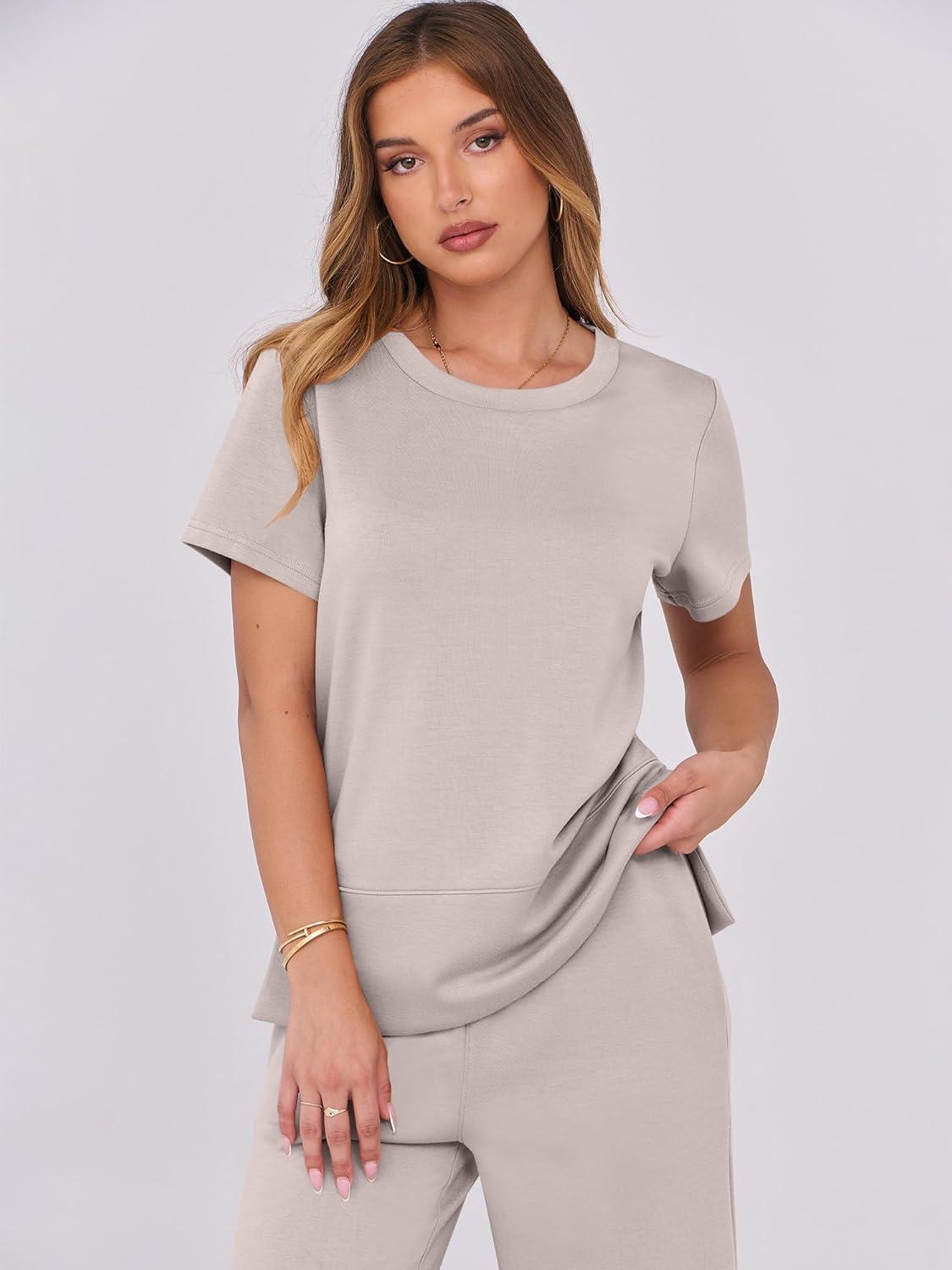 ANRABESS Women 2 Piece Lounge Sets Summer Travel Sweat Outfits Short Sleeve Wide Leg Casual Matching Tracksuits Clothes(Light Khaki)