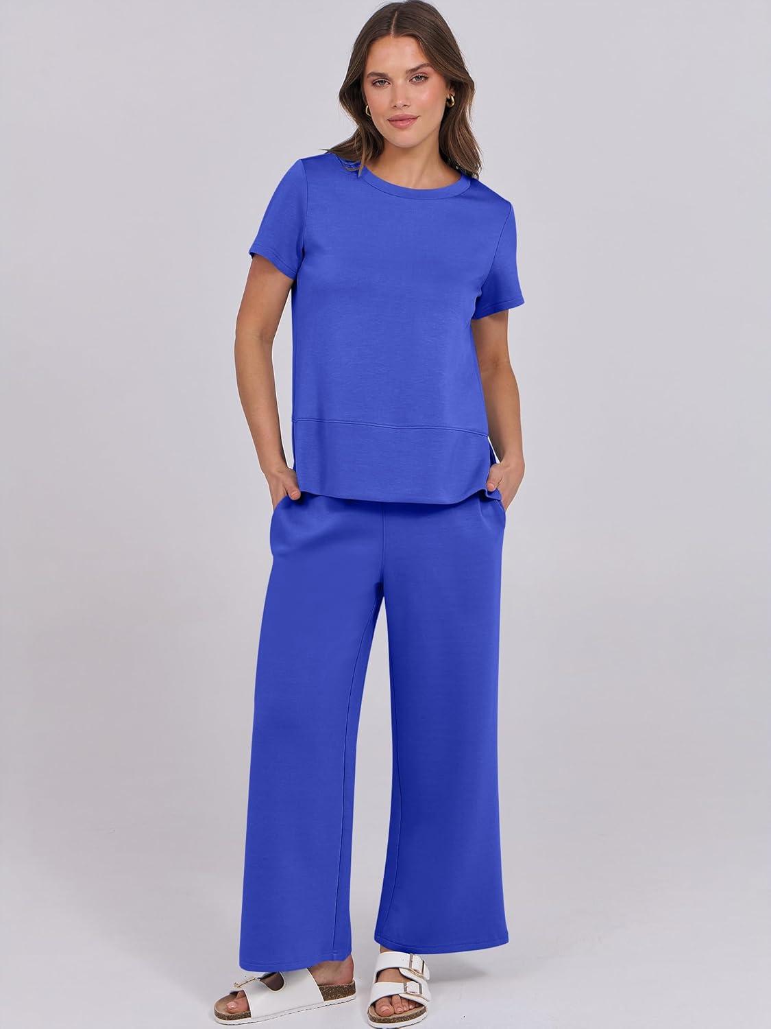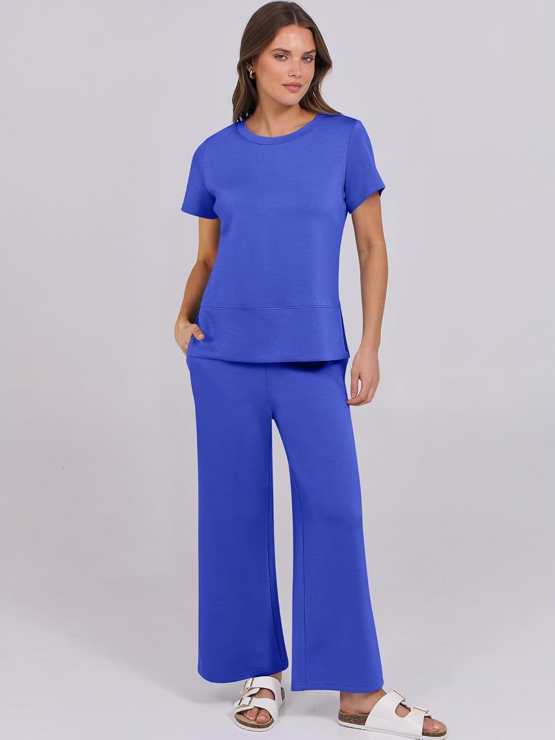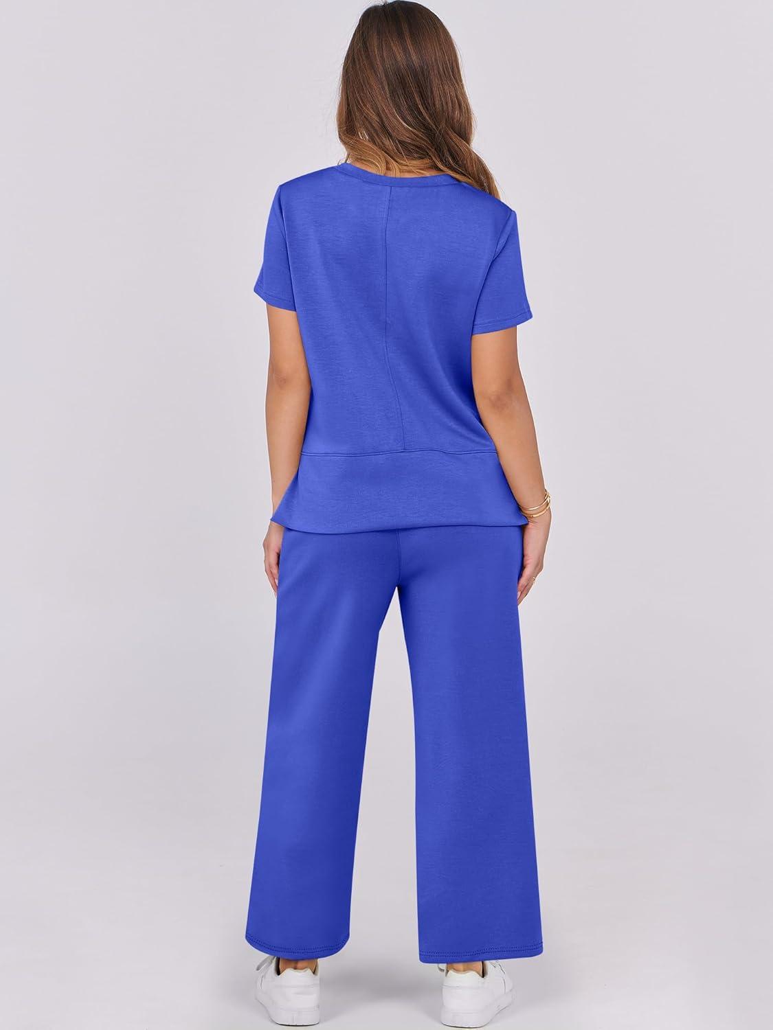 ANRABESS Women 2 Piece Lounge Sets Summer Travel Sweat Outfits Short Sleeve Wide Leg Casual Matching Tracksuits Clothes(Royal Blue)