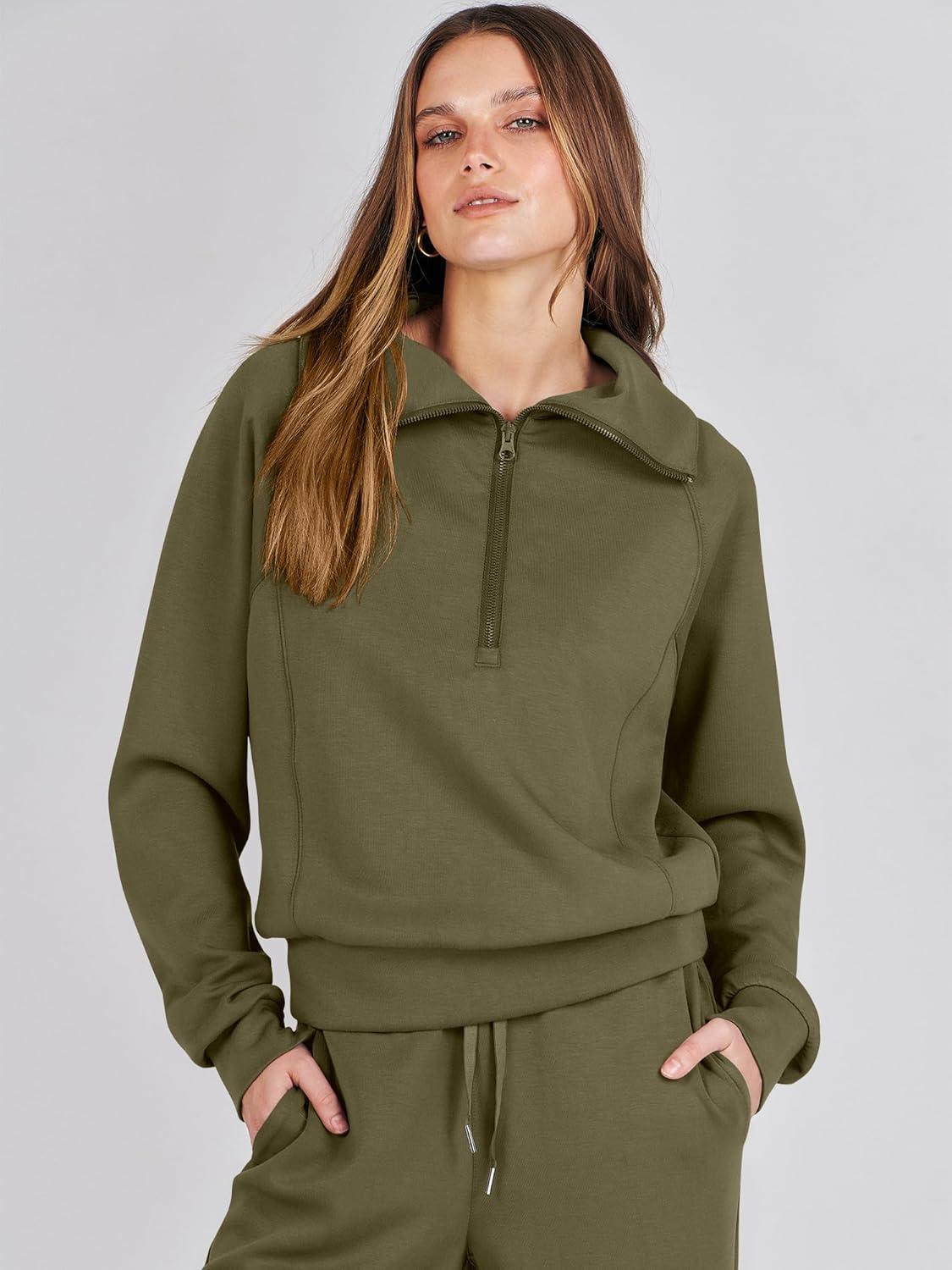 imageANRABESS Women 2 Piece Outfits 2025 Fall Fashion Airport Wide Leg Pants Lounge Set Leisure Travel Vacation Clothes SweatsuitsOlive