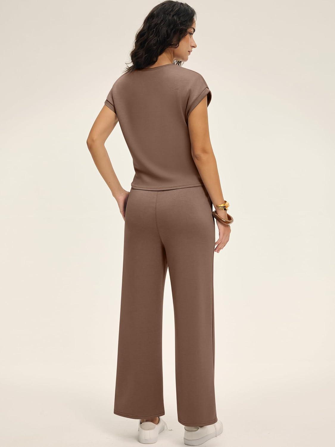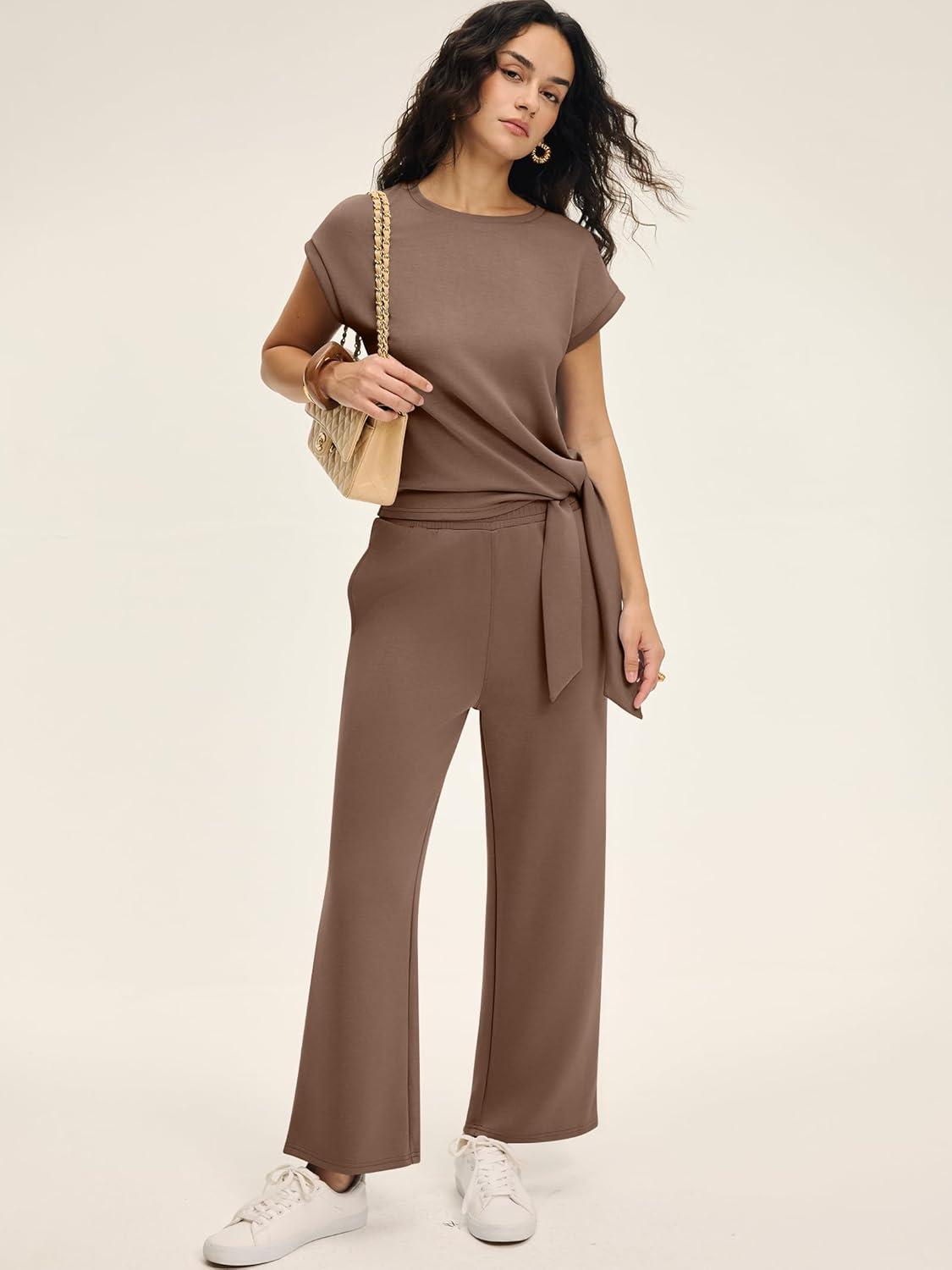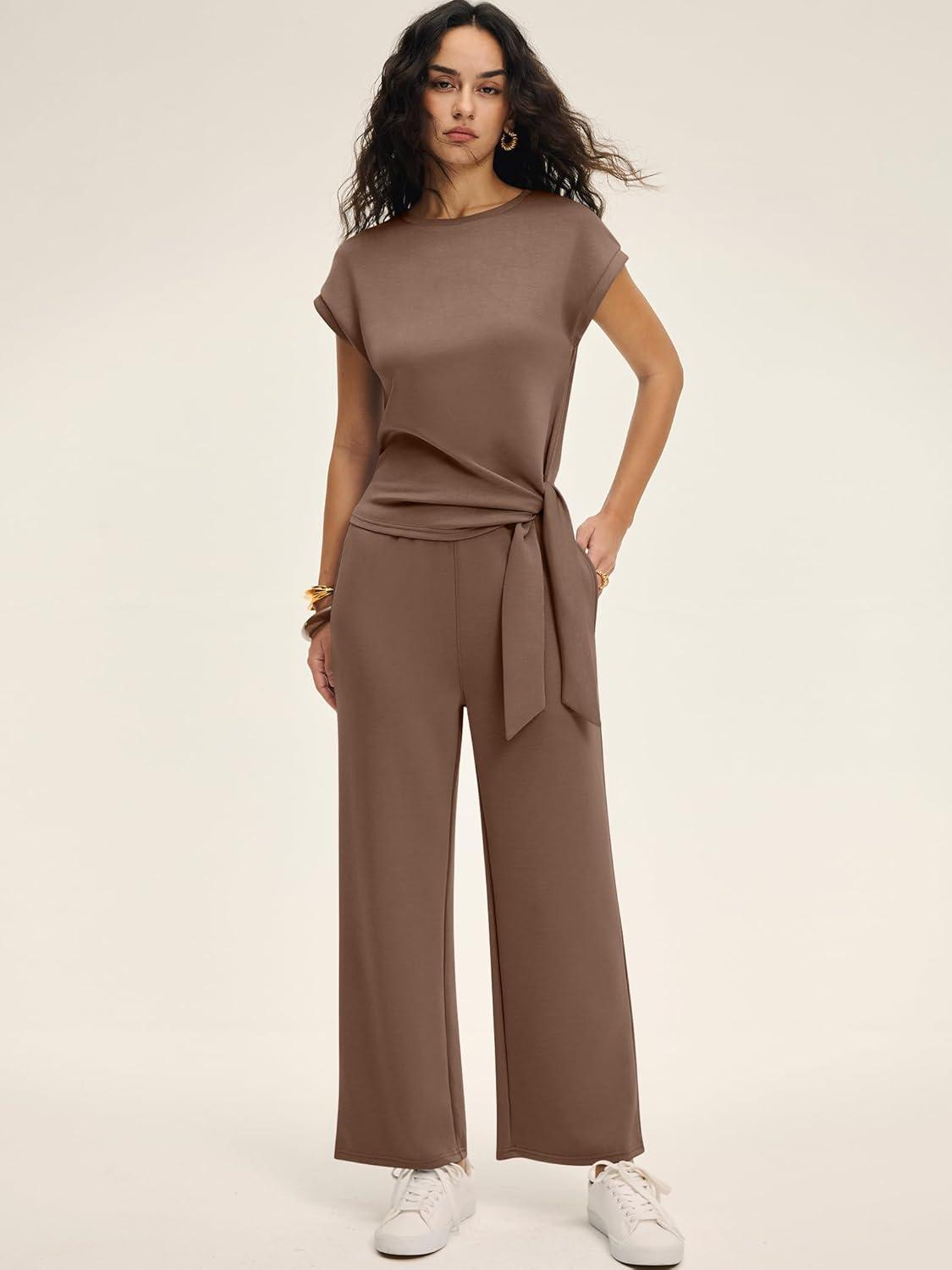 ANRABESS Women 2 Piece Outfits 2026 Summer Lounge Sets Cap Sleeve Tie Waisted Top Wide Leg Pant Airport Vacation Travel Sets(Brown)