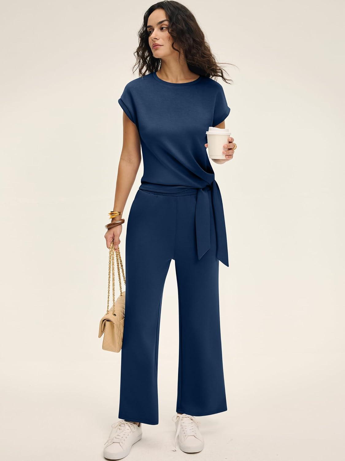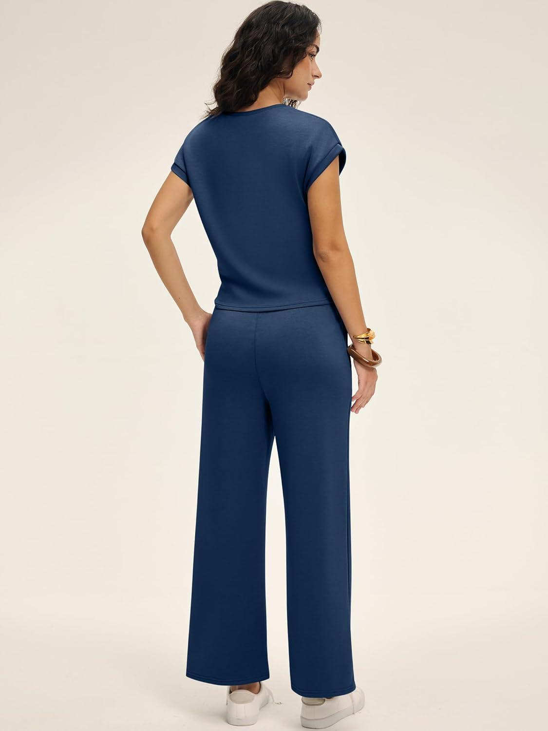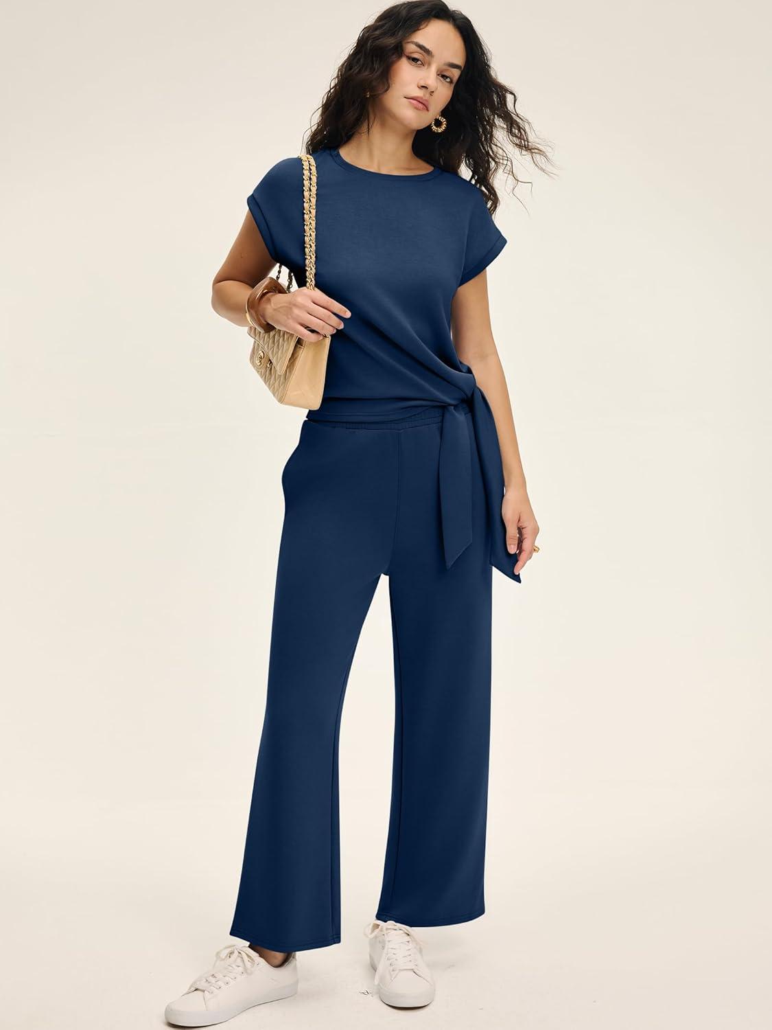 ANRABESS Women 2 Piece Outfits 2026 Summer Lounge Sets Cap Sleeve Tie Waisted Top Wide Leg Pant Airport Vacation Travel Sets(Navy Blue)