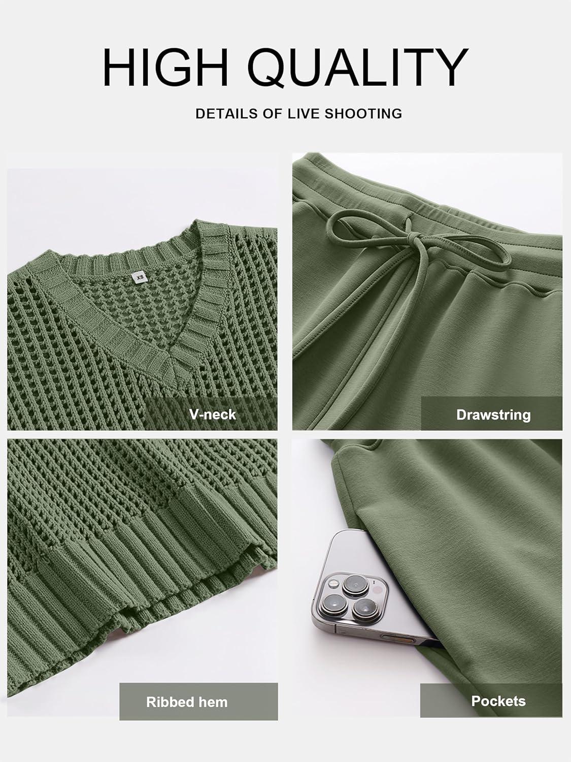 imageANRABESS Women 2 Piece Outfits Summer Lounge Sets Crochet Knit Sweater Vest Wide Leg Pants Casual Beach Vacation ClothesArmy Green