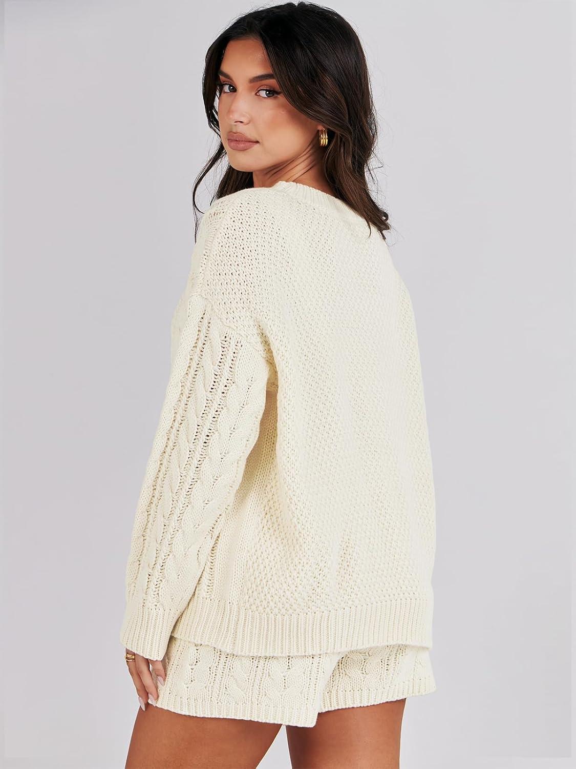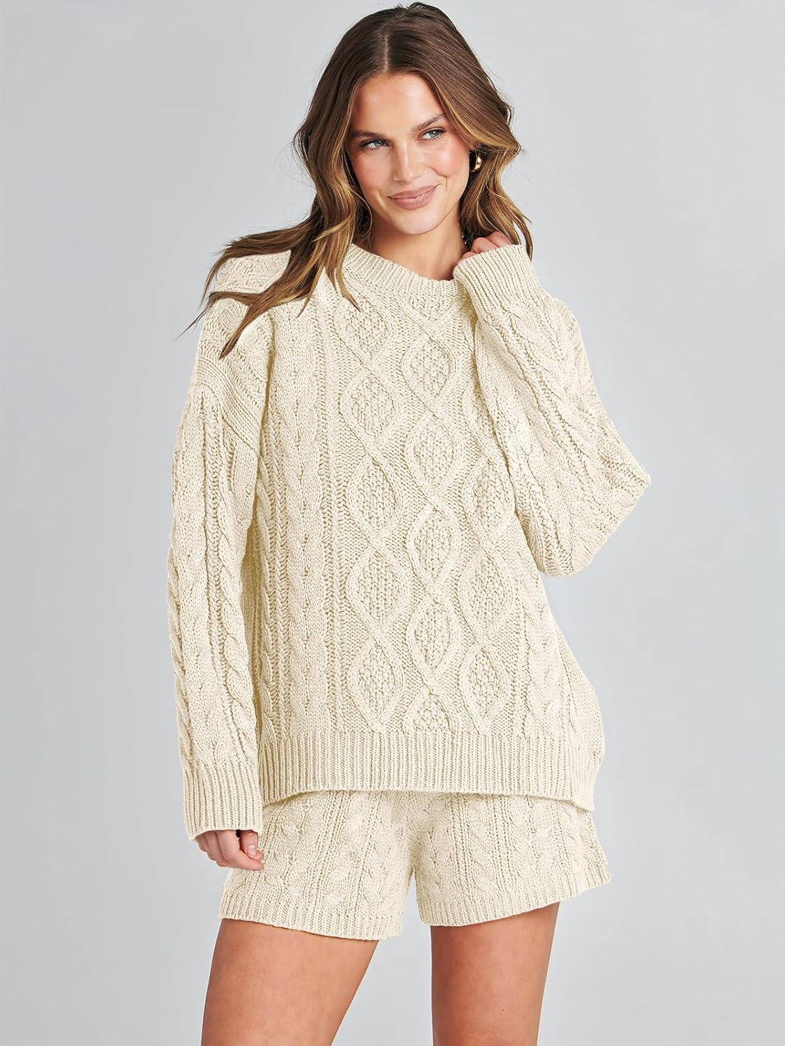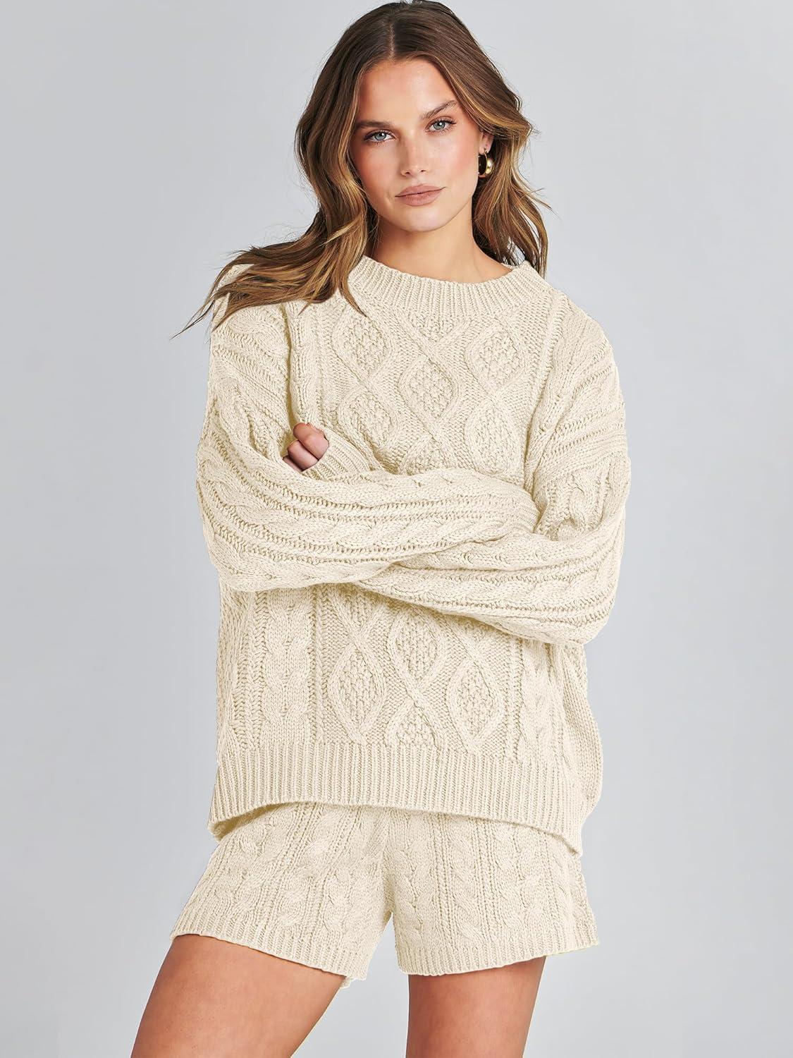 ANRABESS Women 2 Piece Outfits Sweater Lounge Loungewear Sets 2025 Winter Cable Knit Oversized Sweaters Shorts Matching Sets(Beige)
