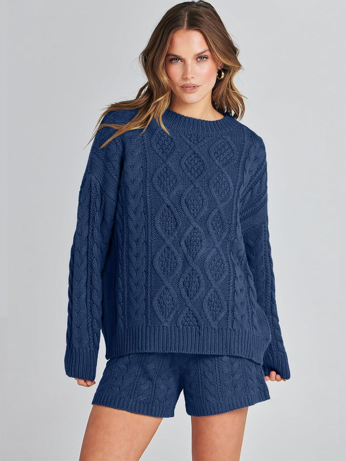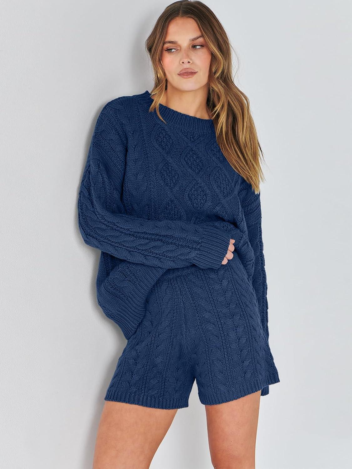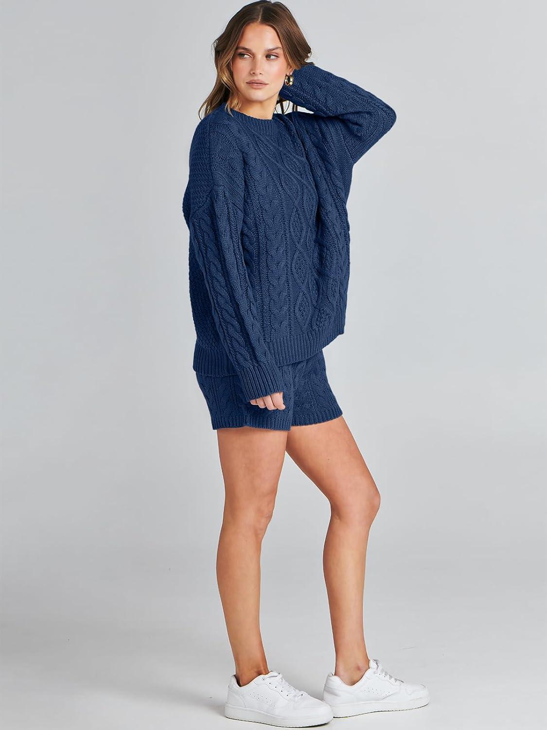 ANRABESS Women 2 Piece Outfits Sweater Lounge Loungewear Sets 2025 Winter Cable Knit Oversized Sweaters Shorts Matching Sets(Navy Blue)