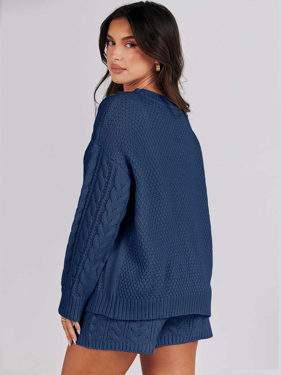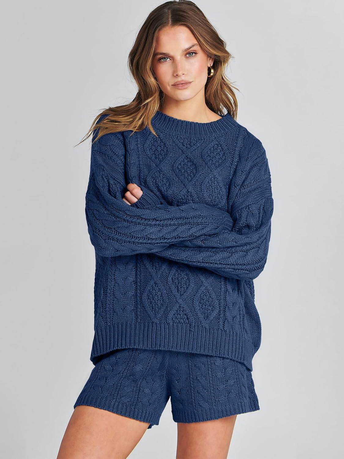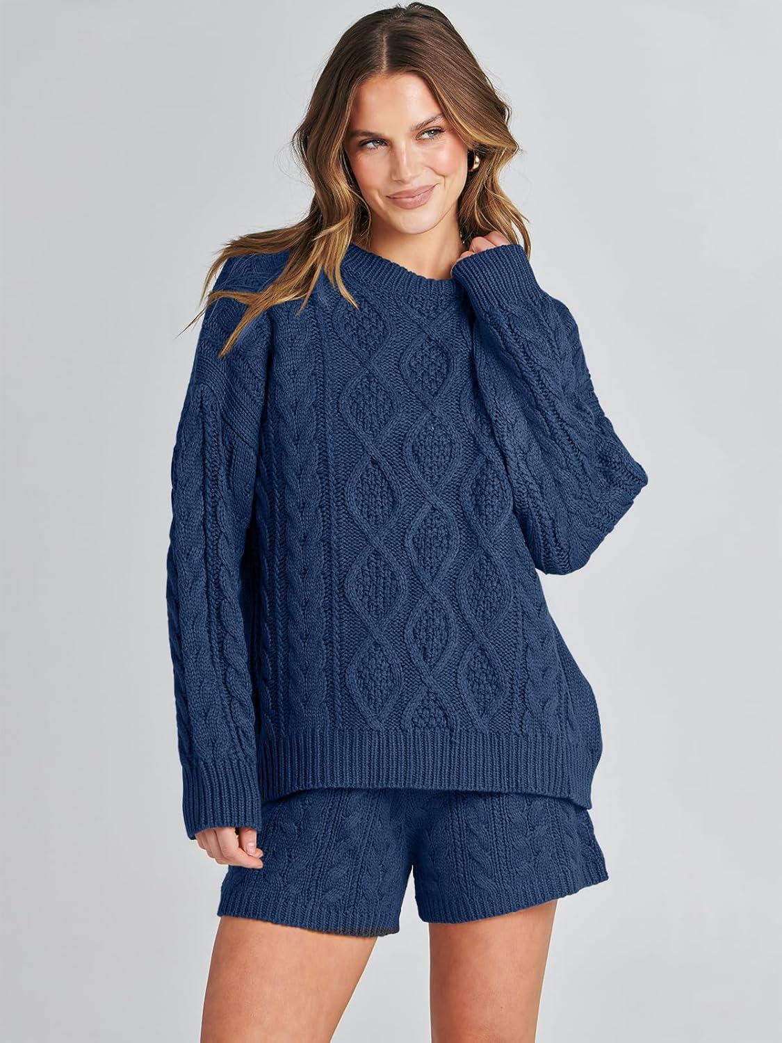 ANRABESS Women 2 Piece Outfits Sweater Lounge Loungewear Sets 2025 Winter Cable Knit Oversized Sweaters Shorts Matching Sets(Navy Blue)