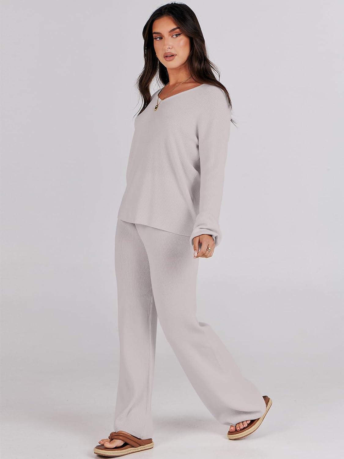 ANRABESS Women 2 Piece Outfits Sweater Lounge Sets Long Sleeve Cable Knit Pullover and Wide Leg Pants Tracksuit Matching Set(Grey)