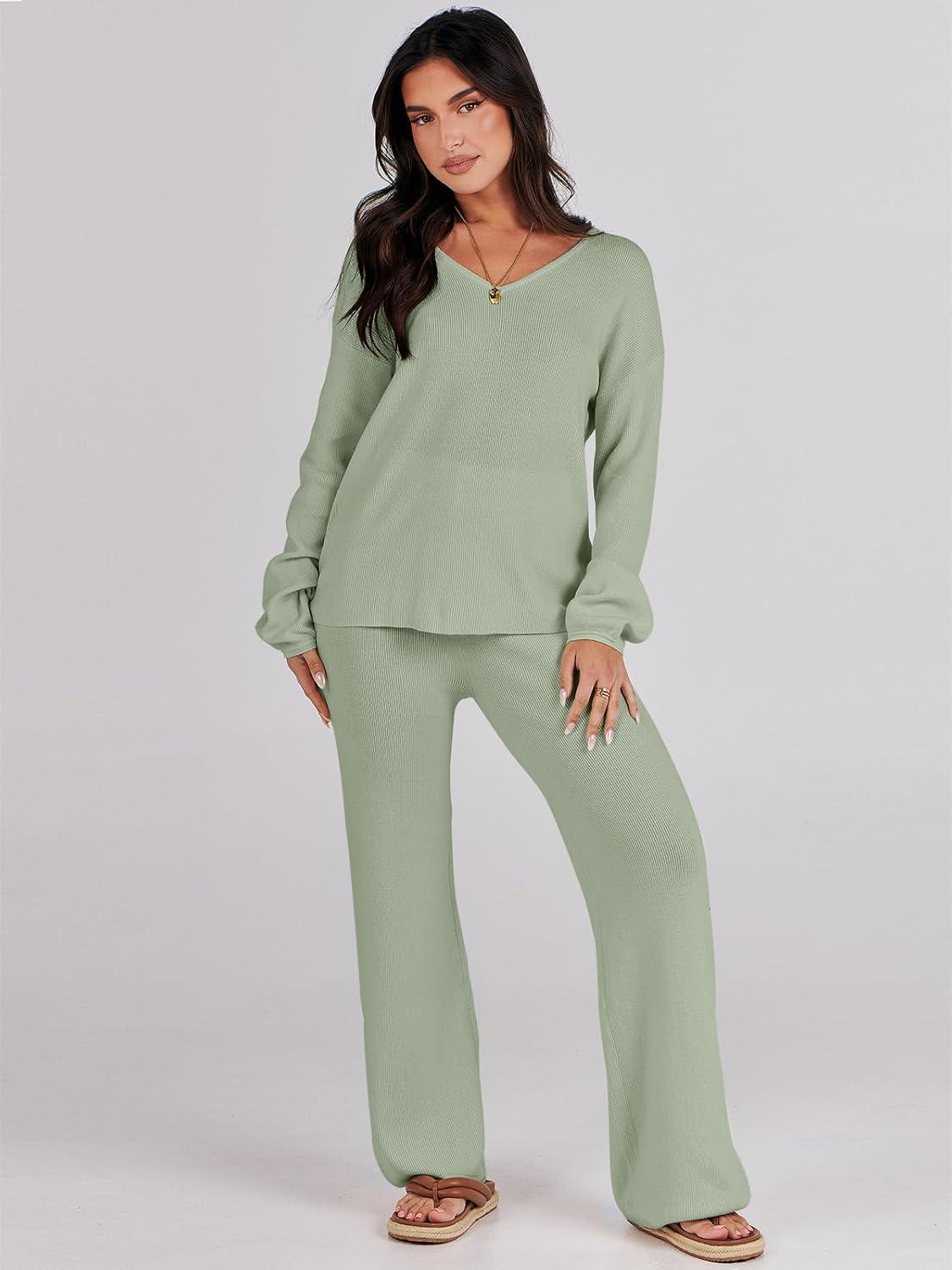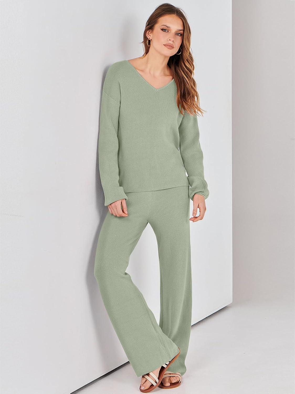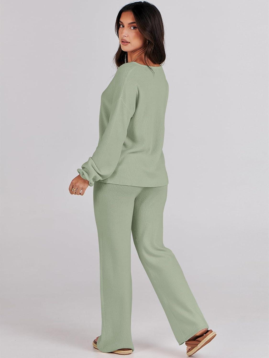 ANRABESS Women 2 Piece Outfits Sweater Lounge Sets Long Sleeve Cable Knit Pullover and Wide Leg Pants Tracksuit Matching Set(Mint Green)