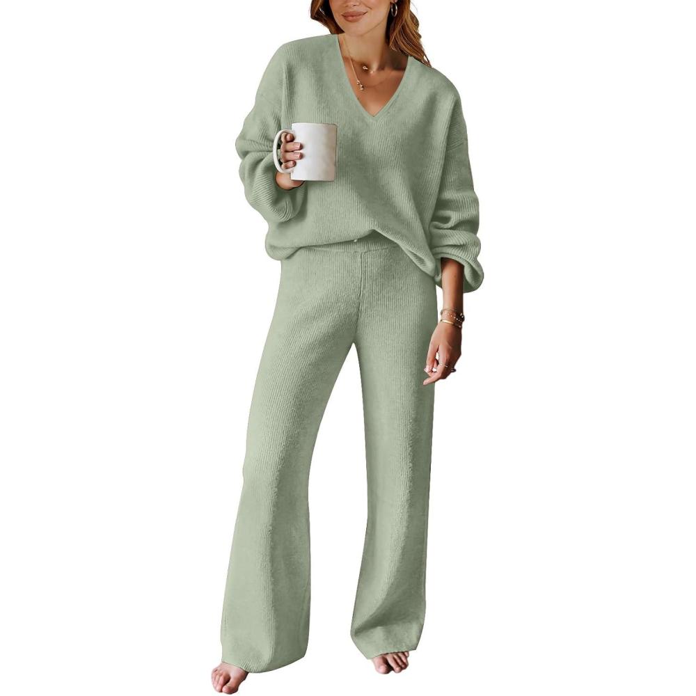 imageANRABESS Women 2 Piece Outfits Sweater Lounge Sets Long Sleeve Cable Knit Pullover and Wide Leg Pants Tracksuit Matching SetMint Green