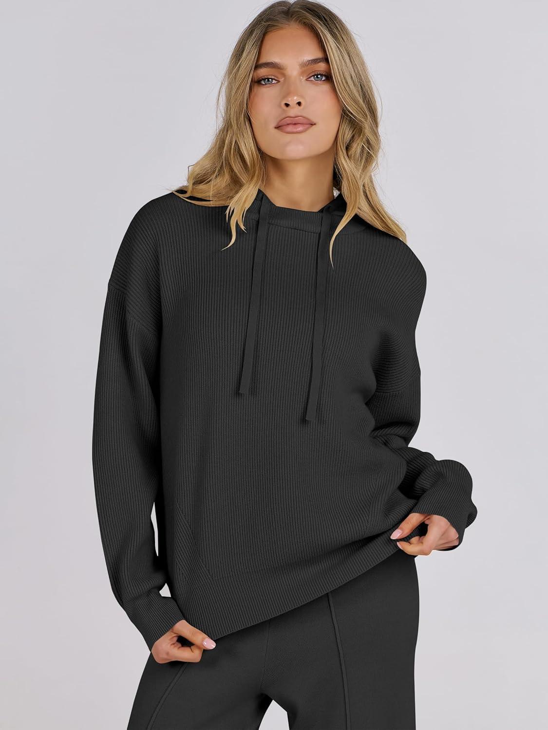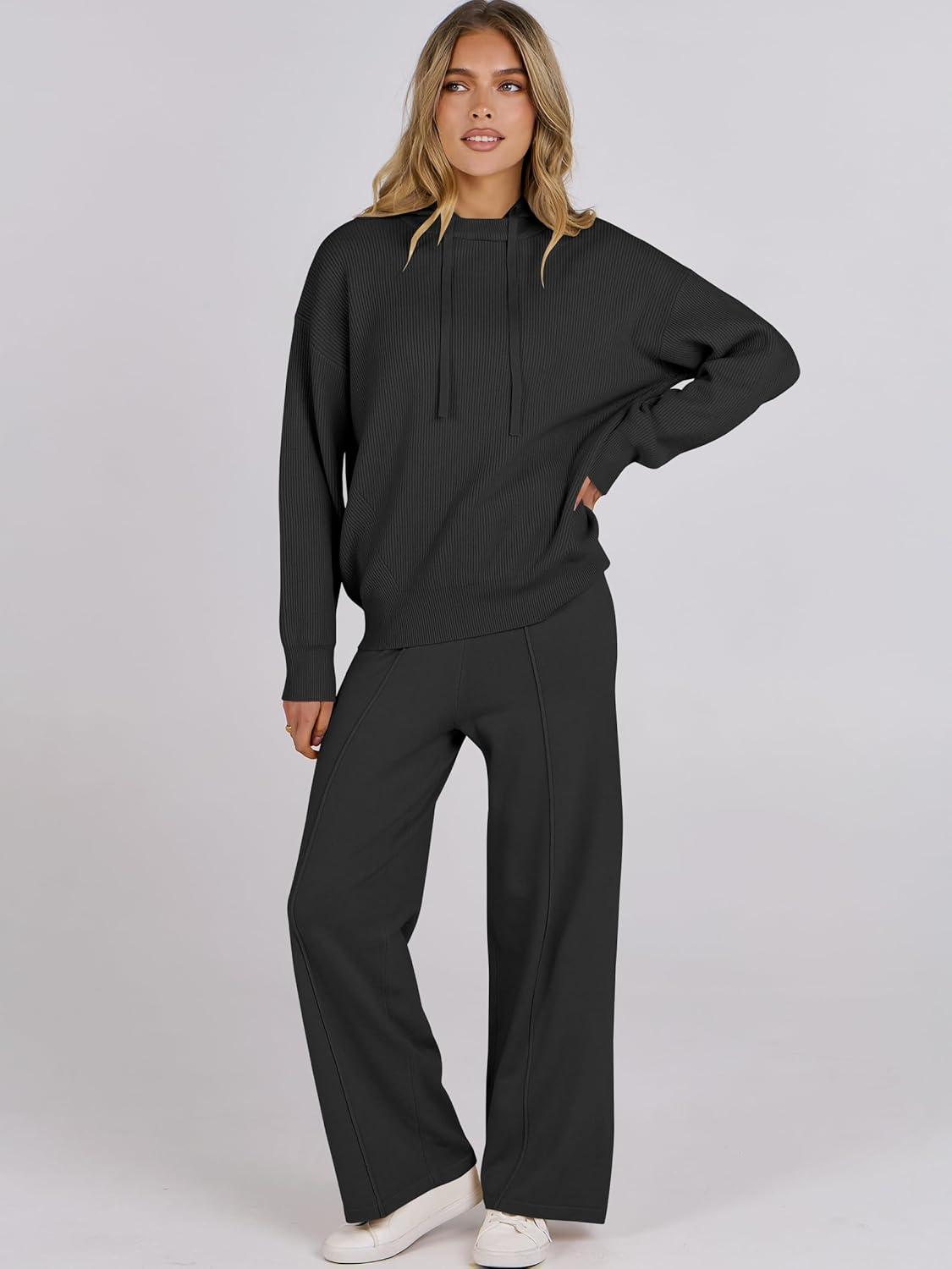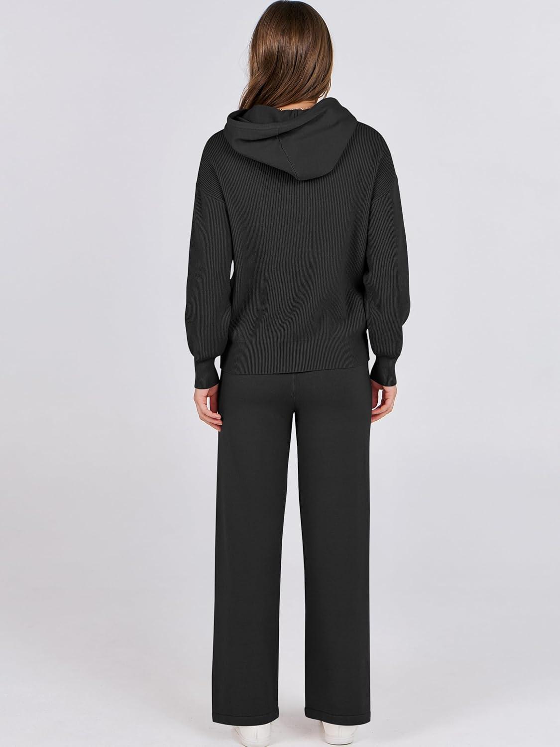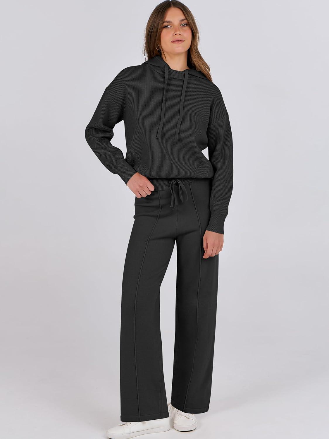 ANRABESS Women 2 Piece Outfits Sweater Sets Loose Long Sleeve Hoodies Knit Pullover Wide Leg Pants 2025 Fall Lounge Sweatsuit(Black)