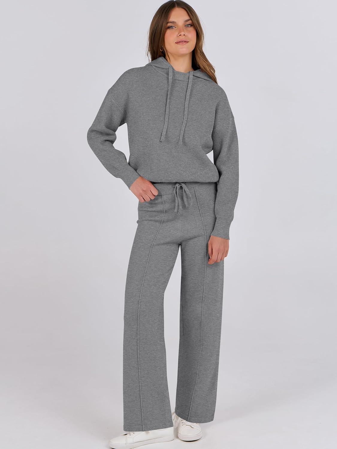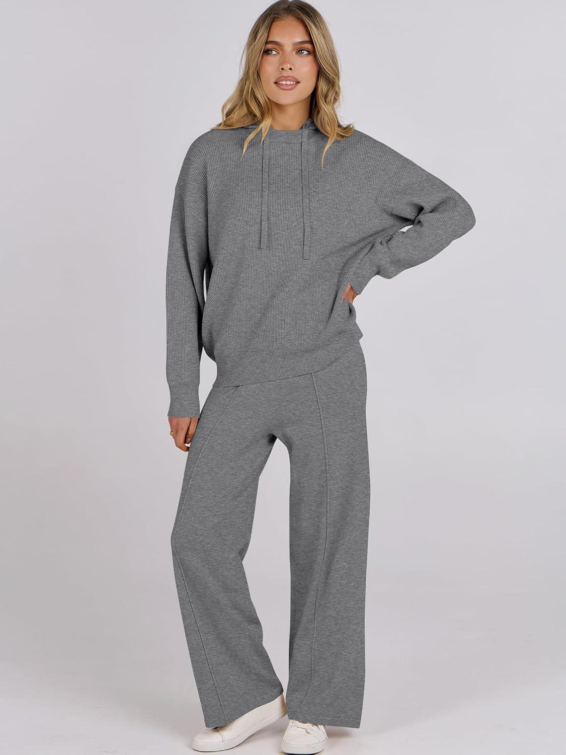 ANRABESS Women 2 Piece Outfits Sweater Sets Loose Long Sleeve Hoodies Knit Pullover Wide Leg Pants 2025 Fall Lounge Sweatsuit(Dark Gray)