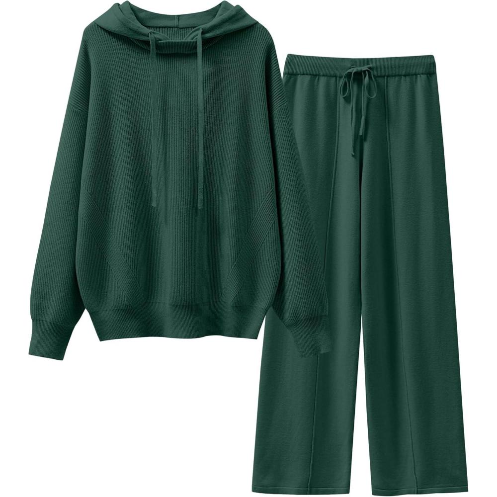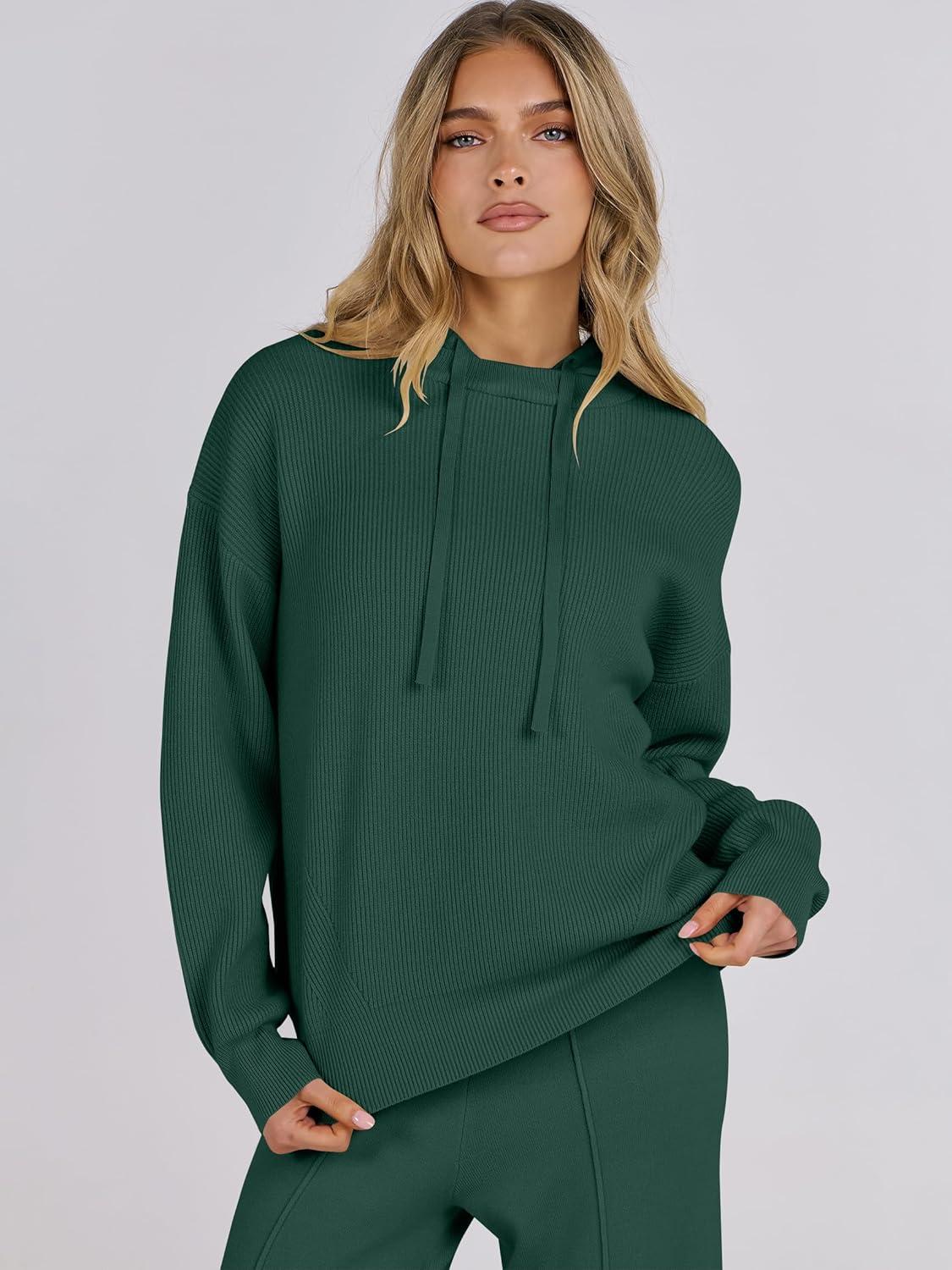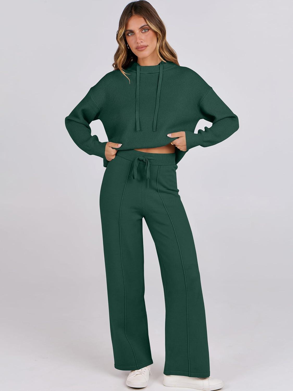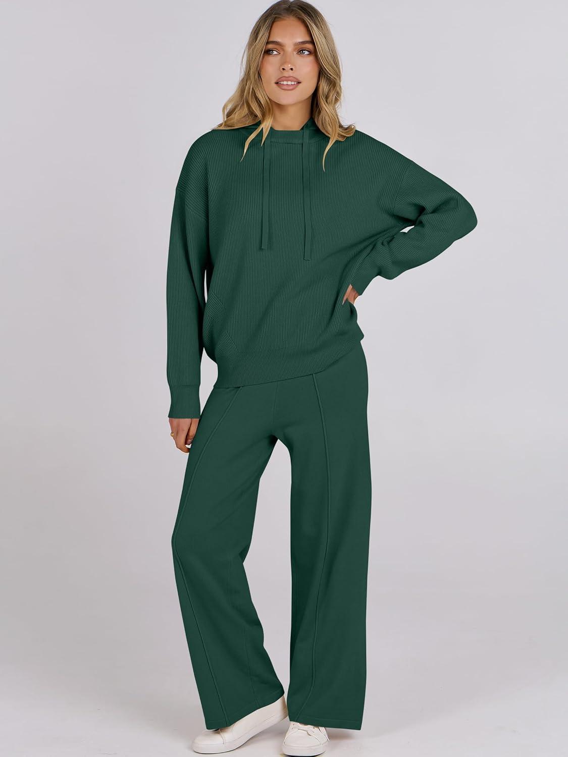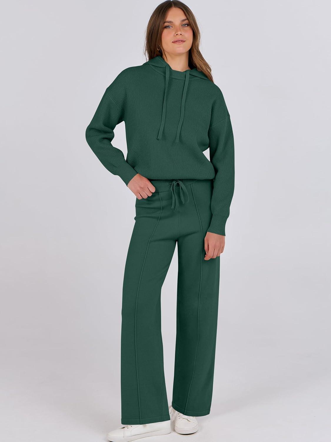 ANRABESS Women 2 Piece Outfits Sweater Sets Loose Long Sleeve Hoodies Knit Pullover Wide Leg Pants 2025 Fall Lounge Sweatsuit(Deep Green)