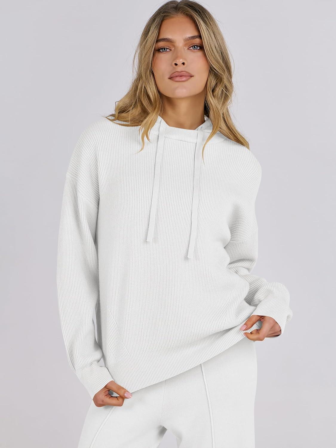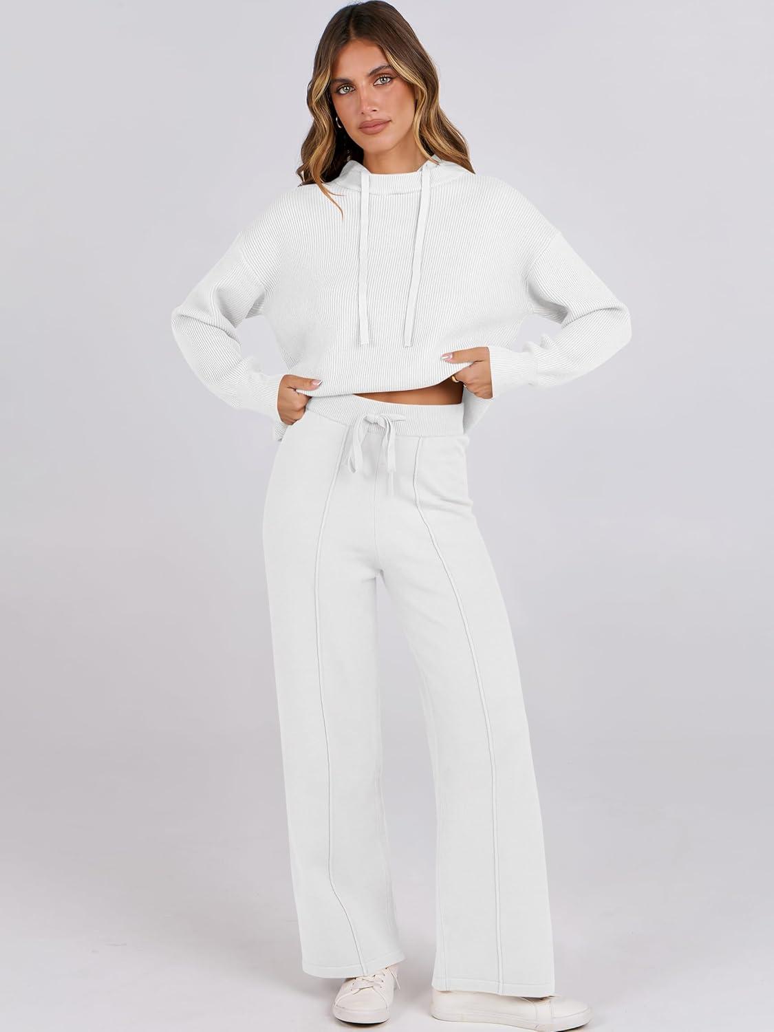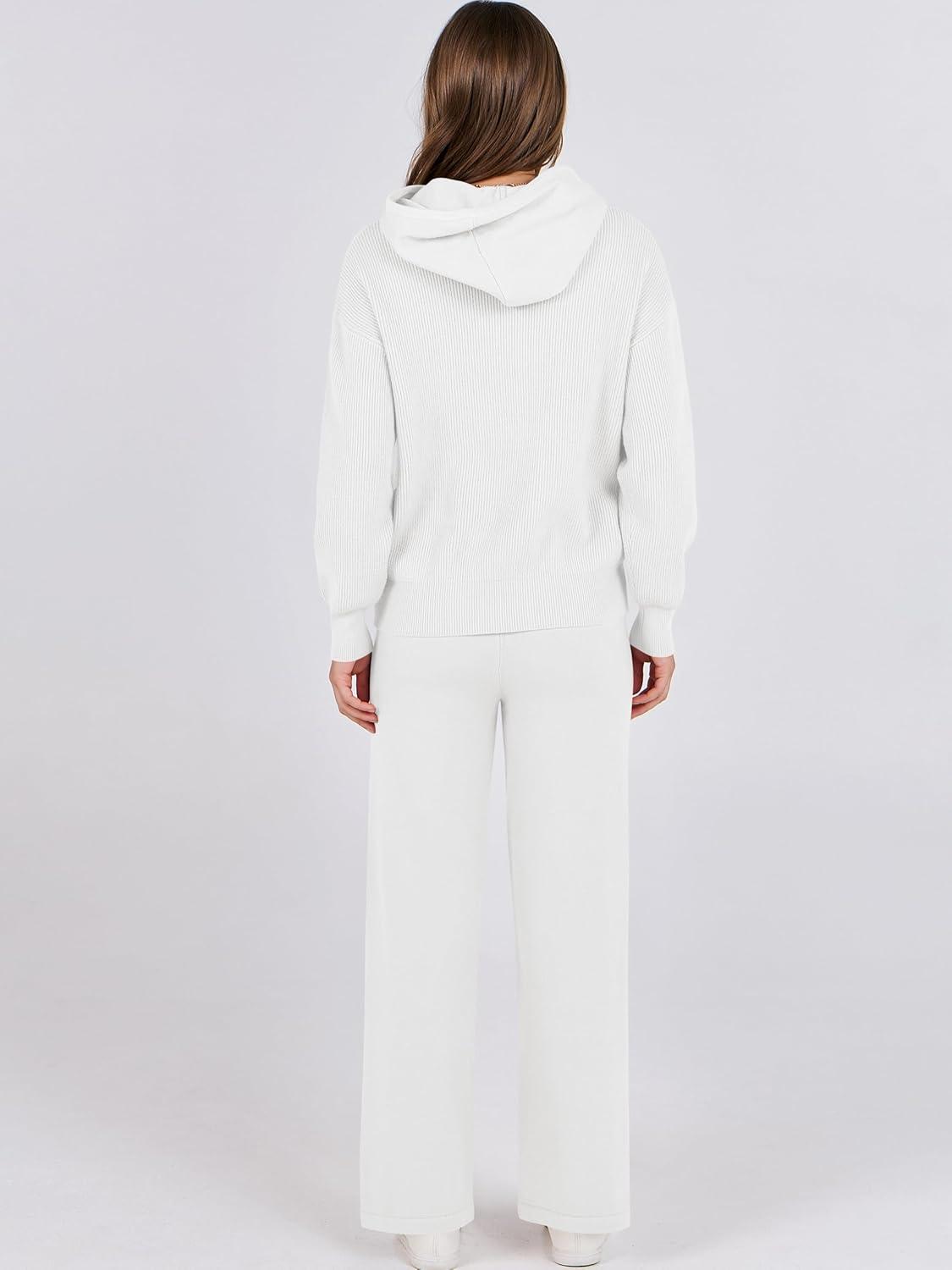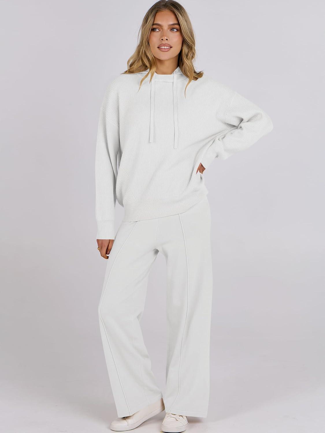 ANRABESS Women 2 Piece Outfits Sweater Sets Loose Long Sleeve Hoodies Knit Pullover Wide Leg Pants 2025 Fall Lounge Sweatsuit(White)